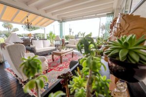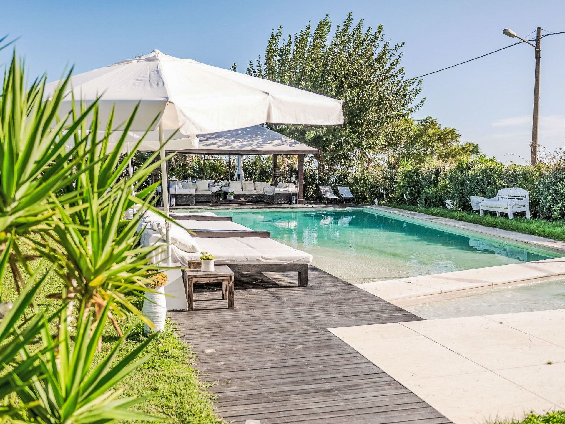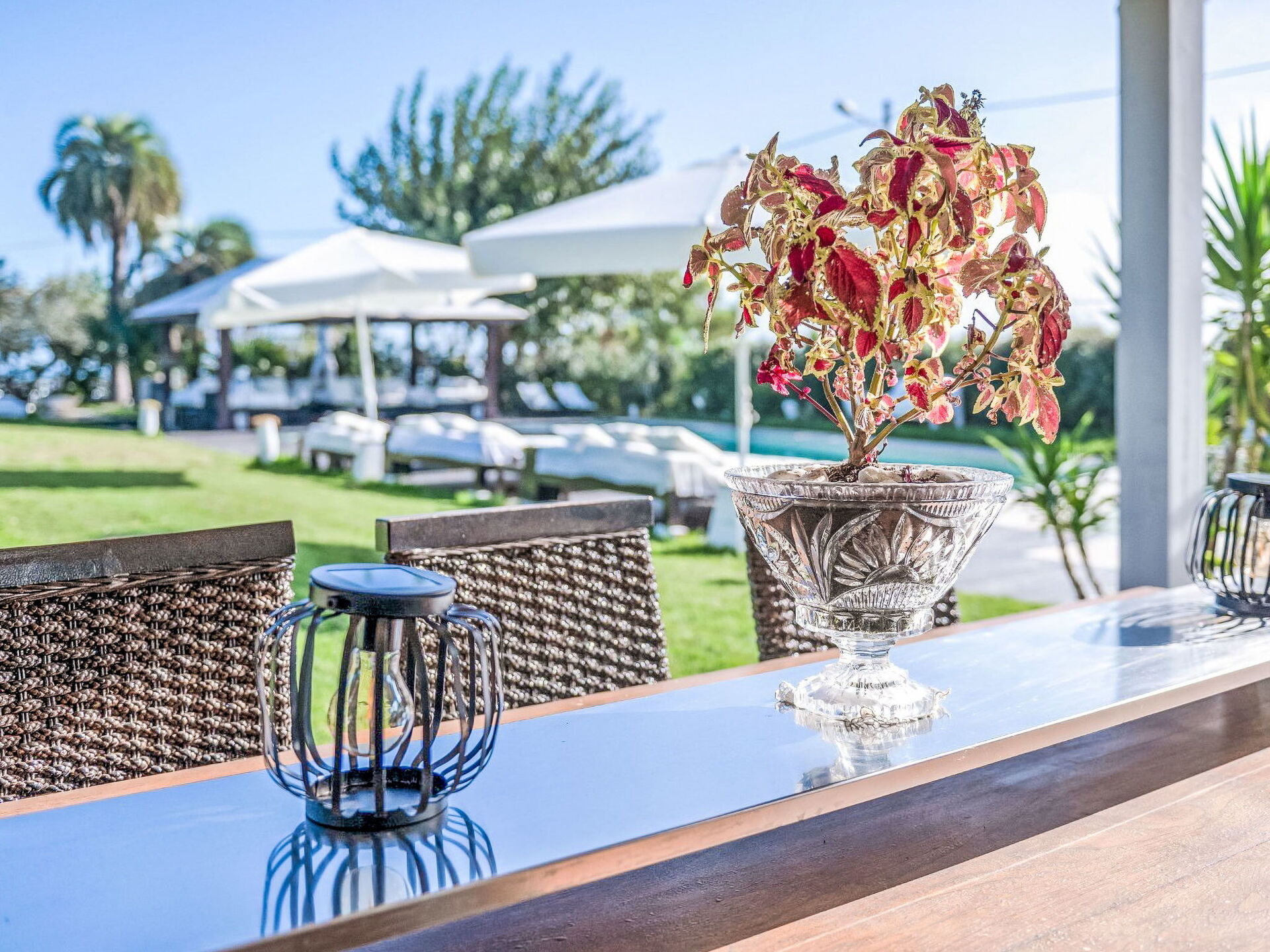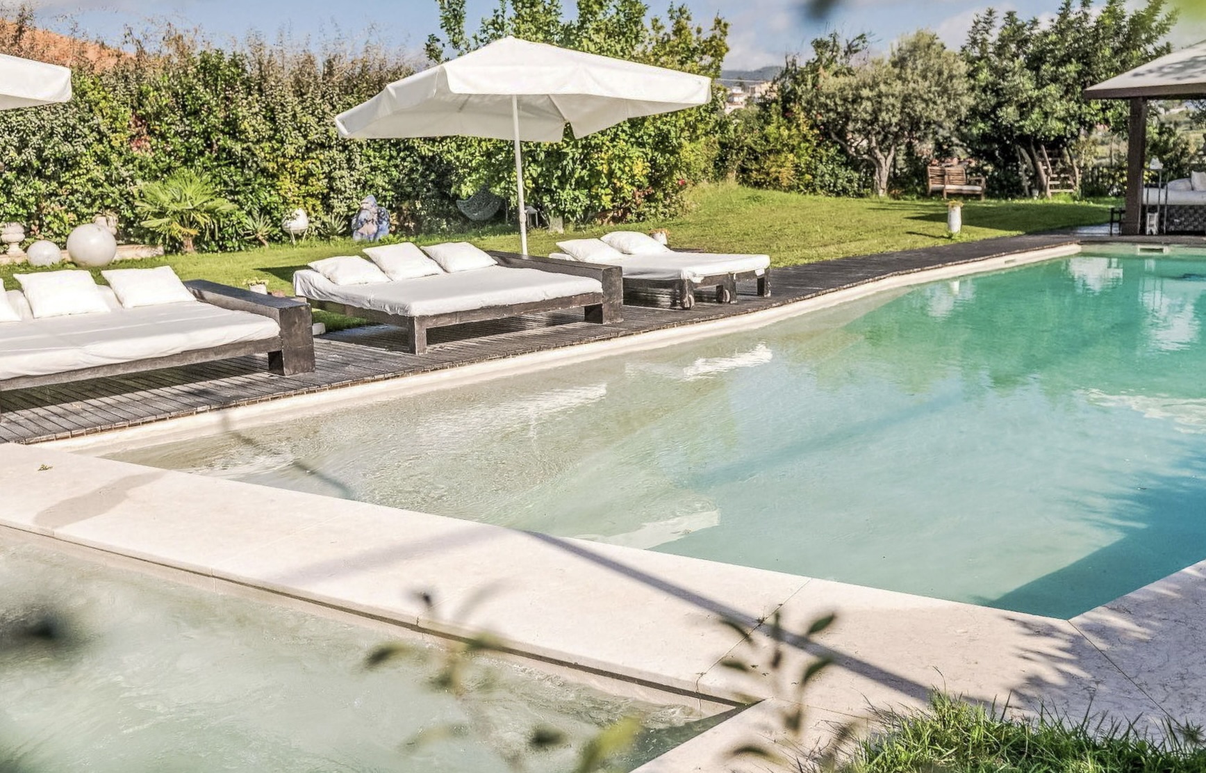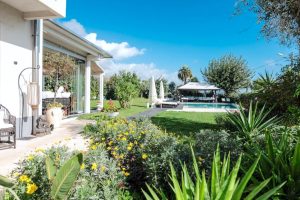 Aan de villa, met uitzicht op de tuin, is een patio gemaakt. Een fijne, overdekte ruimte om bijvoorbeeld van een dagelijks ontbijt te genieten, dat desgewenst door de eigenaars wordt verzorgd. In de tuin zit het ruimbemeten zwembad dat ook een jacuzzi- gedeelte heeft. Naast het zonneterras met de nodige ligbedden en parasols is een overdekt terras met loungebank gemaakt.