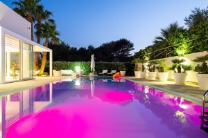 omheinde tuin van 600 m2, met overdekt terras bij het huis met eettafel en zithoek. Overdekt loungeterras in de tuin, zonneterras rond het zwembad. Via een buitentrap bereikbaar dakterras met bar, ligstoelen.