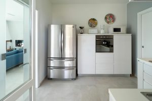 met koelkast (2) met vriesvak, oven, magnetron, vaatwasser, wasmachine, toaster, percolator, waterkoker,