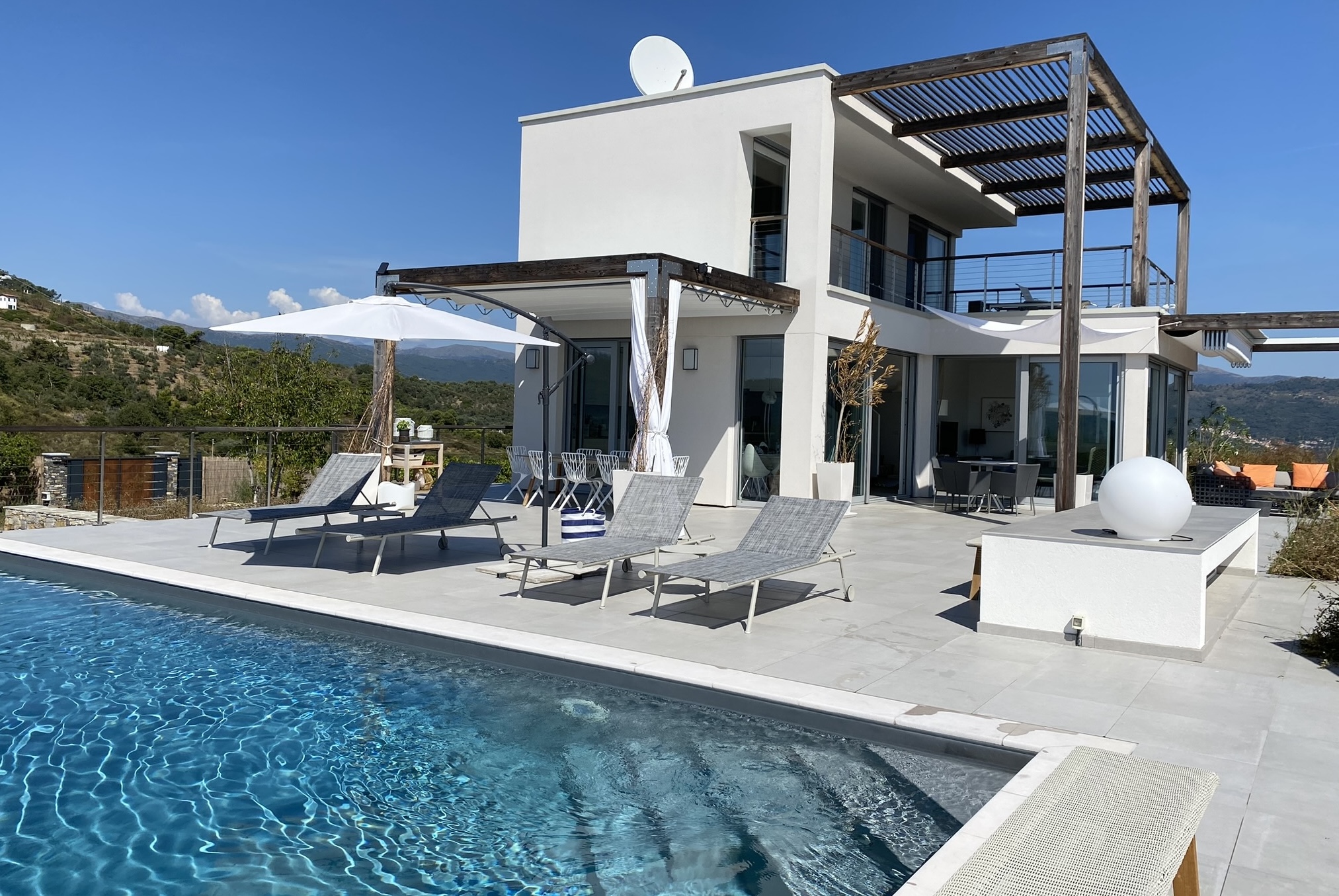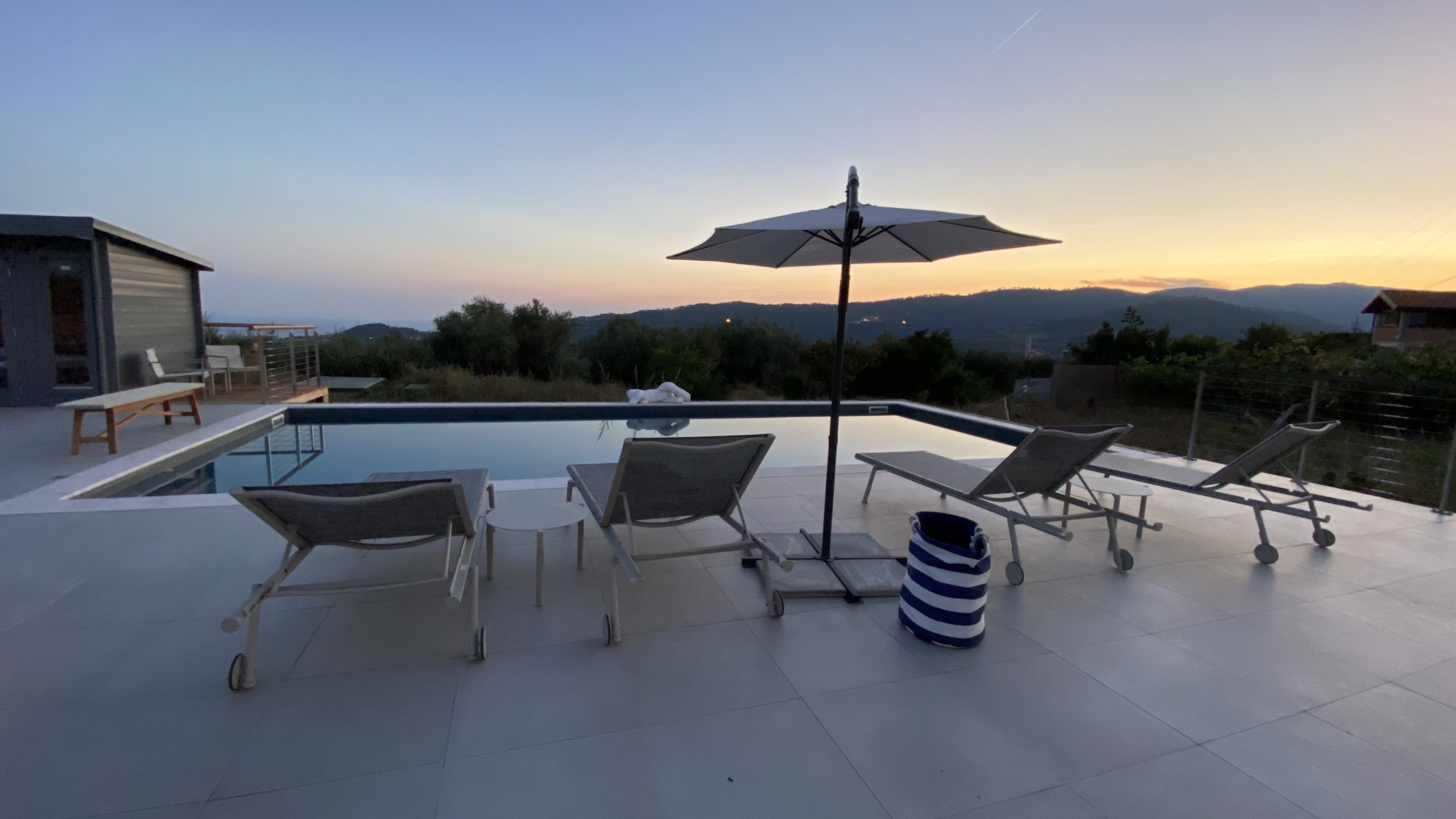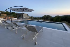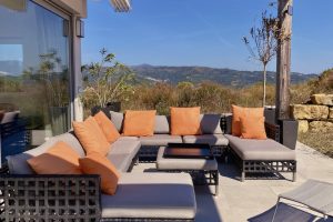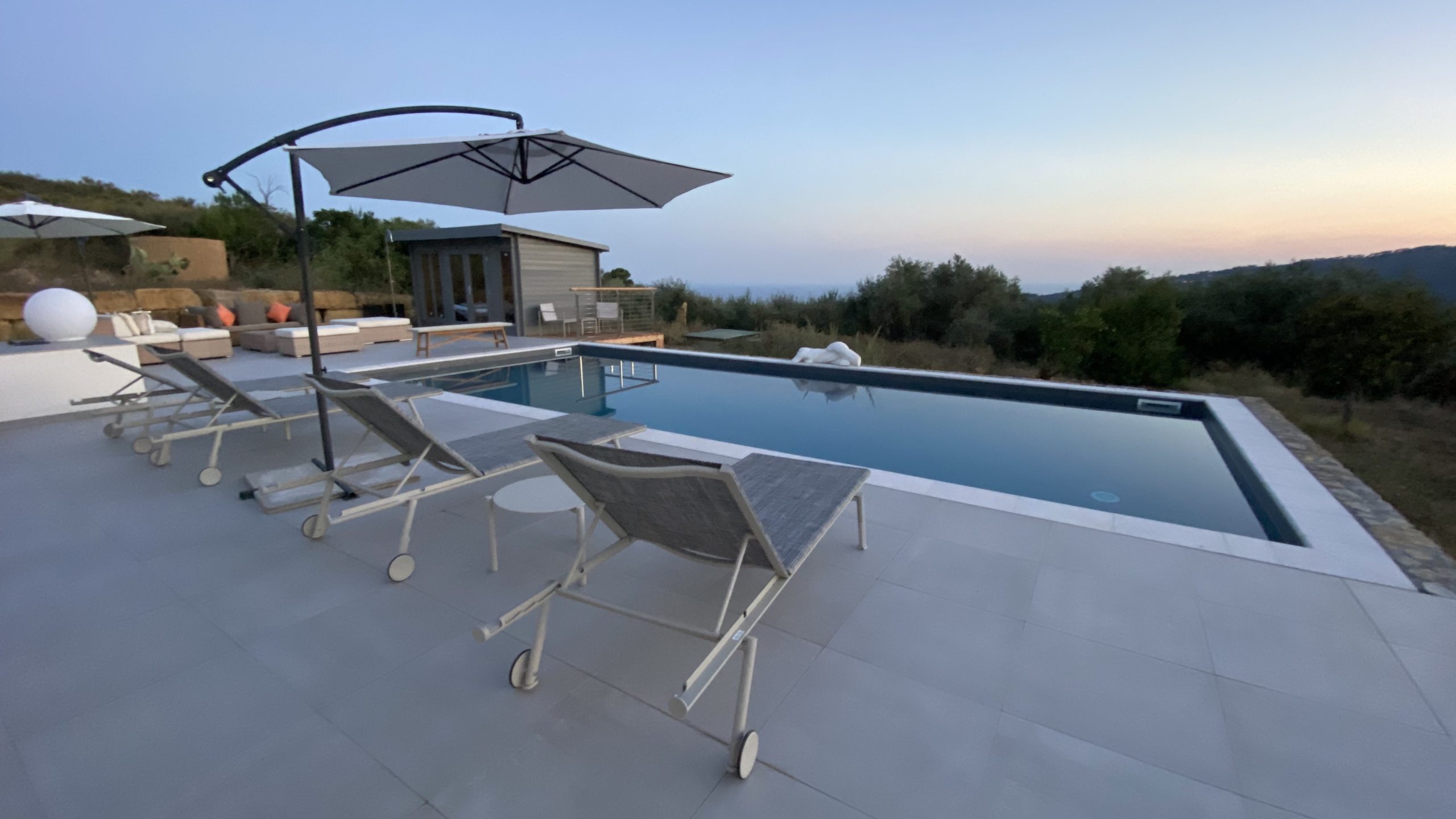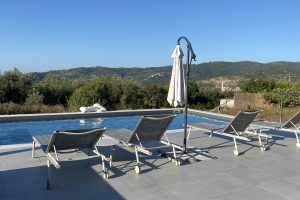 Onder het overdekte terras buiten is een tweede eettafel neergezet, waarmee je er ook voor kunt kiezen buiten te eten. Omwille van de verhoogde ligging van de villa, waait er ook ’s zomers een lekker briesje waarmee het buiten goed uit te houden is. Naast een overdekt lougeterras voor de woonkamer, is er een tweede loungeterras bij het zwembad gemaakt. Daar staan ook de nodige ligbedden met parasols, om van de zon te genieten. In het poolhuis staan de nodige lantarens en comfortabele kussens om het terras verder aan te kleden.