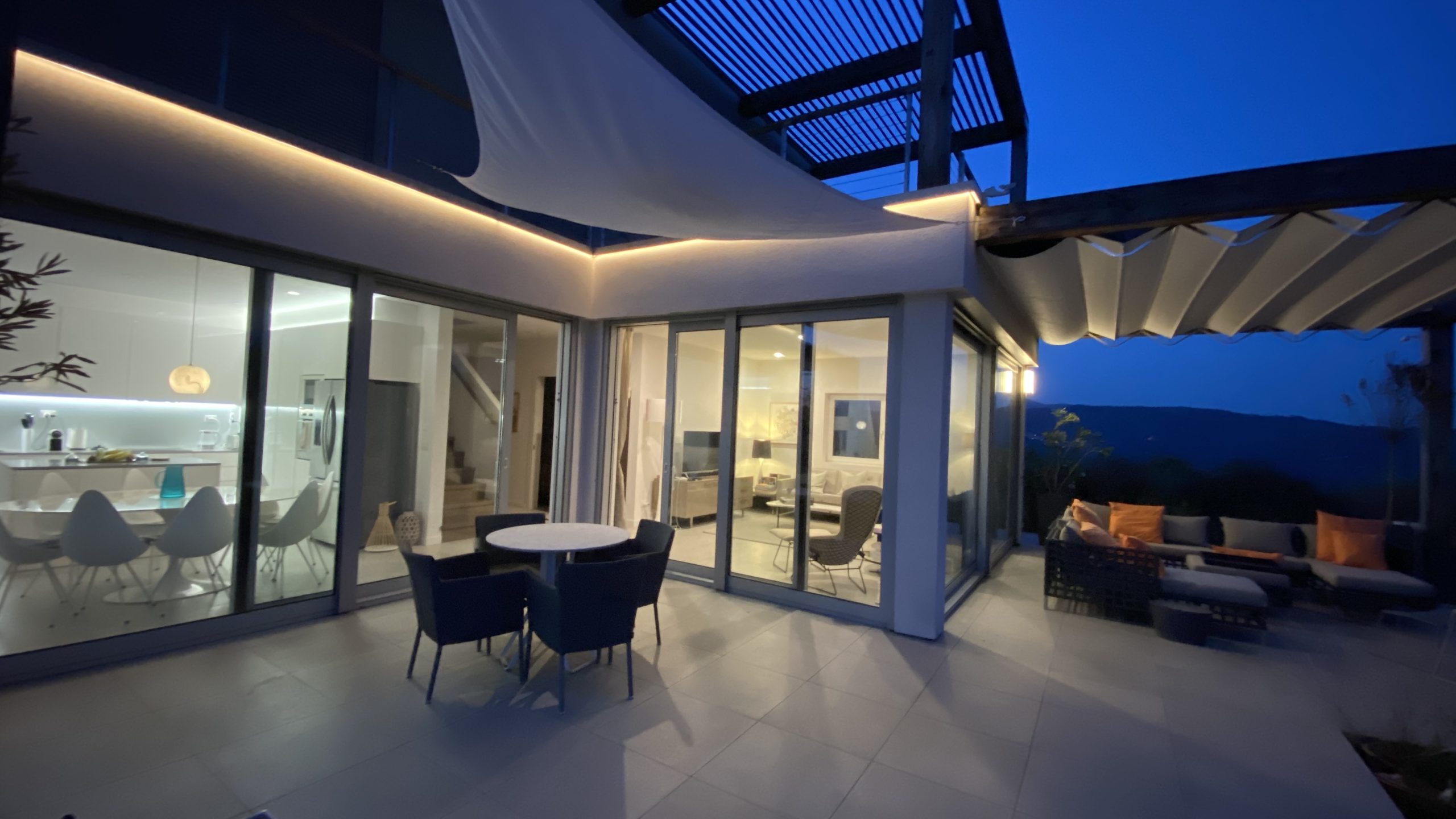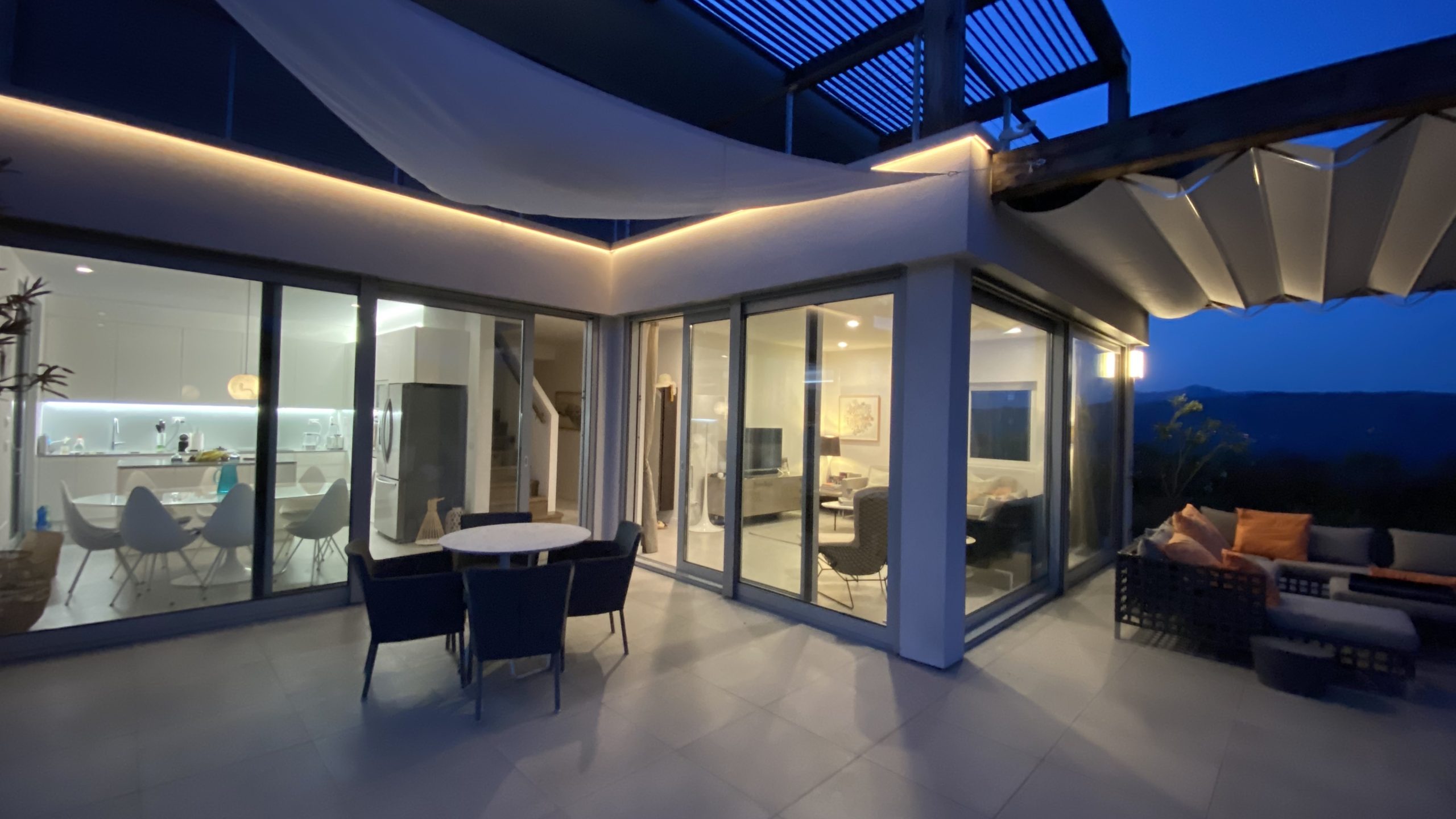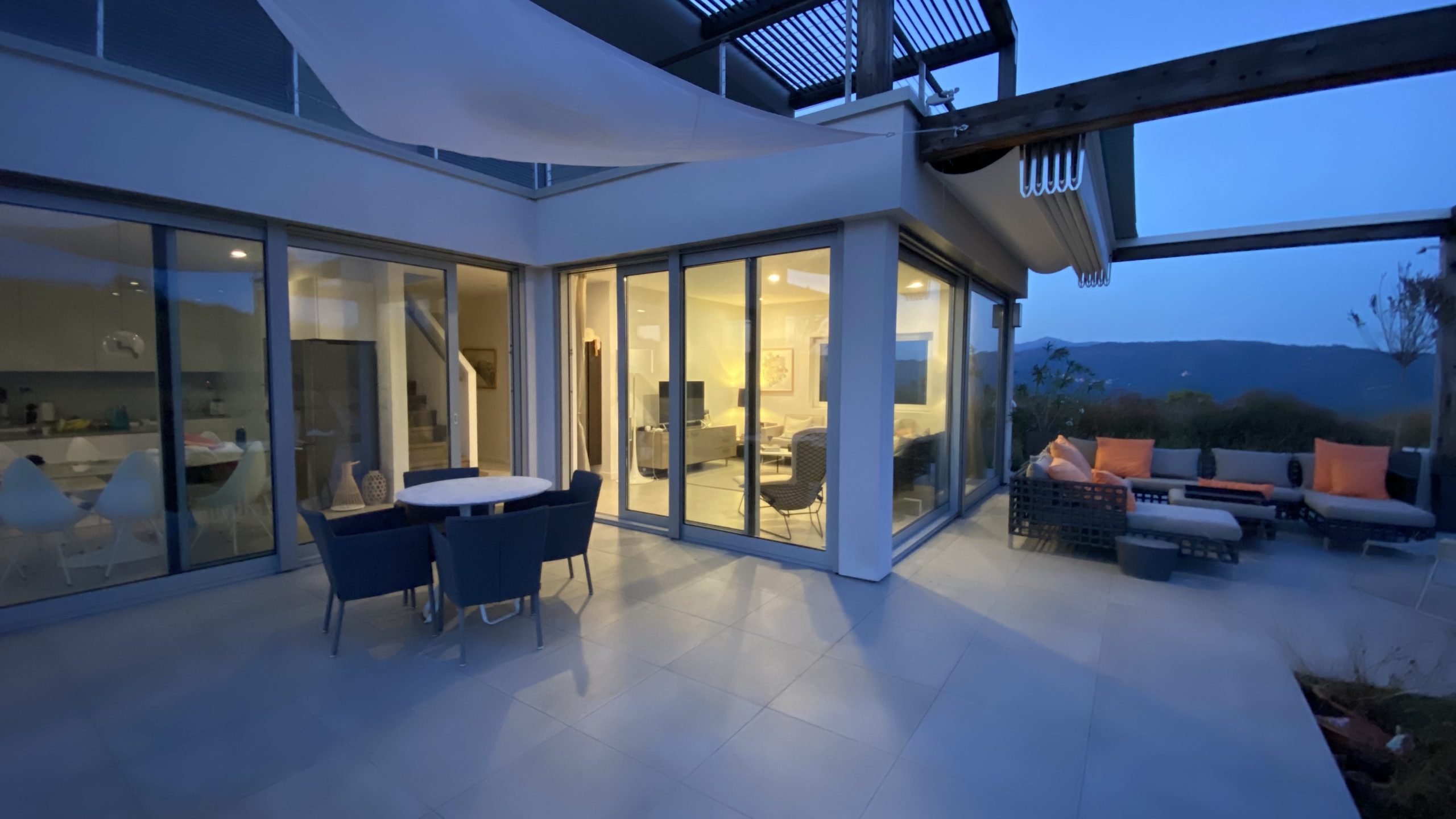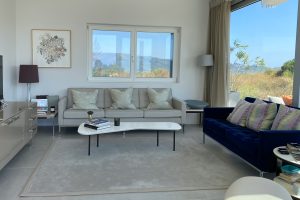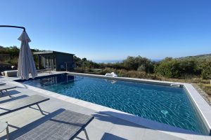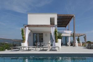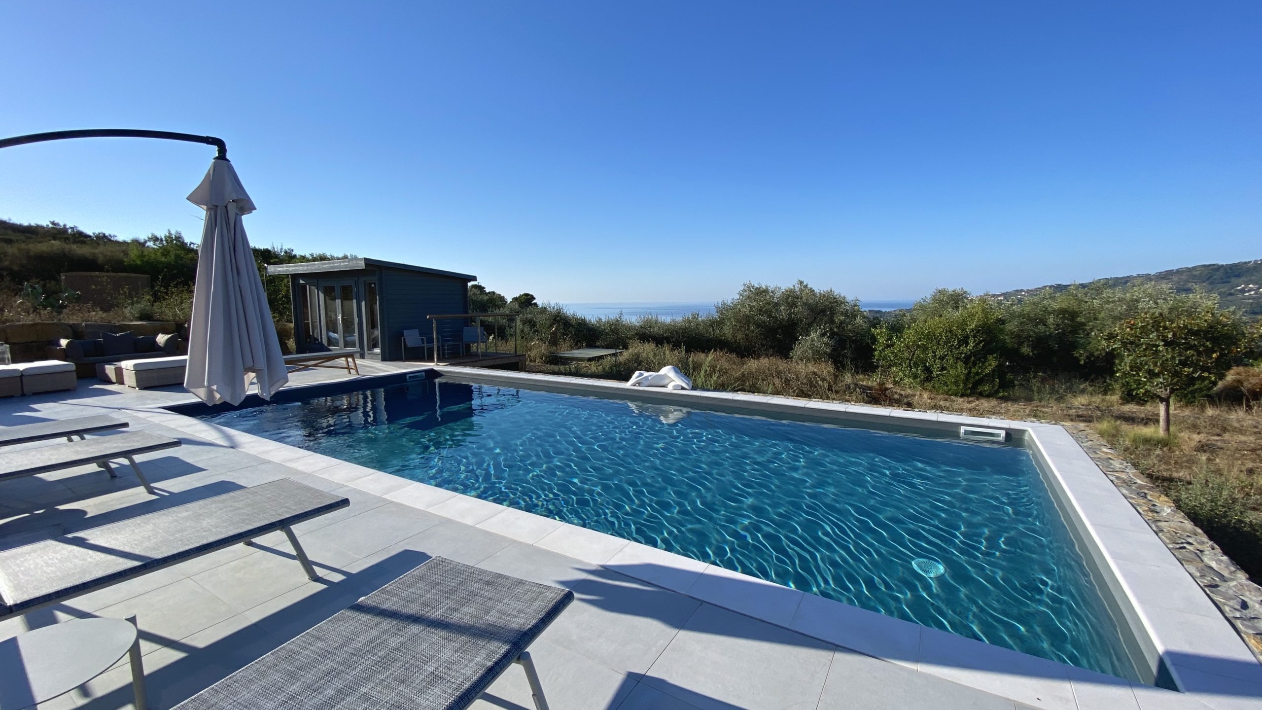 Onder het overdekte terras buiten is een tweede eettafel neergezet, waarmee je er ook voor kunt kiezen buiten te eten. Omwille van de verhoogde ligging van de villa, waait er ook ’s zomers een lekker briesje waarmee het buiten goed uit te houden is. Naast een overdekt lougeterras voor de woonkamer, is er een tweede loungeterras bij het zwembad gemaakt. Daar staan ook de nodige ligbedden met parasols, om van de zon te genieten. In het poolhuis staan de nodige lantarens en comfortabele kussens om het terras verder aan te kleden.
