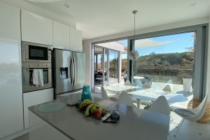 • zithoek met sat TV, wifi – open doorgang naar de woonkeuken met eettafel. grote schuifpuien naar het deels overdekte terras rond het huis