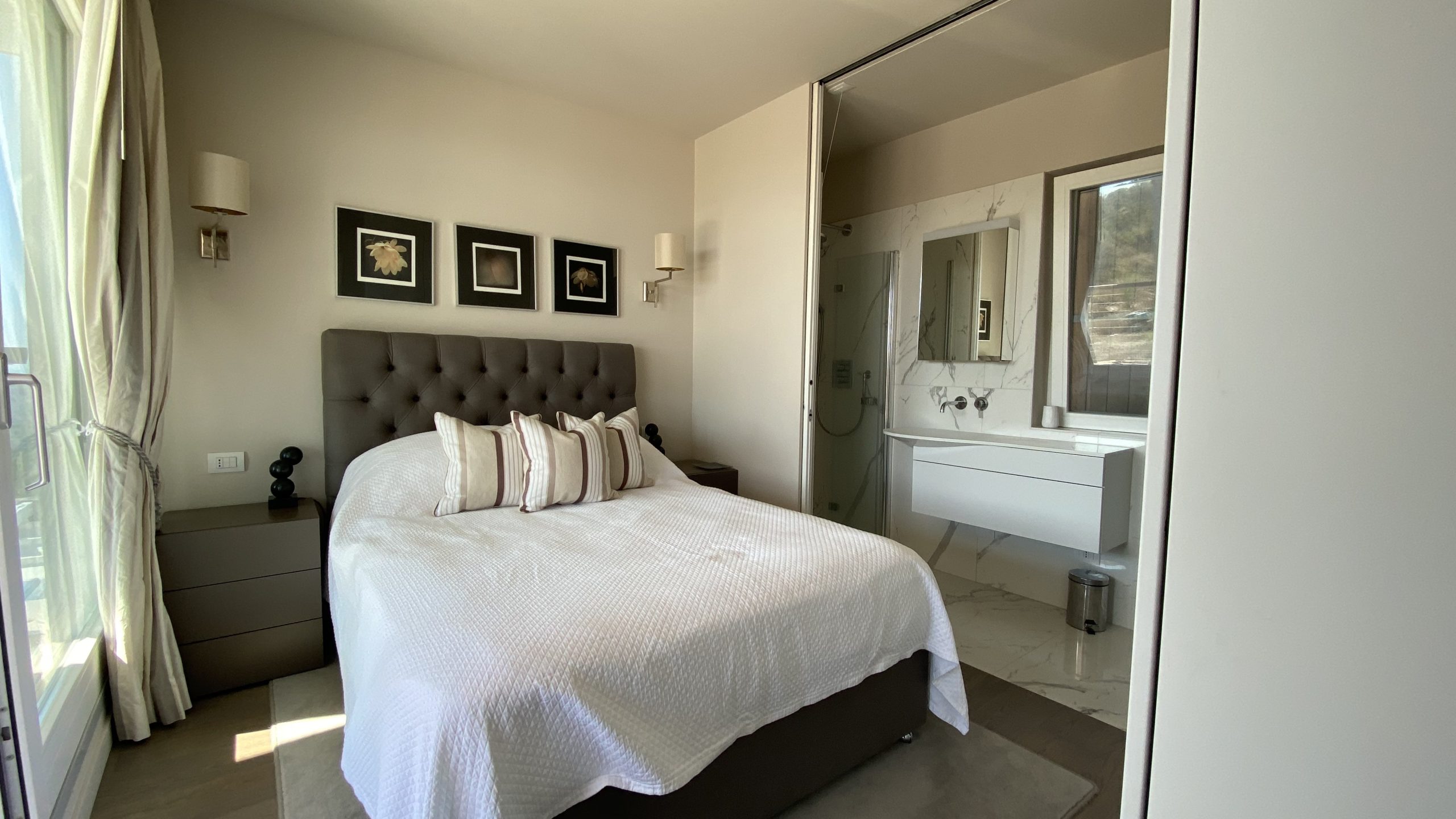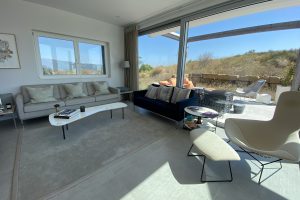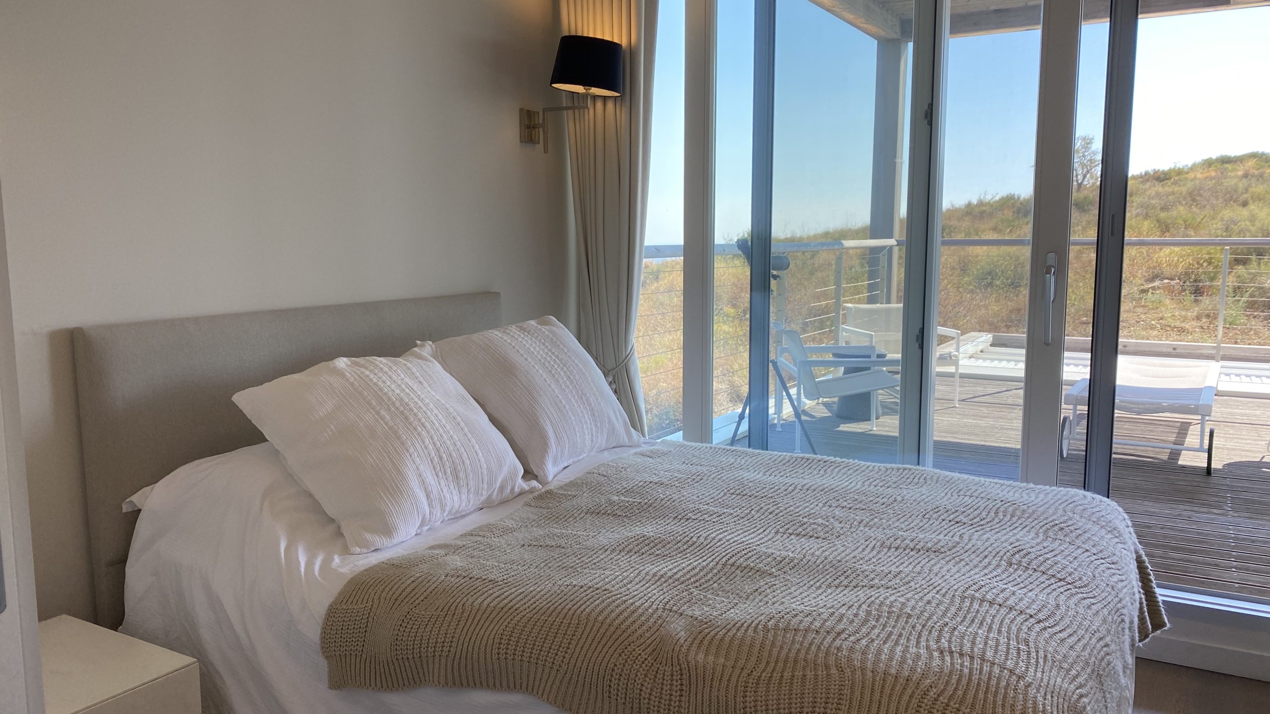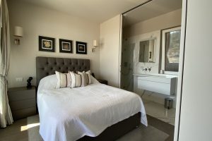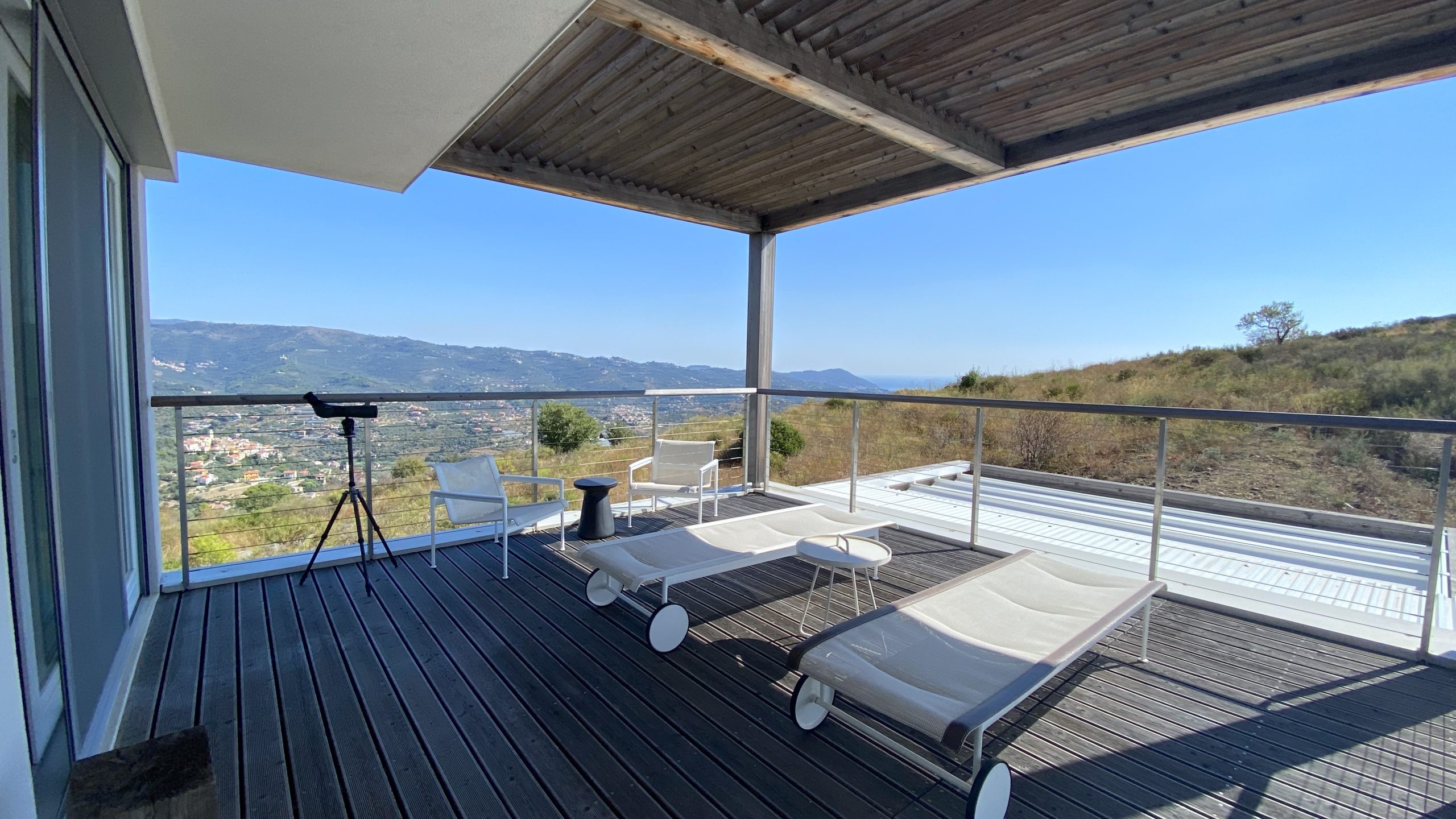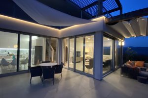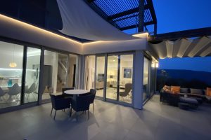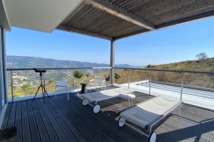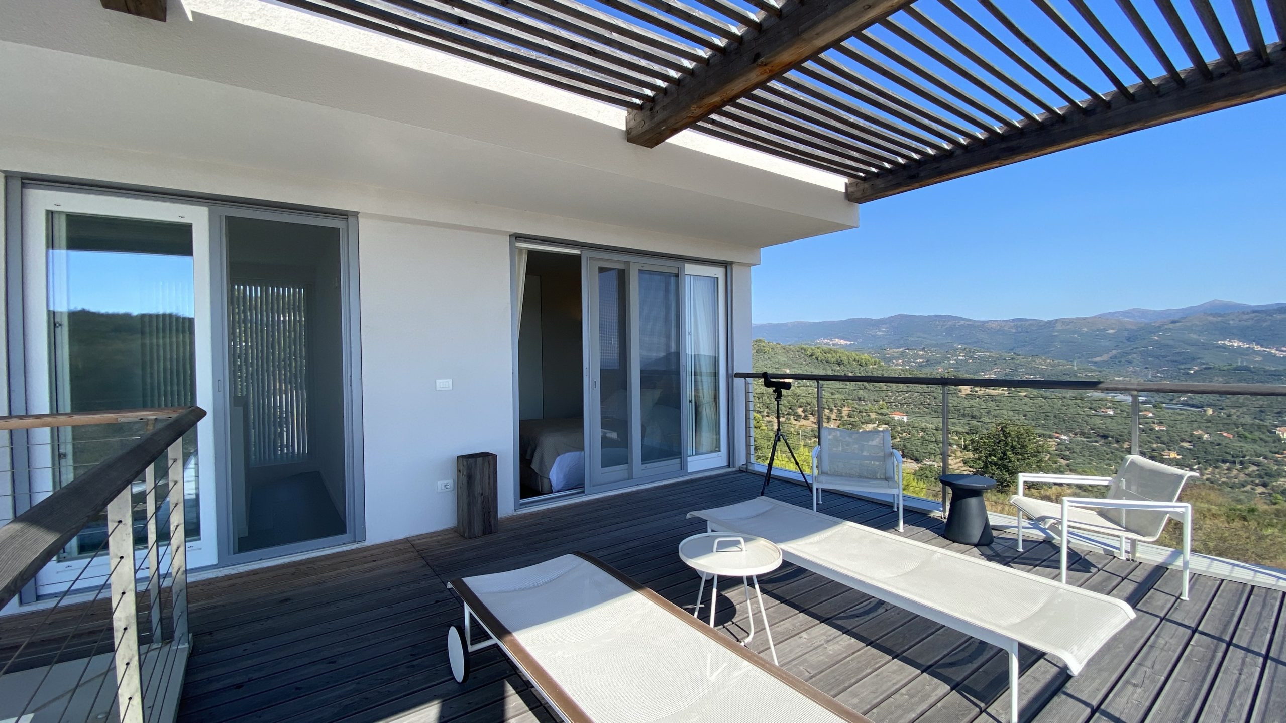 slaapkamers waarvan er 2 op de eerste verdieping, met toegang tot het panorama terras met ligbedden en een zitje en één op de begane grond, alle met airco en vloerverwarming