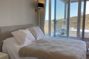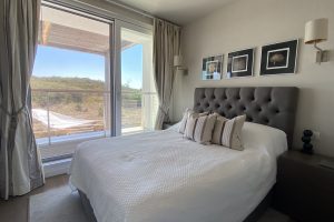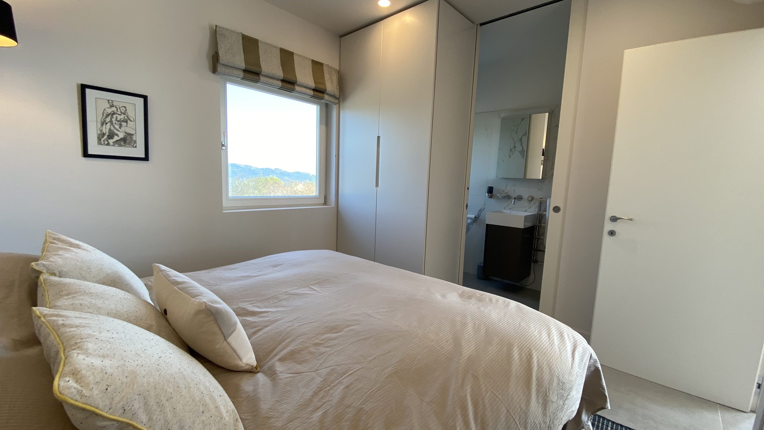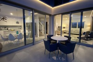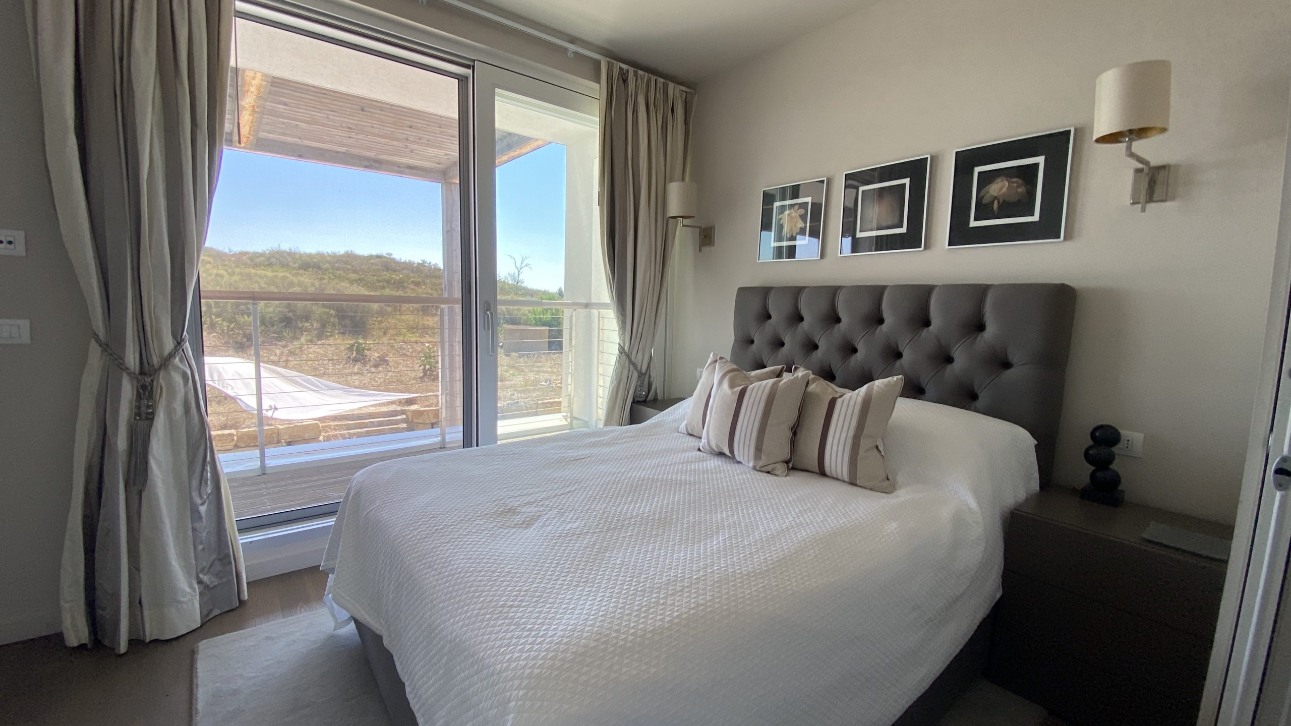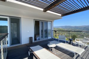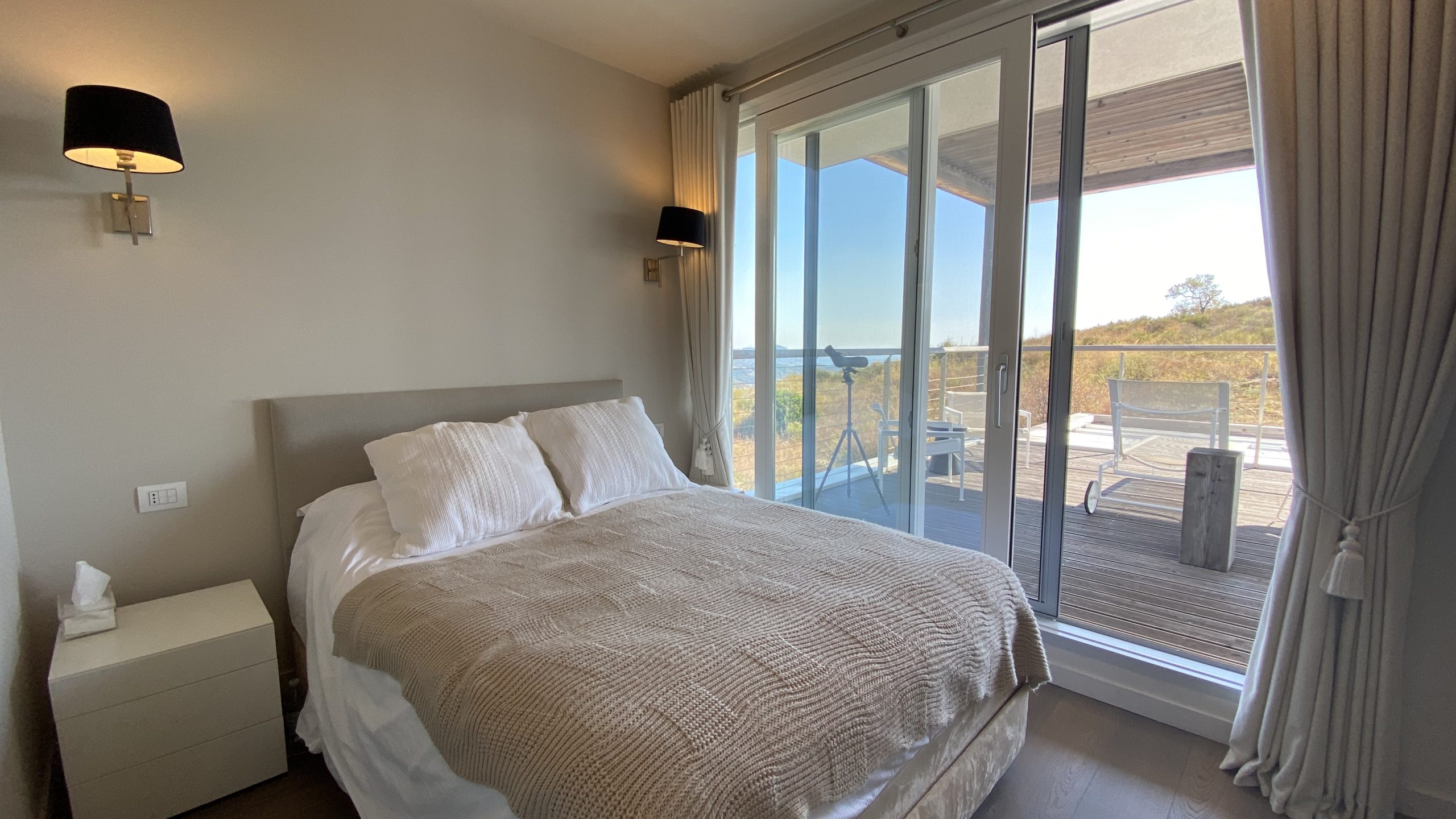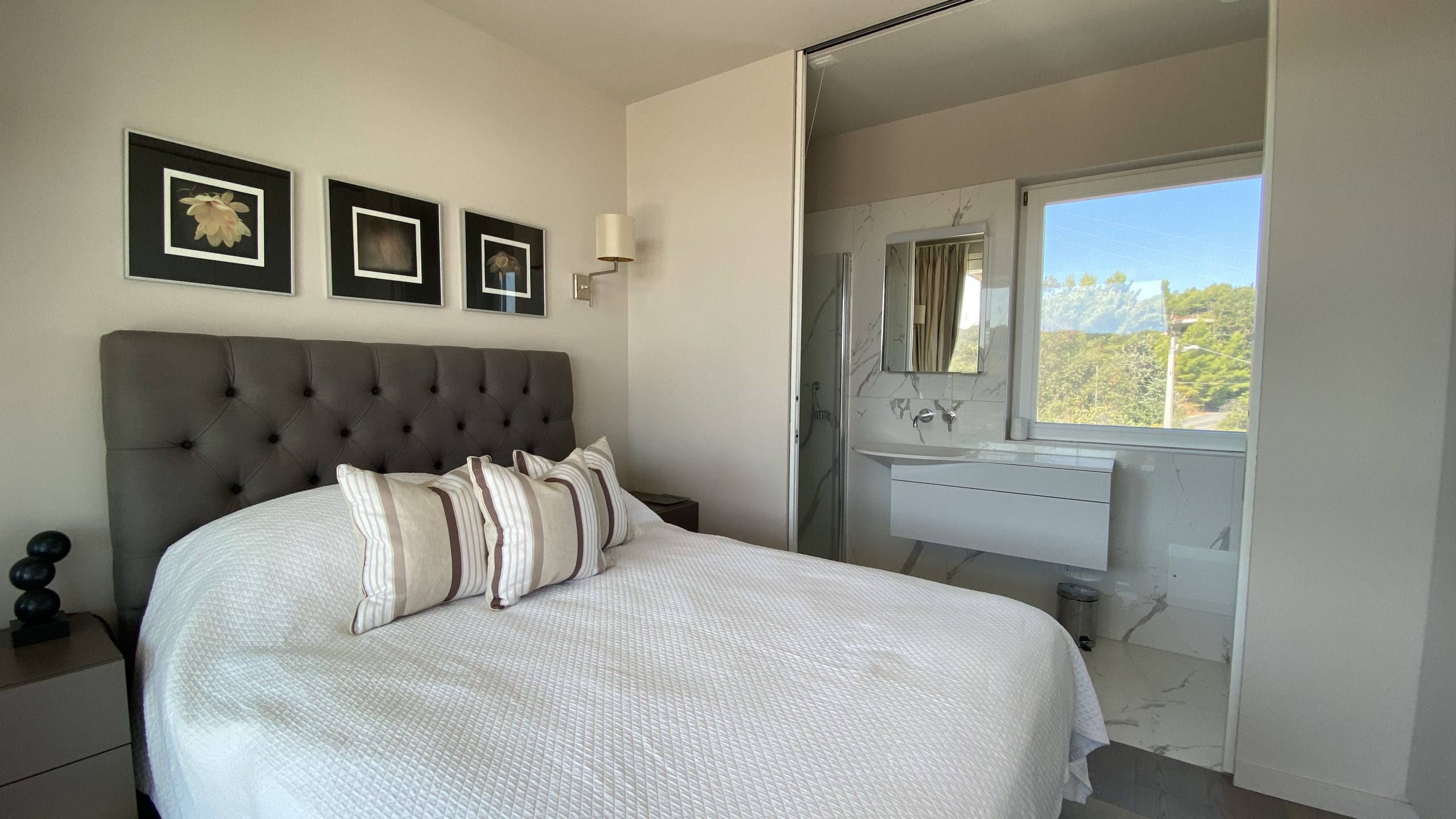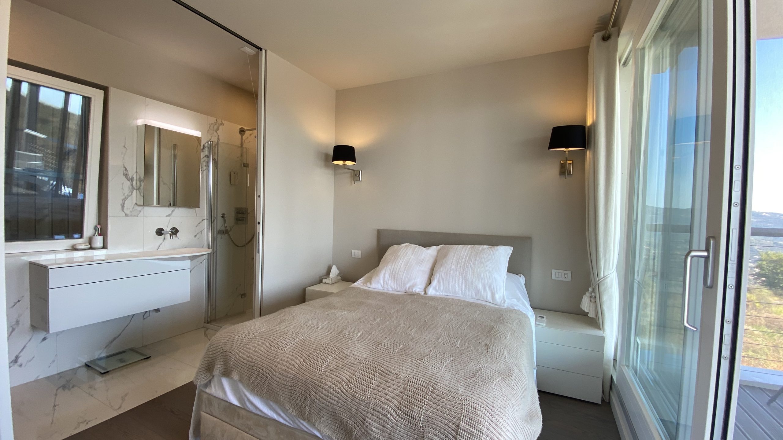 slaapkamers waarvan er 2 op de eerste verdieping, met toegang tot het panorama terras met ligbedden en een zitje en één op de begane grond, alle met airco en vloerverwarming