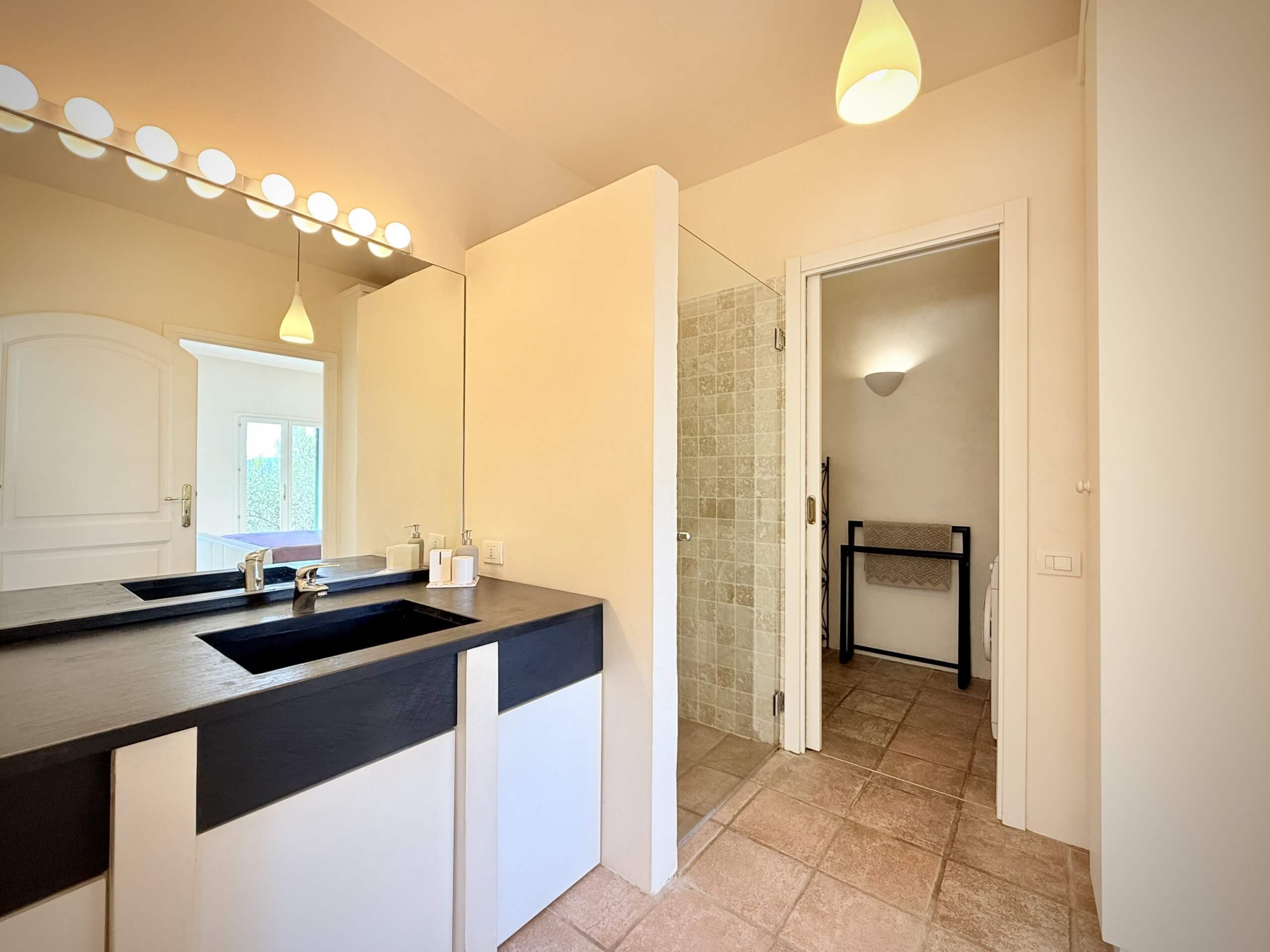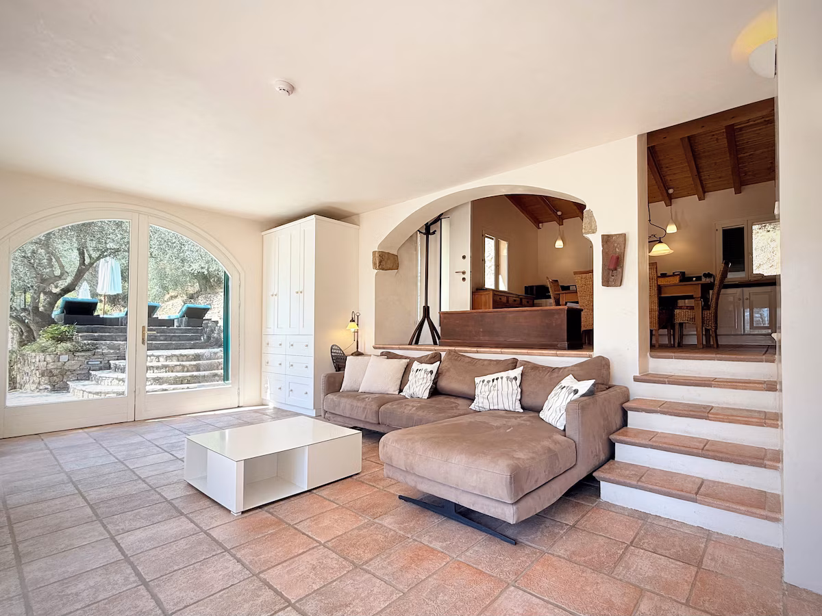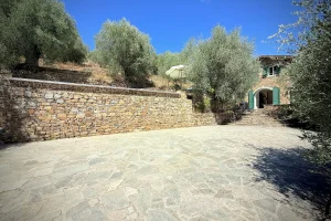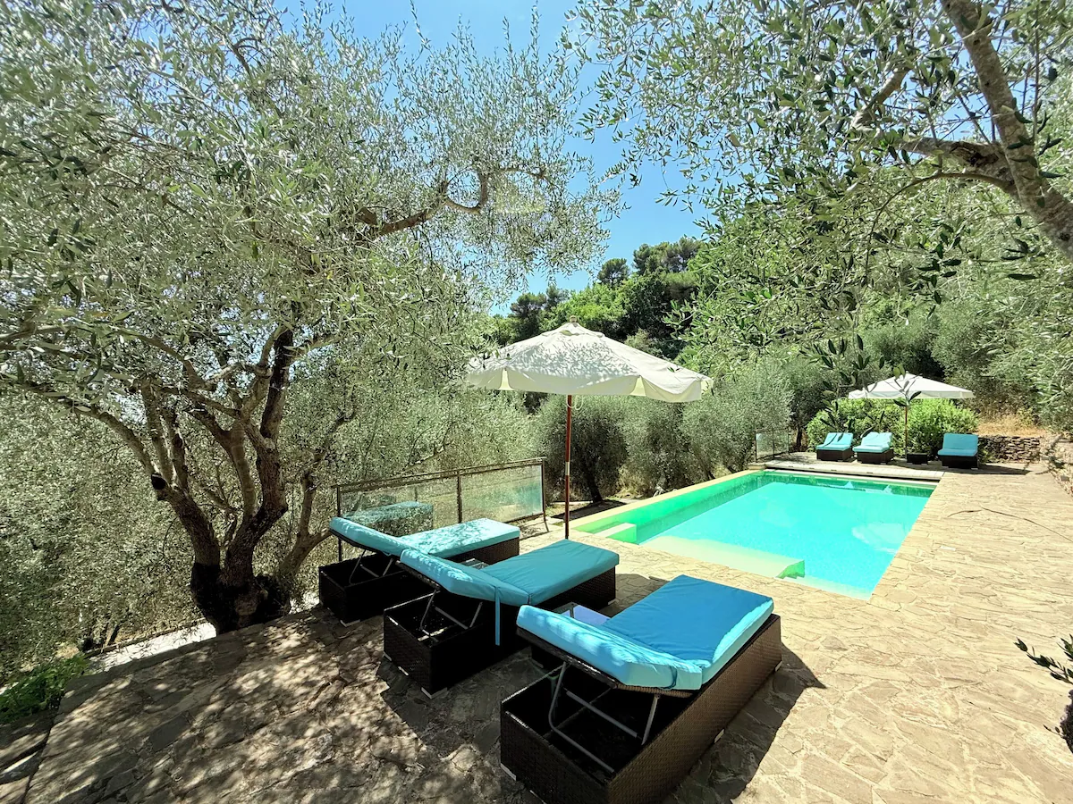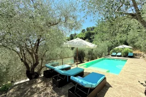 • Terras met loungehoek bij de villa, tuin rondom met olijfbomen, op meerdere niveau’s. BBQ bij terras met eettafel bij de villa