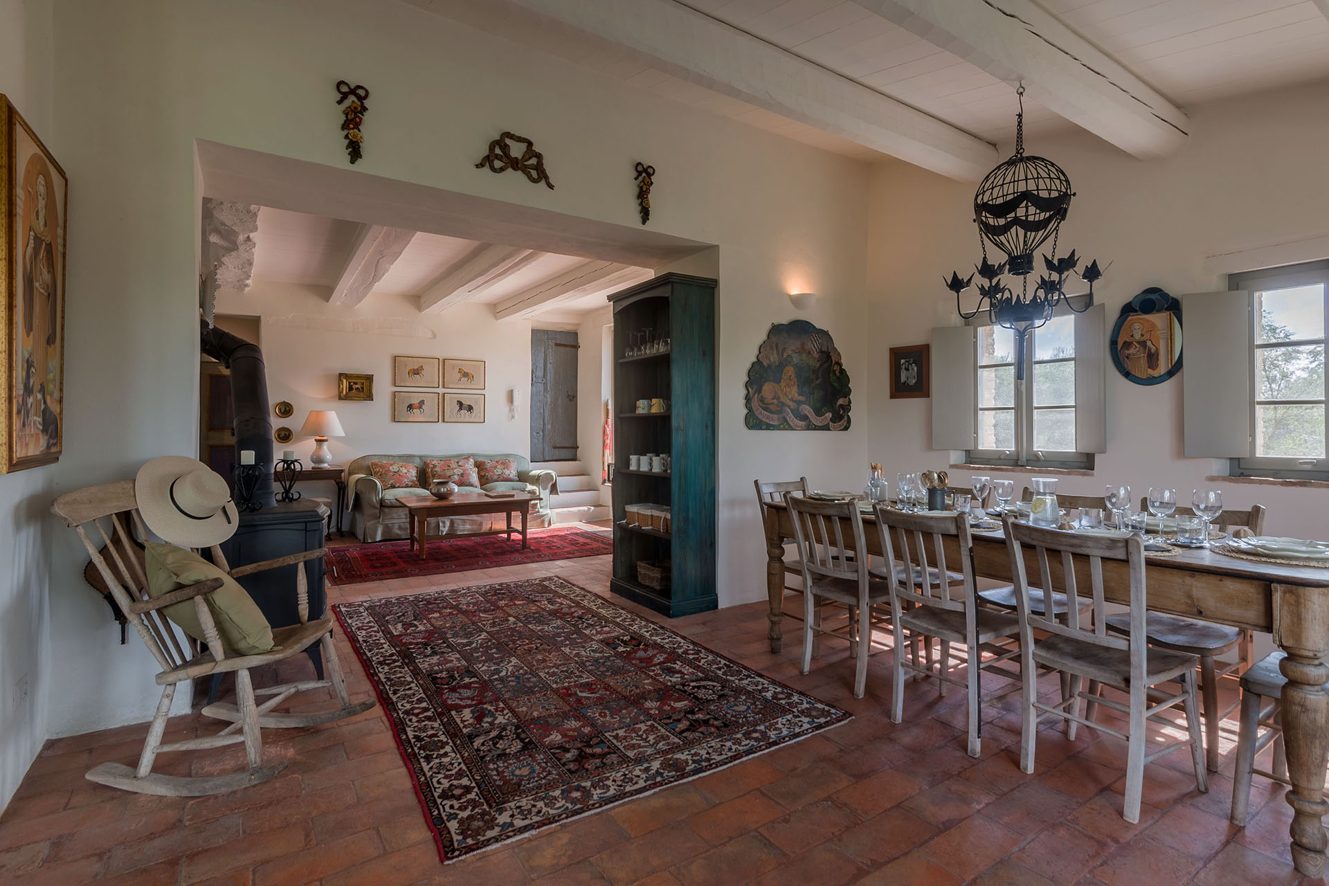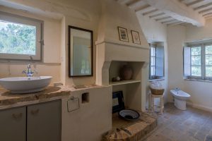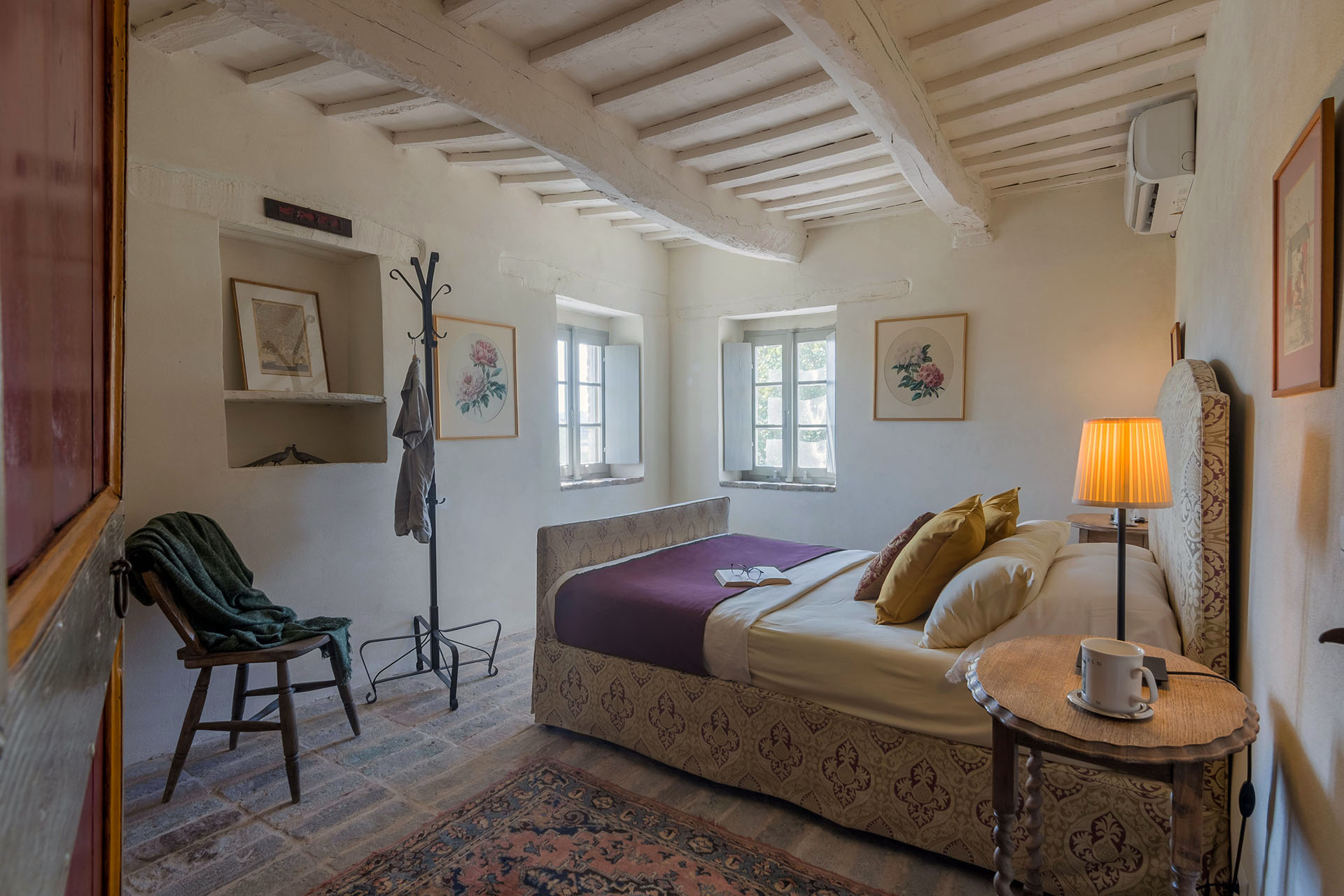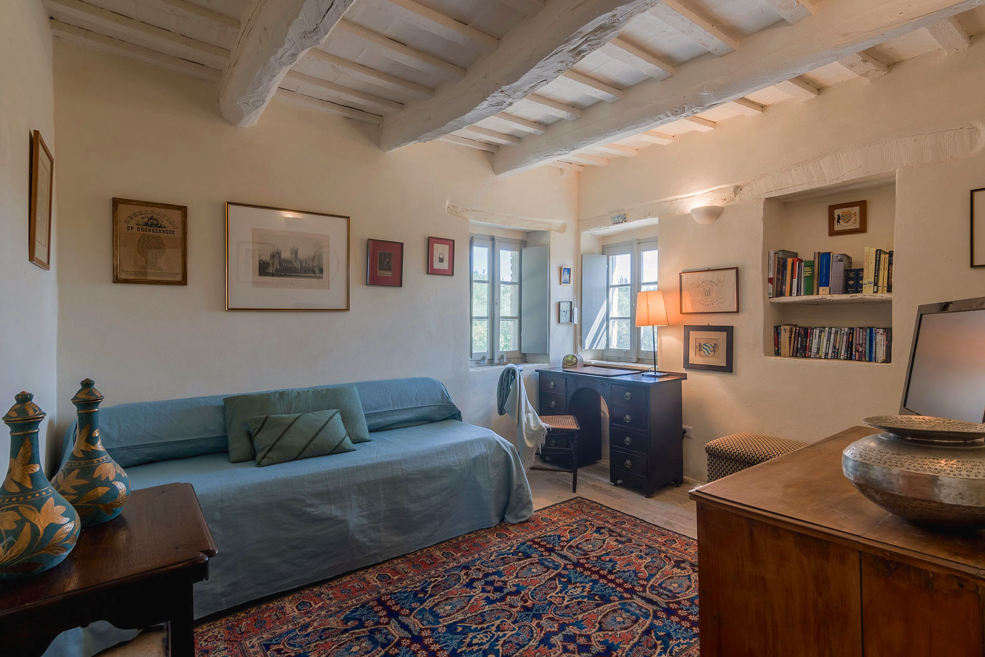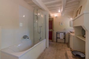 Hoewel Casa Poppea tegenwoordig vooral een heerlijk vakantiehuis is dat veel gebruikt wordt door de eigenaars zelf, was het nog maar zo’n vijftien jaar geleden nog een echte boerenwoning. Met stallen en opslag op de begane grond, het woongedeelte op de eerste verdieping en een zolder die voornamelijk werd gebruikt om de hammen te drogen. Van deze indeling is nu nog nauwelijks iets over, maar de badkamer op de eerste verdieping, ooit de keuken, bevat nog steeds de oude open haard en wasbak. Ook de oude balken plafonds en de doorleefde vloeren zijn bewaard gebleven evenals de originele raamluiken en de oude deuren.
