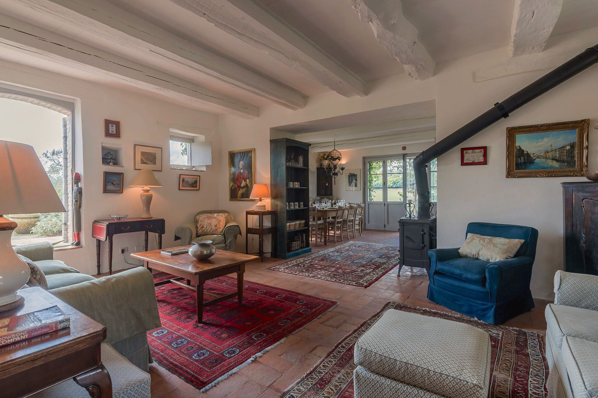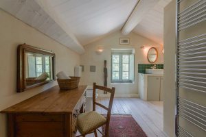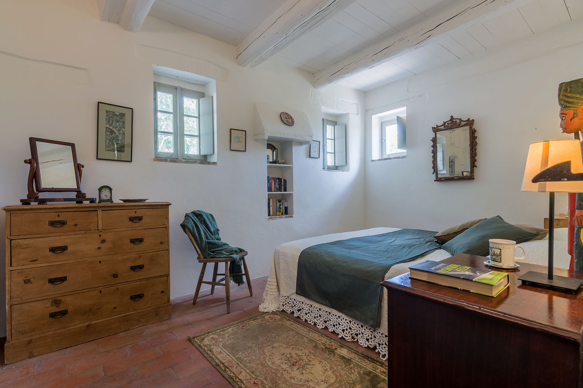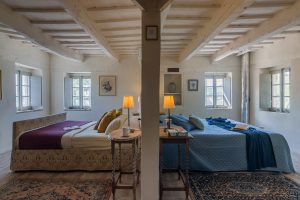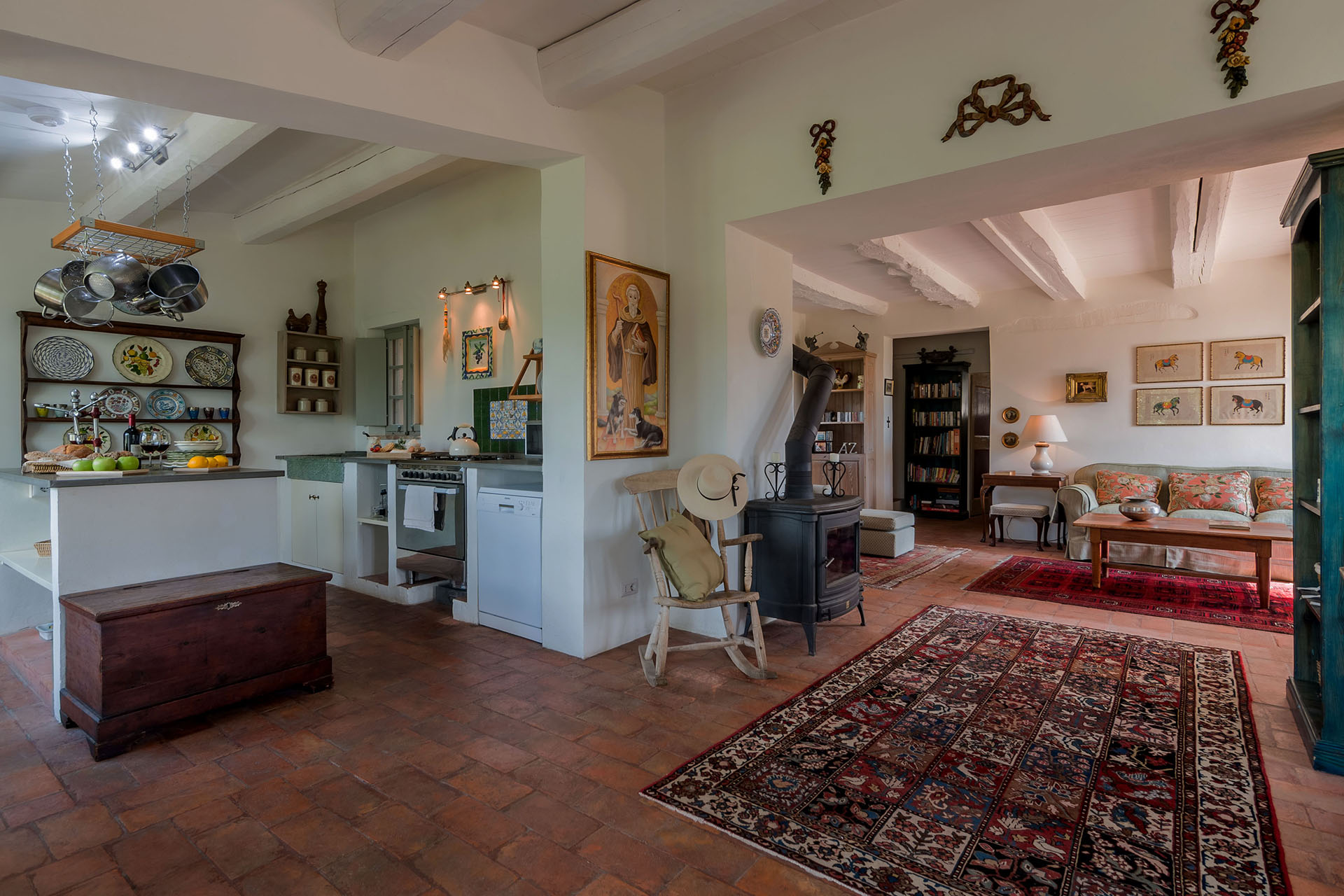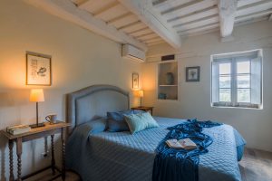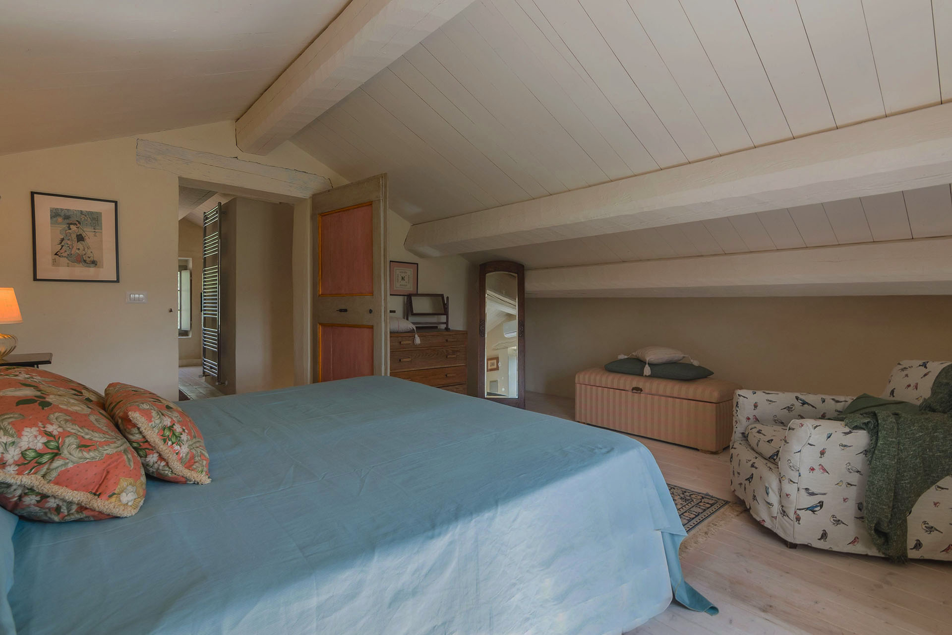 Hoewel Casa Poppea tegenwoordig vooral een heerlijk vakantiehuis is dat veel gebruikt wordt door de eigenaars zelf, was het nog maar zo’n vijftien jaar geleden nog een echte boerenwoning. Met stallen en opslag op de begane grond, het woongedeelte op de eerste verdieping en een zolder die voornamelijk werd gebruikt om de hammen te drogen. Van deze indeling is nu nog nauwelijks iets over, maar de badkamer op de eerste verdieping, ooit de keuken, bevat nog steeds de oude open haard en wasbak. Ook de oude balken plafonds en de doorleefde vloeren zijn bewaard gebleven evenals de originele raamluiken en de oude deuren.