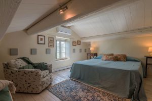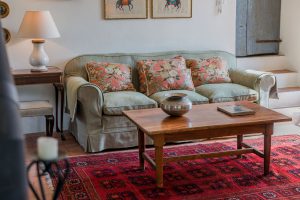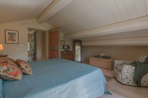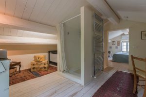 Maar verder is zo’n beetje alles aangepakt; de aanbouw voor gereedschap is nu bij het huis getrokken en biedt plaats aan de keuken en de eetkamer. Daar waar ooit de stallen waren is nu de woonkamer. En de voorraadschuur is nu omgetoverd tot een slaapkamer met eigen badkamer. De eerste verdieping is van woon- in slaapverdieping veranderd en waar ooit de keuken was is nu een badkamer met bad, die door beide slaapkamers wordt gedeeld. De droogzolder voor de hammen is ten slotte omgetoverd tot een studio met een slaapkamer, een badkamer en een schrijfgedeelte. Allerlei veranderingen die tot een echt leefhuis hebben geleid waar je prima met familie of vrienden kan verblijven.