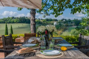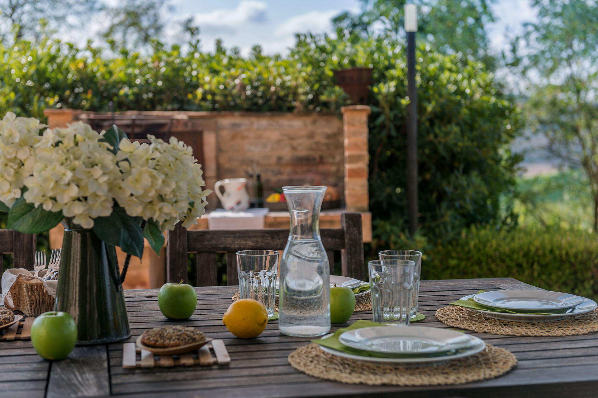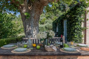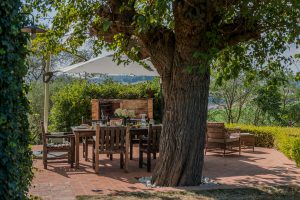 Grote tuin met olijfgaard, terras met eettafel onder de moerbeiboom, opgemetselde grill/bbq.