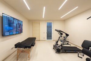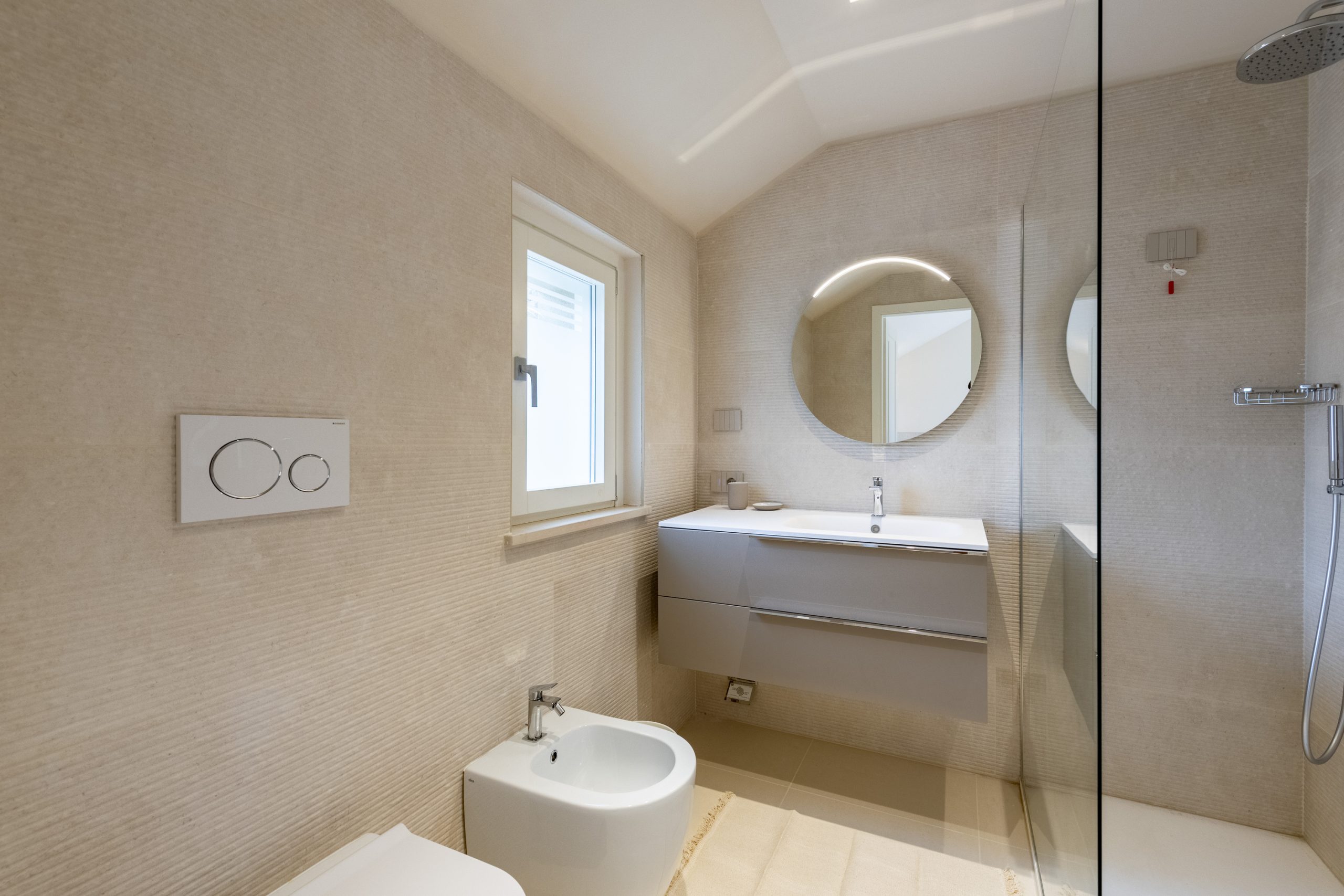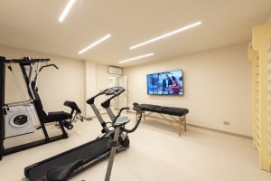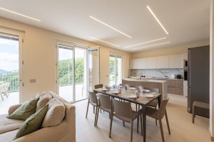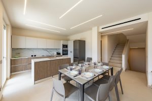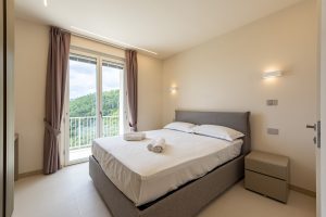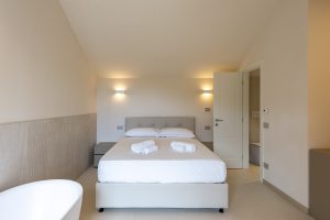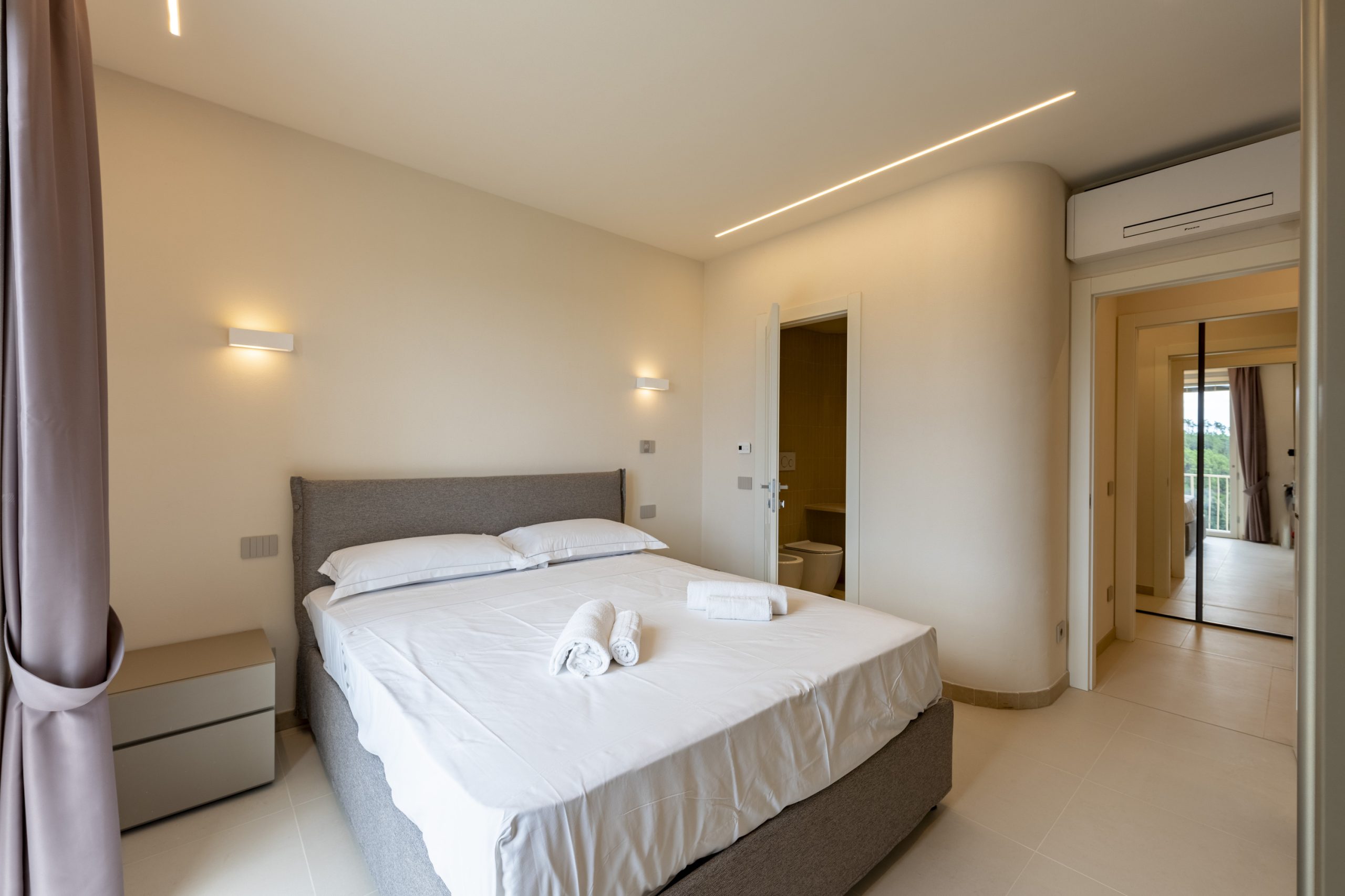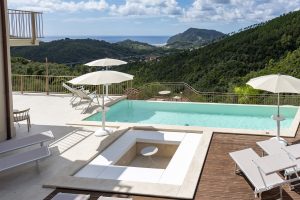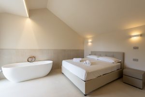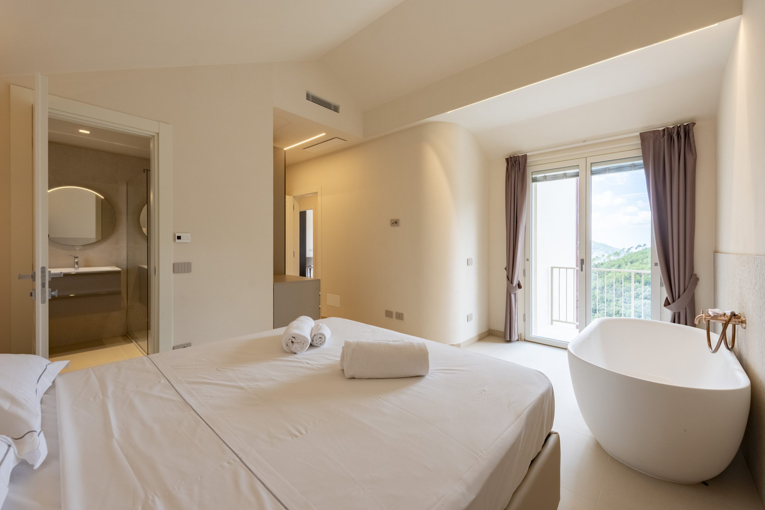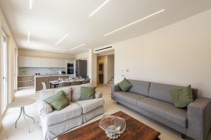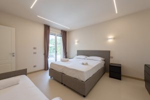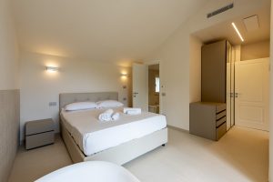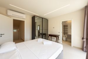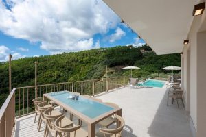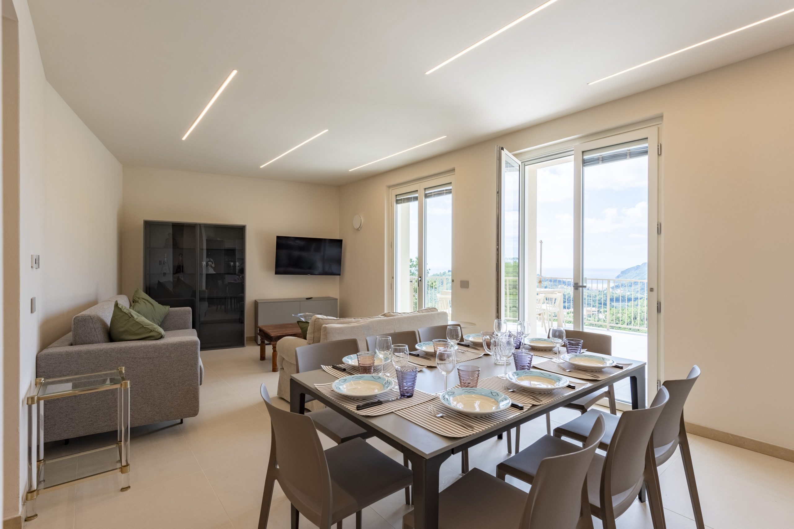 Naast het grote terras, dat is ingericht met een grote eettafel en een zonneterras met zijdelings van de woning het zwembad met daarachter het ongedeelde met de nodige ligbedden, is er ook een klein, iets lager gelegen terras dat als een vooruitgeschoven uitkijkpost vrij over het landschap naar zee uitkijkt. Drie openslaande deuren verbinden het terras met het woongedeelte, een living met comfortabele zithoek, een grote eettafel en een moderne keuken met kookeiland. Verder ligt er op de begane grond een slaapkamer met toegang tot het zonneterras. Naast een tweepersoons bed telt deze kamer een extra eenpersoons bedbank. Een trap omhoog leidt naar de overige drie slaapkamers, elk met een balkon met uitzicht op zee. Alle drie met een ensuite badkamer, een van de drie daarnaast ook met een vrijstaand bad uitgerust. Verder is er een kleine fitnessruimte met onder meer een loopband en andere toestellen. Aan straatzijde heeft Casale Dragone een privé parkeerplaats.