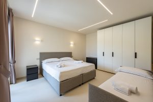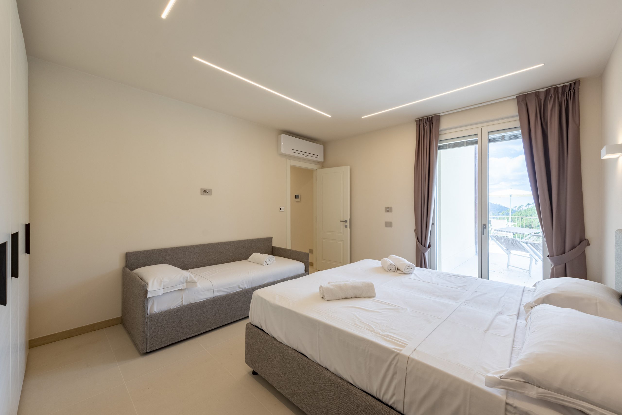 slaapkamers waarvan 1 op de begane grond, met een tweepersoons en een eenpersoons bed. drie op de eerste verdieping, elk met een balkon. alle met airco.