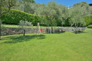 met oprijlaan naar het huis, tuin in twee niveau’s, gazon met speeltoestellen en hangmat, zonneterras met ligbedden, parkeerplaats op eigen terrein