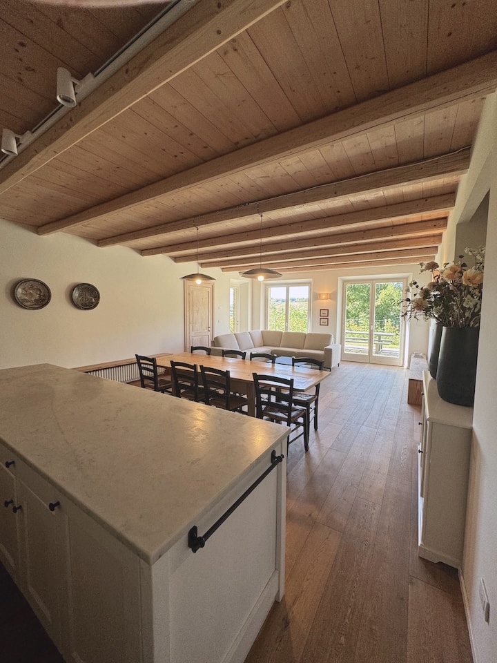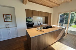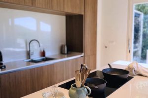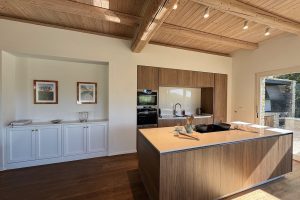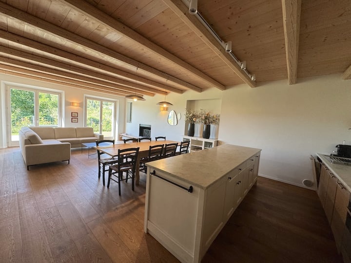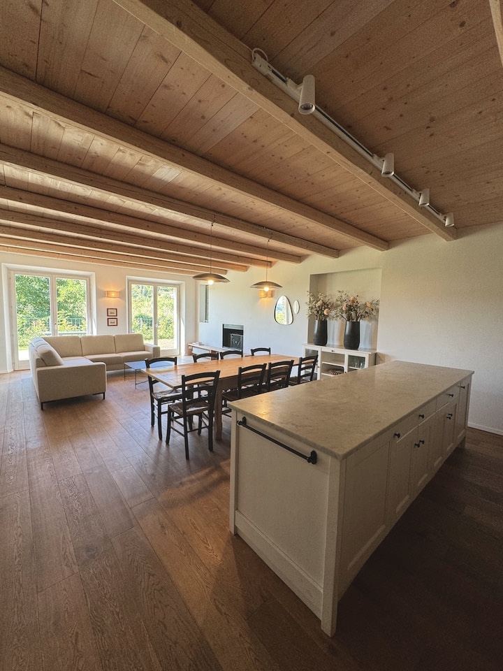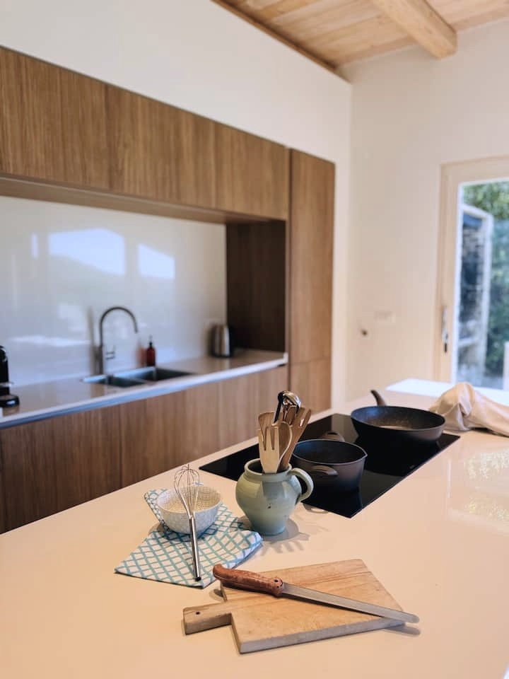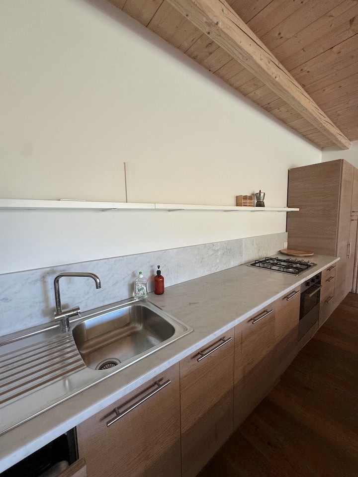 Een keuken met kookeiland, keuken in de kleine living en kleine keukenhoek op de zolderverdieping