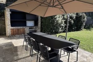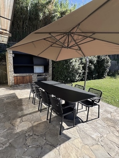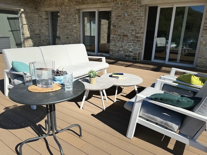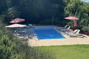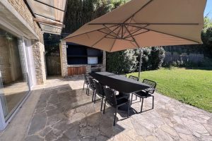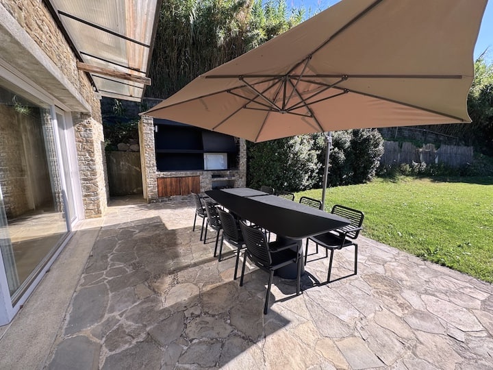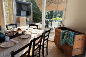 Buiten biedt de tuin voldoende ruimte om rond te wandelen, met een bal te spelen en te ontspannen. Een overdekte veranda met een houtskool barbecue nodigt uit om buiten te dineren, terwijl het zwembad de perfecte plek is om te genieten van de zon of af te koelen op warme dagen.