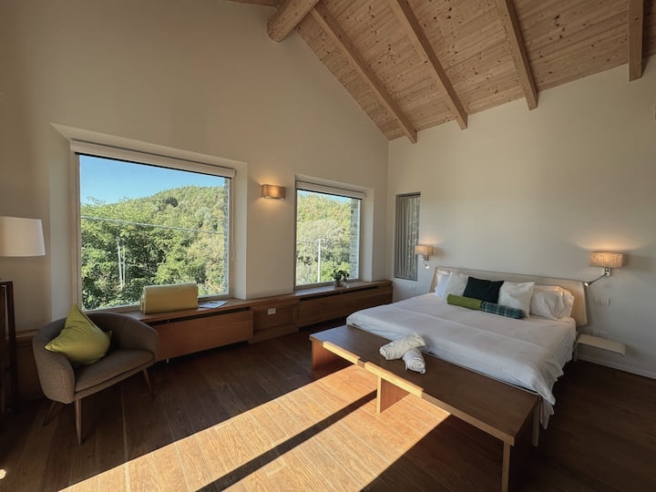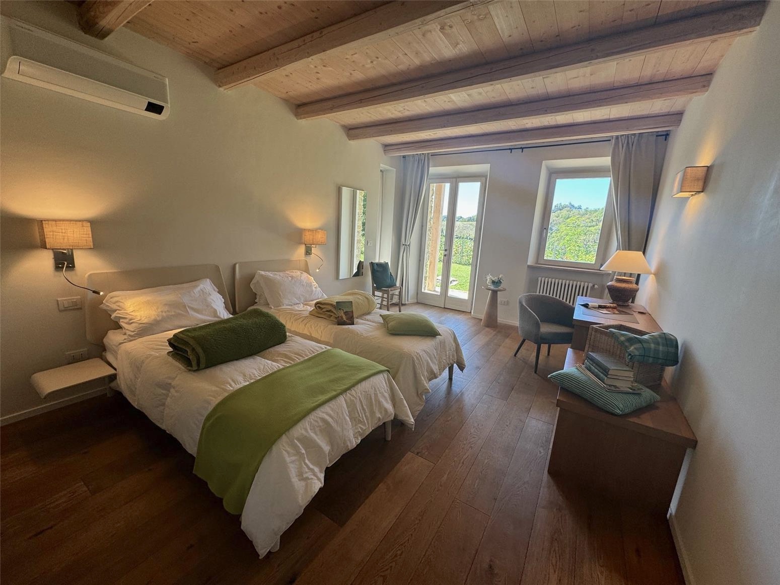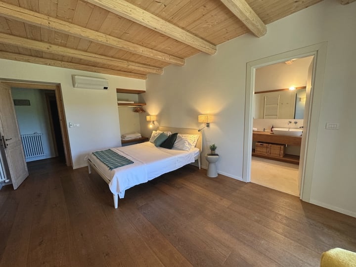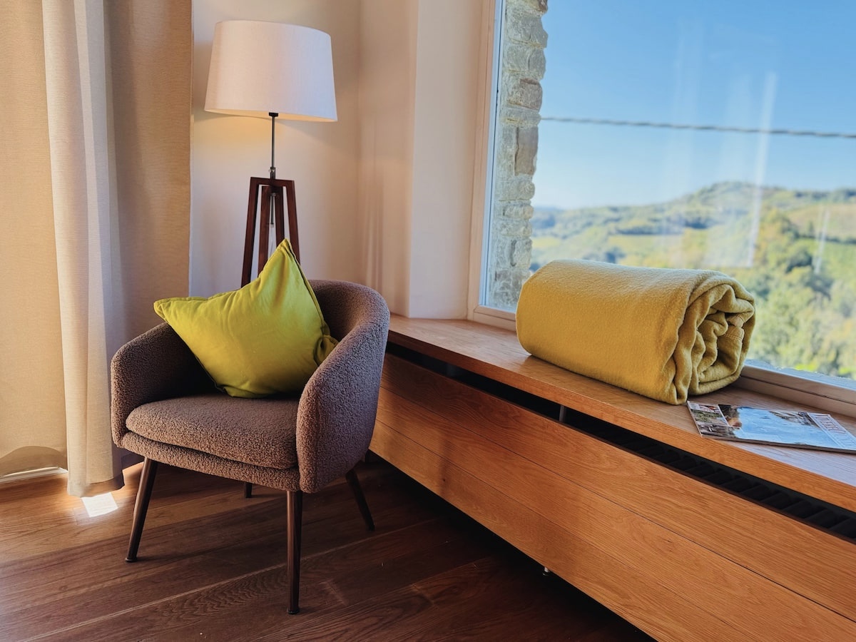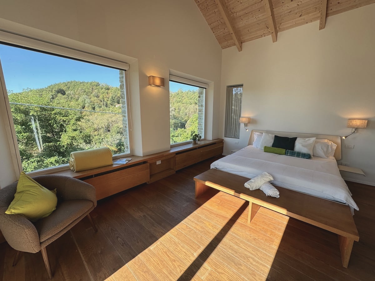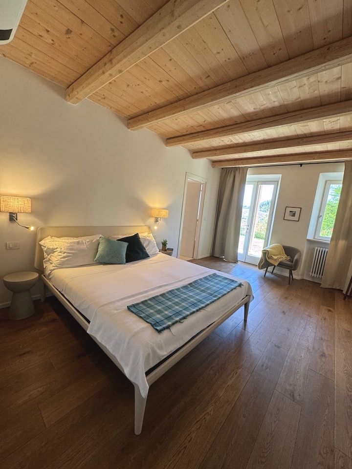 Vanuit elke hoek van de villa brengen grote ramen het buitenleven naar binnen, met een ononderbroken uitzicht op de glooiende wijngaarden die zich uitstrekken zover het oog kan zien. Of u nu geniet van het ontbijt op het terras, ontspant met een boek in de woonkamer of uitkijkt vanuit het comfort van uw bed, Casale Roncana geeft het gevoel dat het levendige landschap van Piemonte deel uitmaakt van het huis zelf.