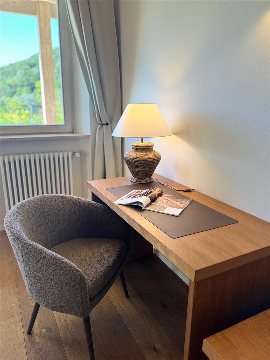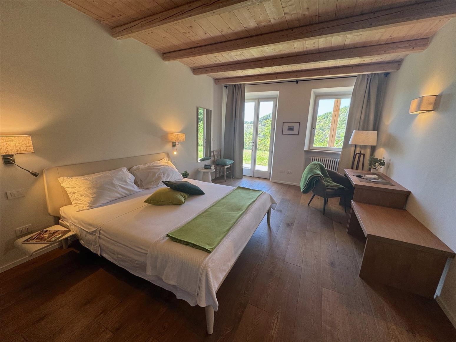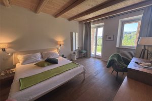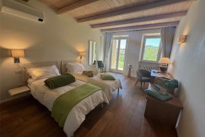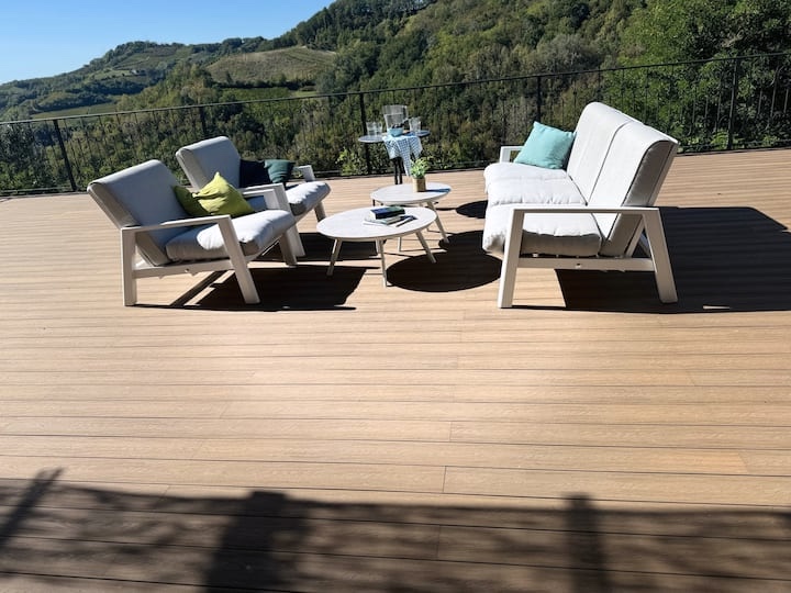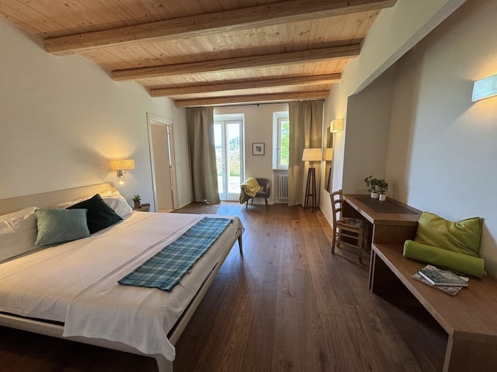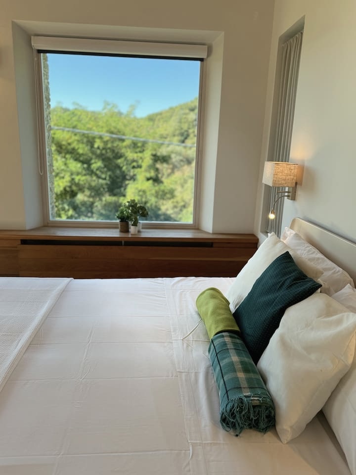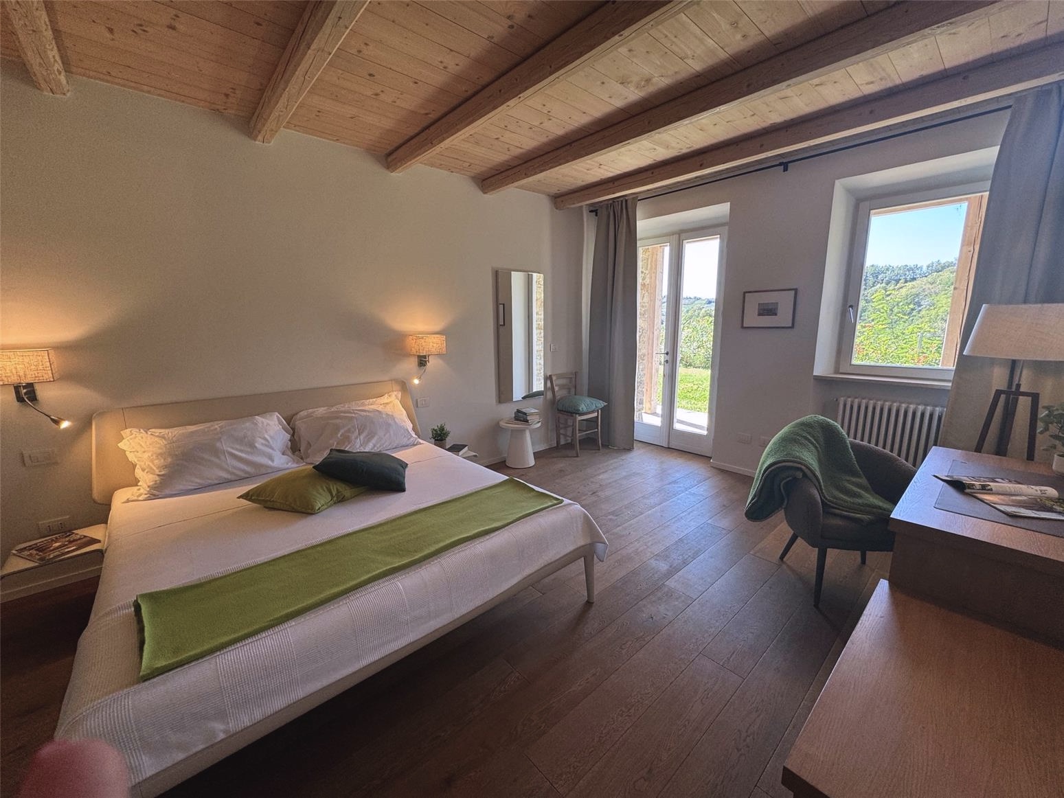 Vanuit elke hoek van de villa brengen grote ramen het buitenleven naar binnen, met een ononderbroken uitzicht op de glooiende wijngaarden die zich uitstrekken zover het oog kan zien. Of u nu geniet van het ontbijt op het terras, ontspant met een boek in de woonkamer of uitkijkt vanuit het comfort van uw bed, Casale Roncana geeft het gevoel dat het levendige landschap van Piemonte deel uitmaakt van het huis zelf.