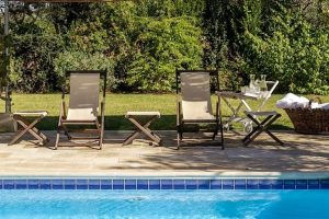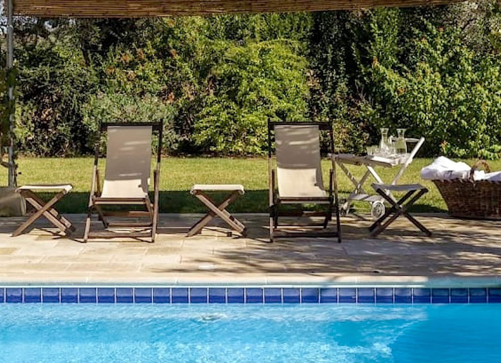 privé zwembad 12 x 4 m, 1.2 m diep. Zonneterras met ligbedden en een overdekt terras met luie stoelen.