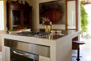 volledig uitgeruste keuken met kookeiland, openslaande deuren naar het overdekte terras met eettafel