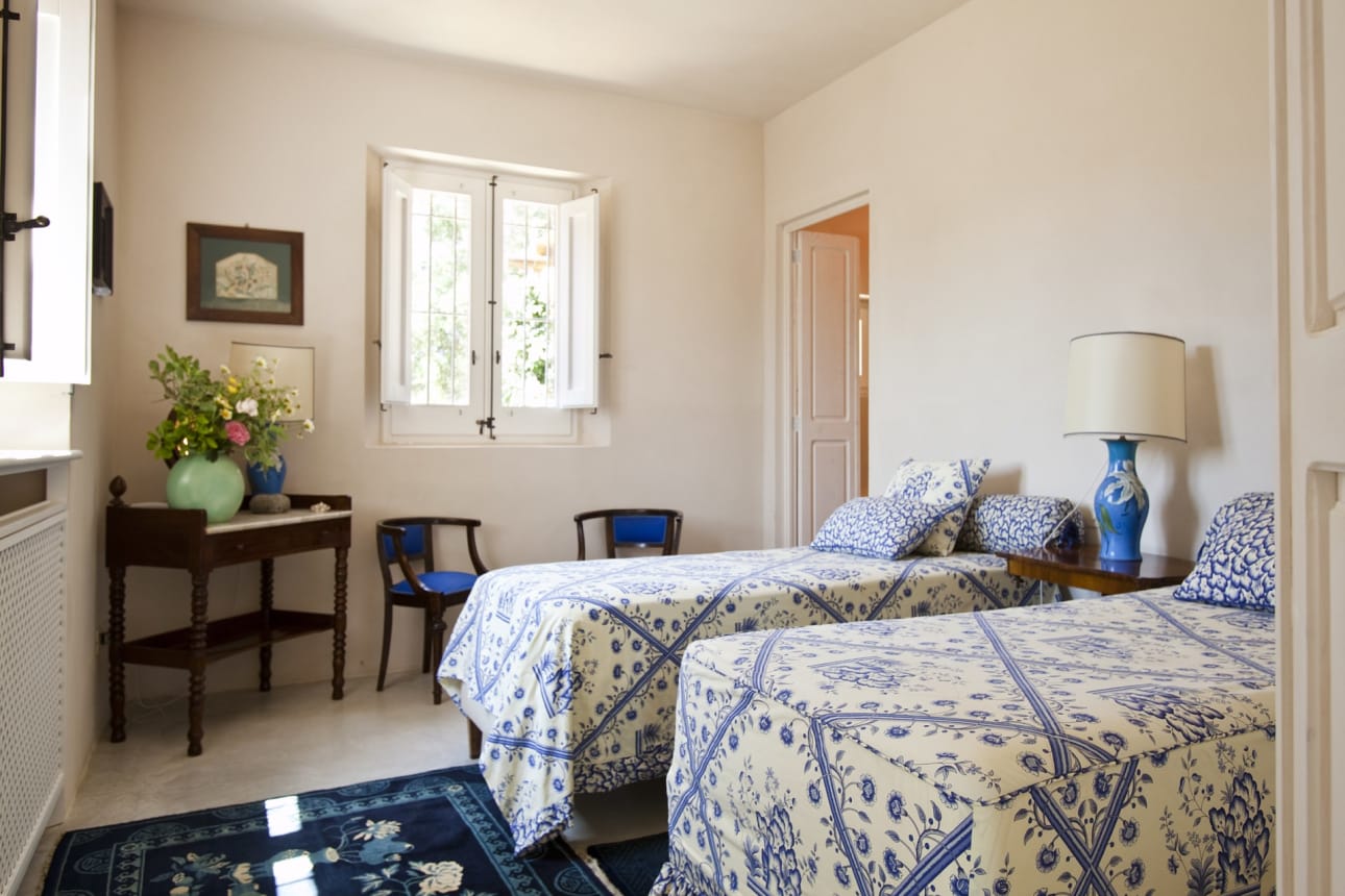 slaapkamers waarvan 2 met twee losse bedden die desgewenst tot een tweepersoons geschakeld kunnen worden, alle met airco en toegang tot de tuin en een overdekt terras