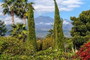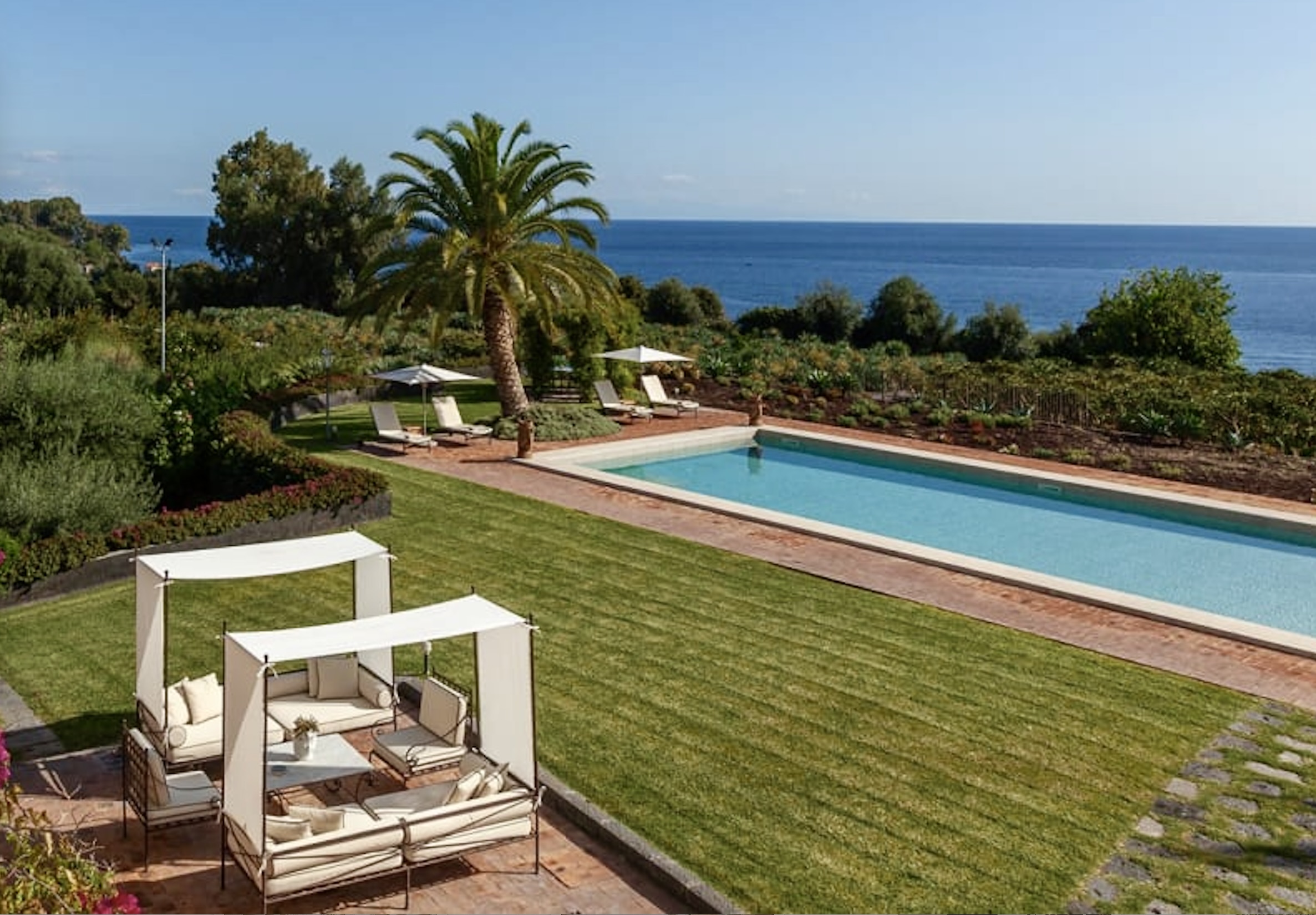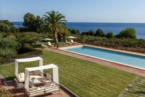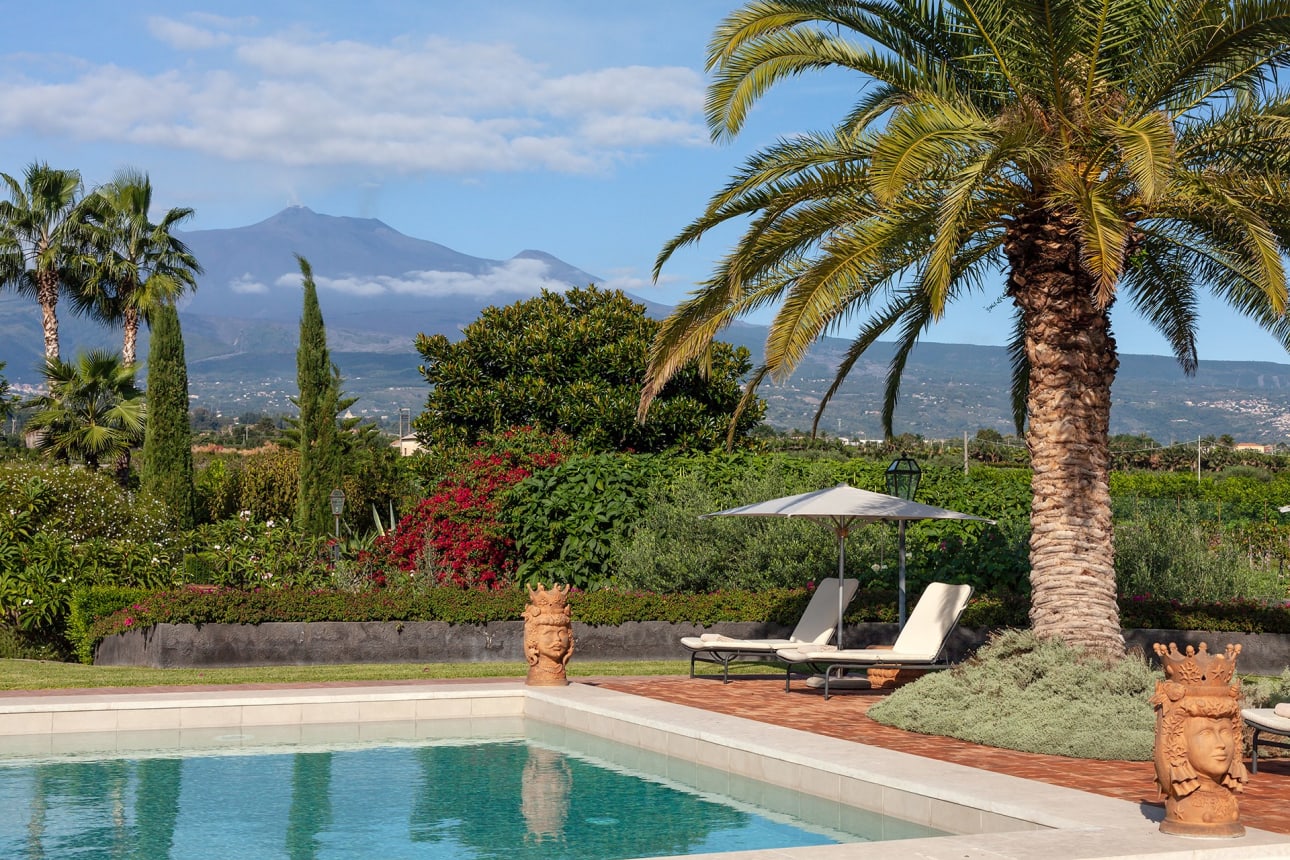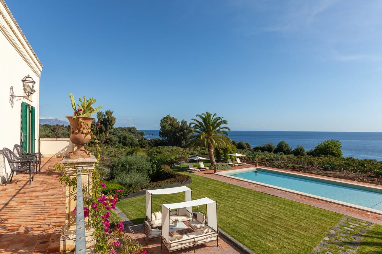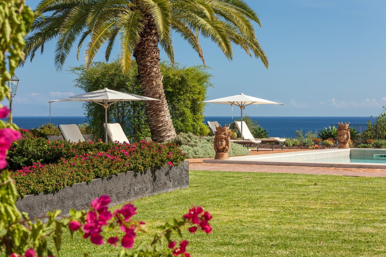 Donna Carmelita ligt vlakbij de kust, omgeven door weelderig groen dat vanwege de grootte als een park aanvoelt met allerlei paden en zitjes. Het terras rond het verwarmde zwembad is een van de vele favoriete plekken in de tuin. Verder is er een romantisch prieel waar desgewenst de lunch geserveerd wordt. Of anders de loungehoek voor de villa met twee tegenover elkaar geplaatste banken met elk een eigen zonnedoek. Daarnaast zijn er de panorama-terrassen op de eerste verdieping die zijn ingericht met de nodige zitjes en ligbedden, om optimaal te kunnen genieten op het zicht op zee – maar minstens zo fraai – het uitzicht op de Etna.