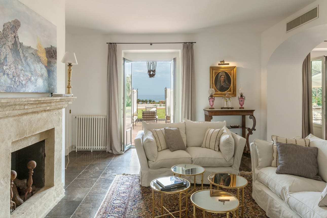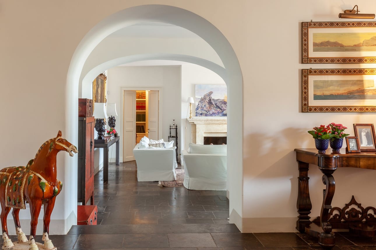 Het landhuis Donna Carmelita is verdeeld over twee verdiepingen. De hoofdingang leidt naar een hal waaruit de woonvertrekken van de begane grond op uitkomen. Aan linkerzijde van de hal ligt een ruime, lichtovergoten woonkamer, waarvan openslaande deuren toegang bieden tot de tuinen en het zwembad en tegelijkertijd het prachtige uitzicht op zee naar binnen haalt. Comfortabele banken en fauteuils staan rond een open haard en de originele tegelvloer steekt fraai af tegen de witte muren. Twee deuren leiden vanuit de woonkamer naar een gastenbadkamer en, een paar treden omhoog, naar een ruimbemeten tweepersoonsslaapkamer met eigen douche en toegang tot de tuinen. Rechts van de hal leidt  een brede gang naar een aparte eetkamer en de keuken, die in een mix van hedendaagse stijl en Siciliaanse traditie in ingericht en zeer aangename van sfeer is.