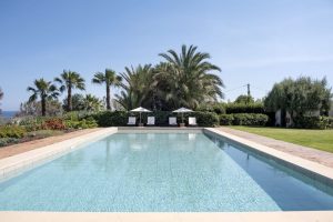 Het verwarmde zwembad* met de statige villa