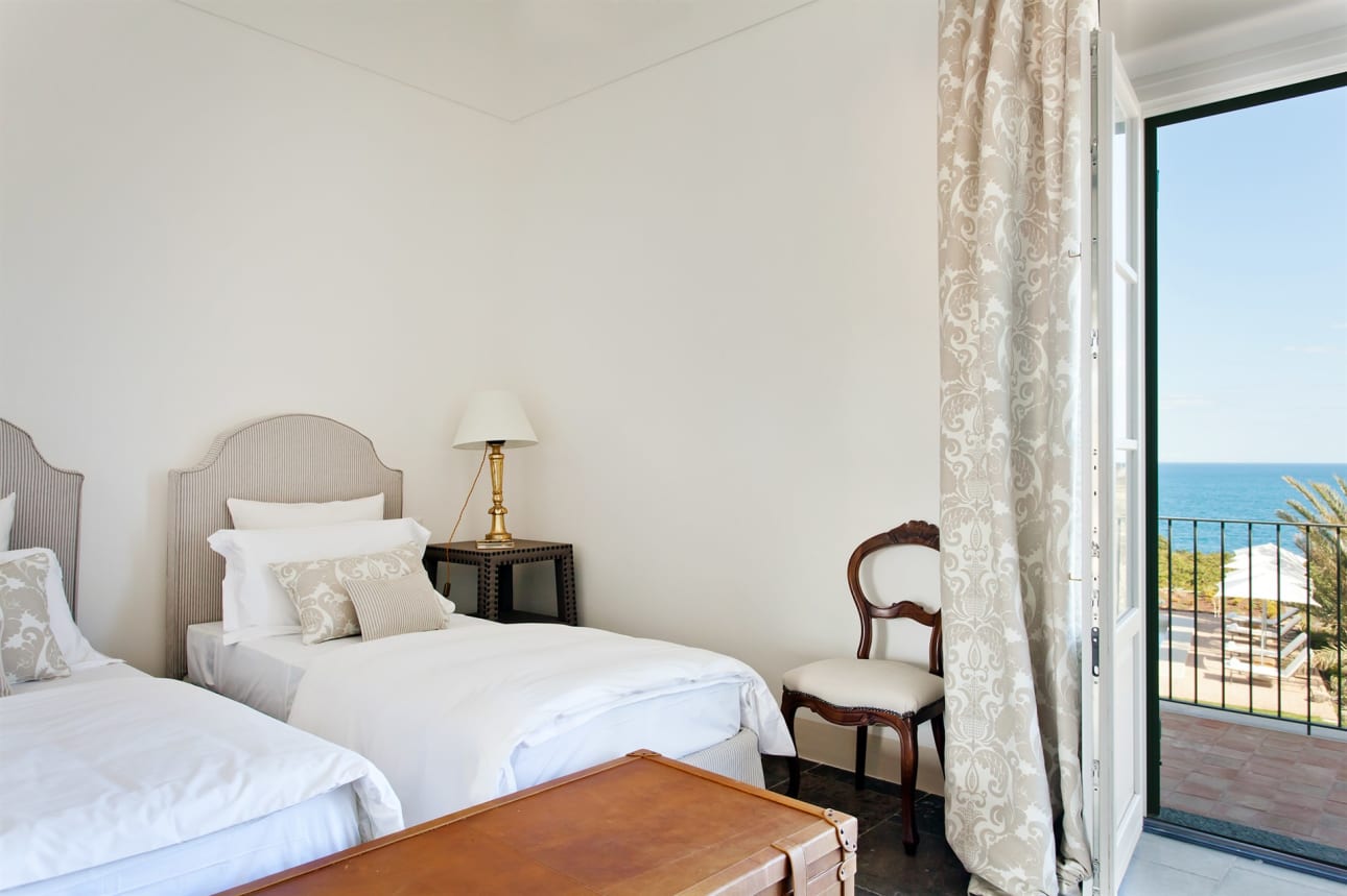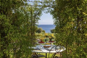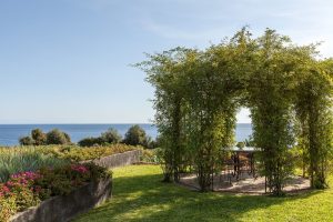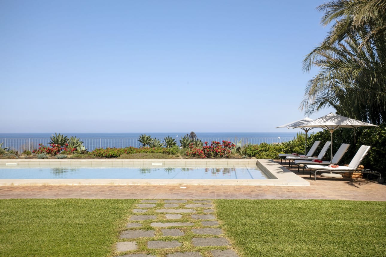 Een kijkje op de tuin met het zwembad en de zee erachter