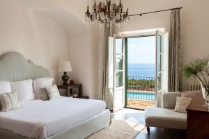 Een trappartij leidt vanuit de hal naar omhoog naar de gang waaraan de overige vier slaapkamers zijn gelegen: Allereerst een ouder slaapkamer met grote en-suite badkamer met bad en regendouche. Verder twee  tweepersoonskamers met een gedeelde en-suite badkamer met douche. Een tweepersoonskamer met eigen badkamer met douche. Alle slaapkamers op de eerste verdieping bieden een prachtig uitzicht op zee en hebben toegang tot een panoramisch terras dat over de gehele breedte van de villa loopt. Ook de gang die de slaapkamers verbindt, geeft toegang tot een groot terras met een prachtig uitzicht op de Etna-berg.