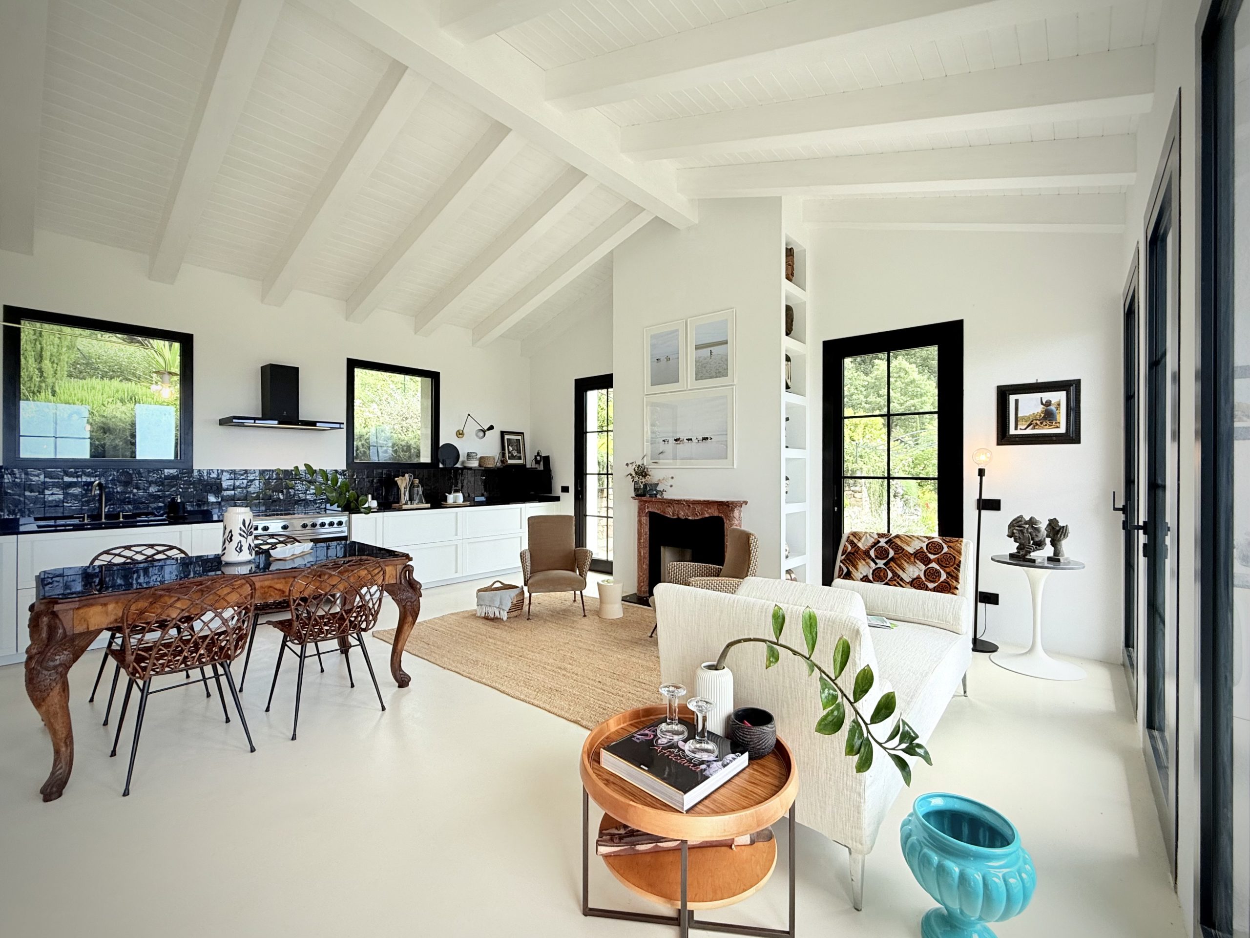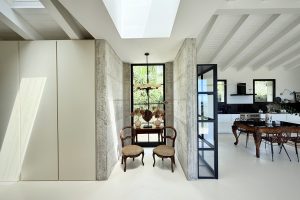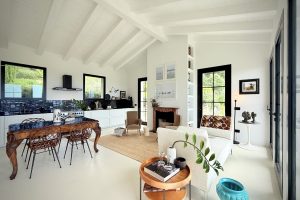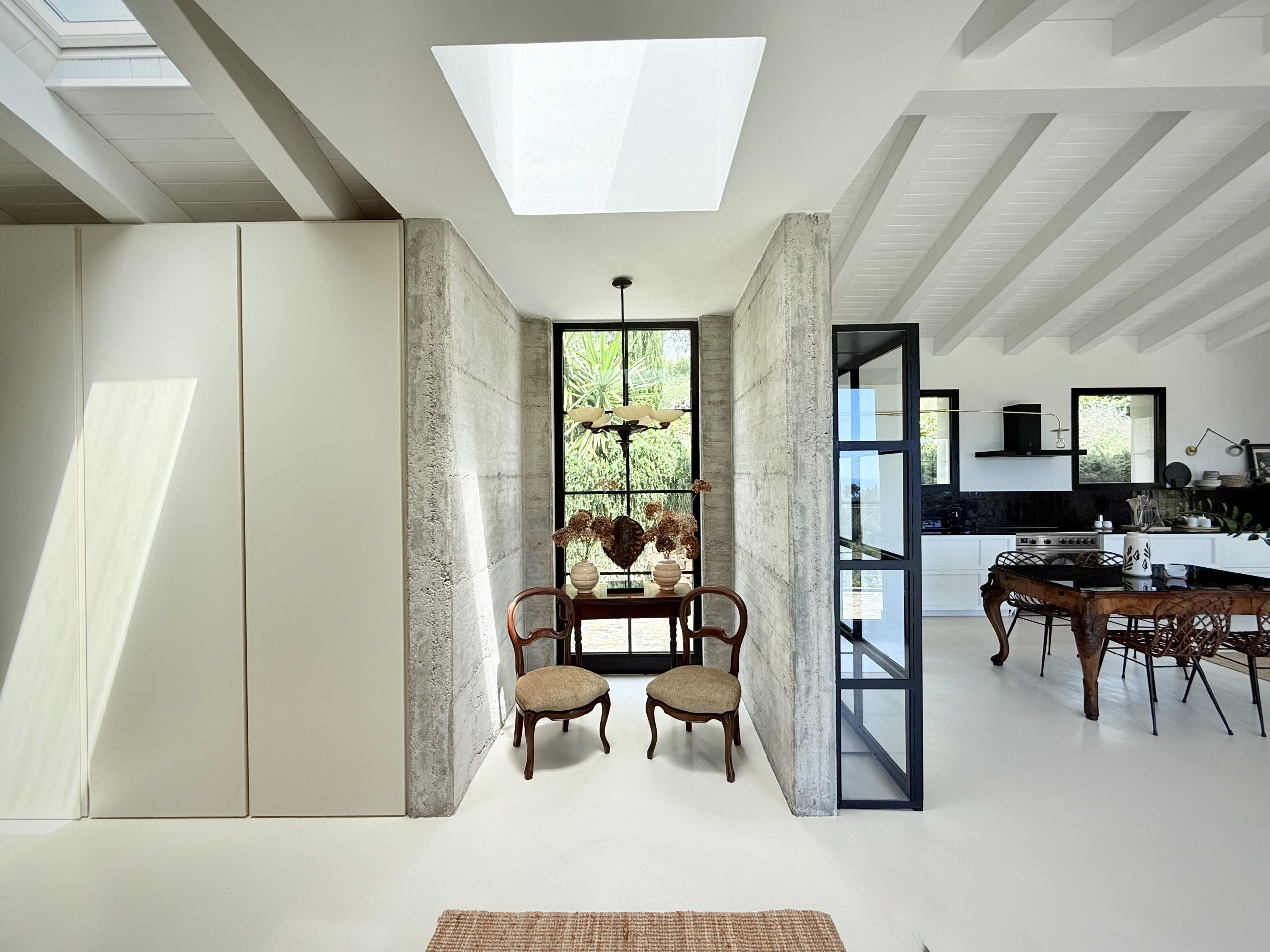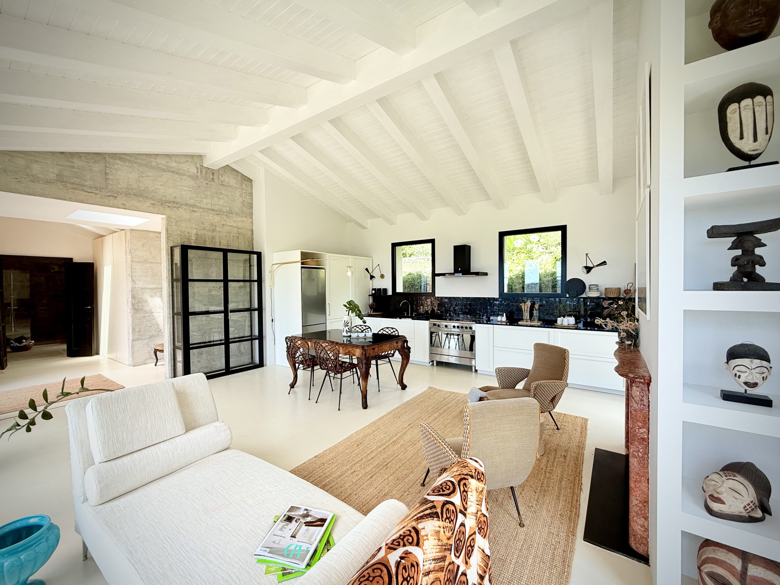 In het nieuwe deel is het leefgedeelte ondergebracht – een open plan ruimte met aan achterzijde een langgerekt keukenblok, en aan voorzijde een eettafel met een comfortabele zithoek met open haard op de kopse kant. Gietvloeren, muren en de open kap van het nieuwe deel zijn geheel wit gehouden. De gietvloer loopt door in het oude deel zijn waar de oude steense muren voor sfeer en intimiteit zorgen. De grootste van de twee slaapkamers, ligt op hetzelfde niveau als de living, terwijl de tweede slaapkamer, zich een aantal treden lager bevindt. Beide hebben een eigen badkamer met douche.