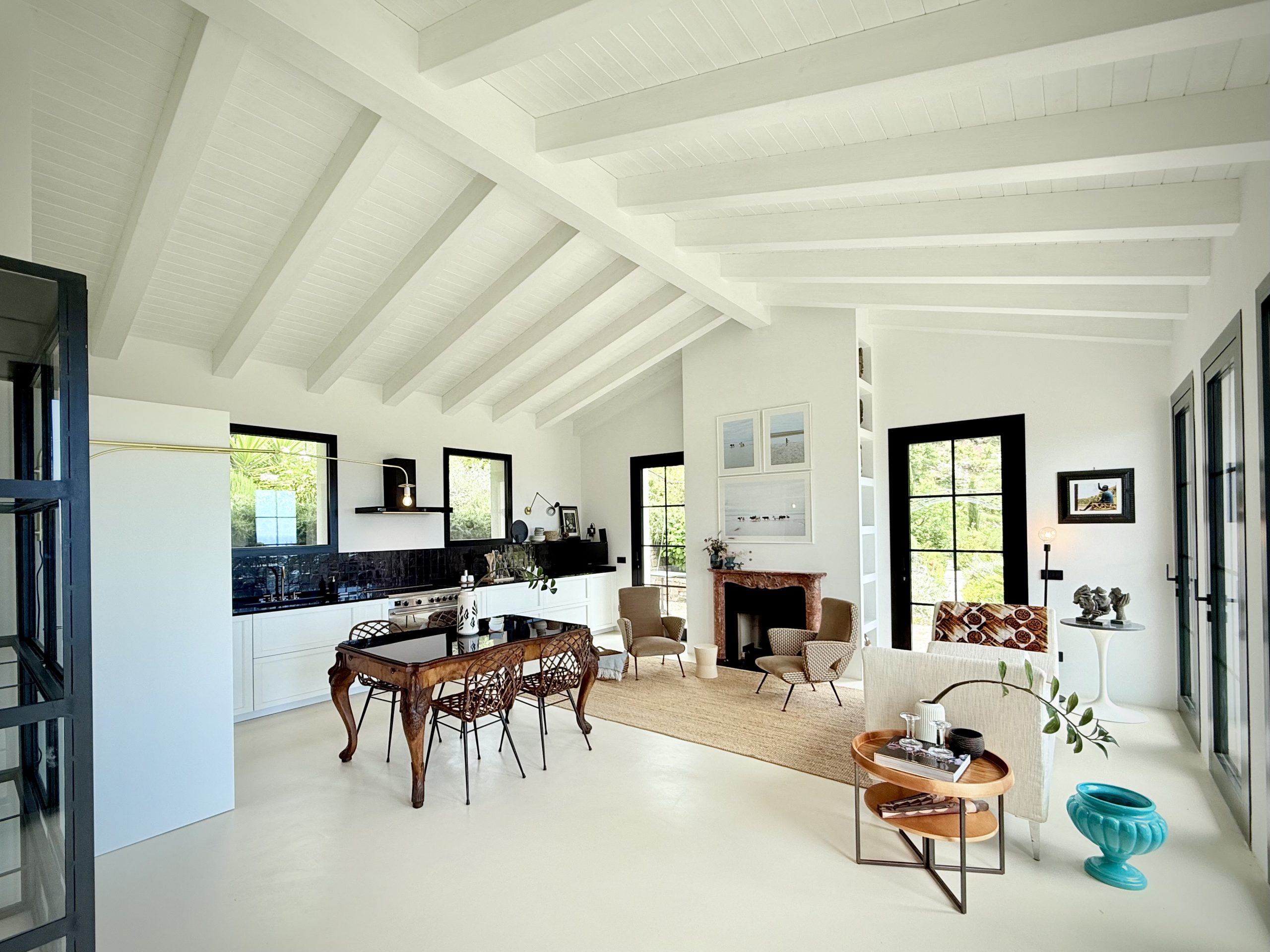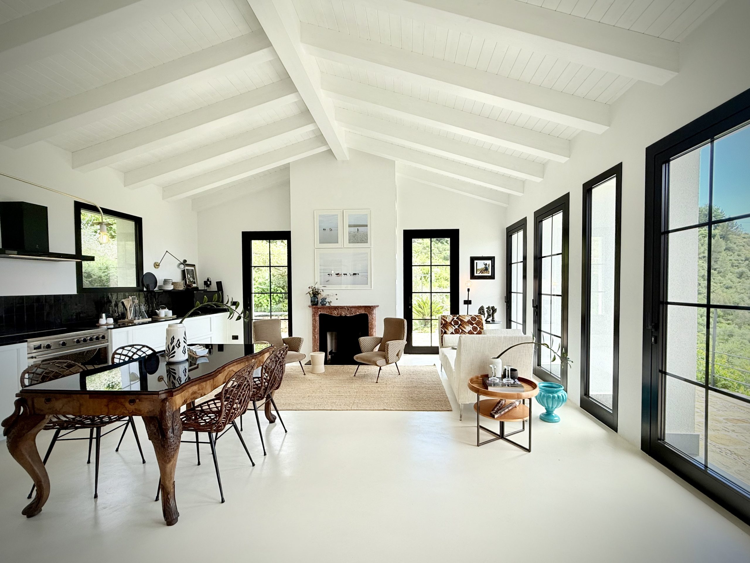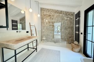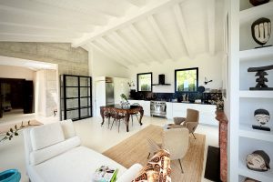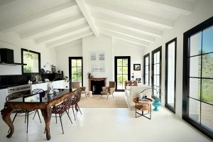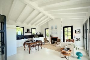 In het nieuwe deel is het leefgedeelte ondergebracht – een open plan ruimte met aan achterzijde een langgerekt keukenblok, en aan voorzijde een eettafel met een comfortabele zithoek met open haard op de kopse kant. Gietvloeren, muren en de open kap van het nieuwe deel zijn geheel wit gehouden. De gietvloer loopt door in het oude deel zijn waar de oude steense muren voor sfeer en intimiteit zorgen. De grootste van de twee slaapkamers, ligt op hetzelfde niveau als de living, terwijl de tweede slaapkamer, zich een aantal treden lager bevindt. Beide hebben een eigen badkamer met douche.