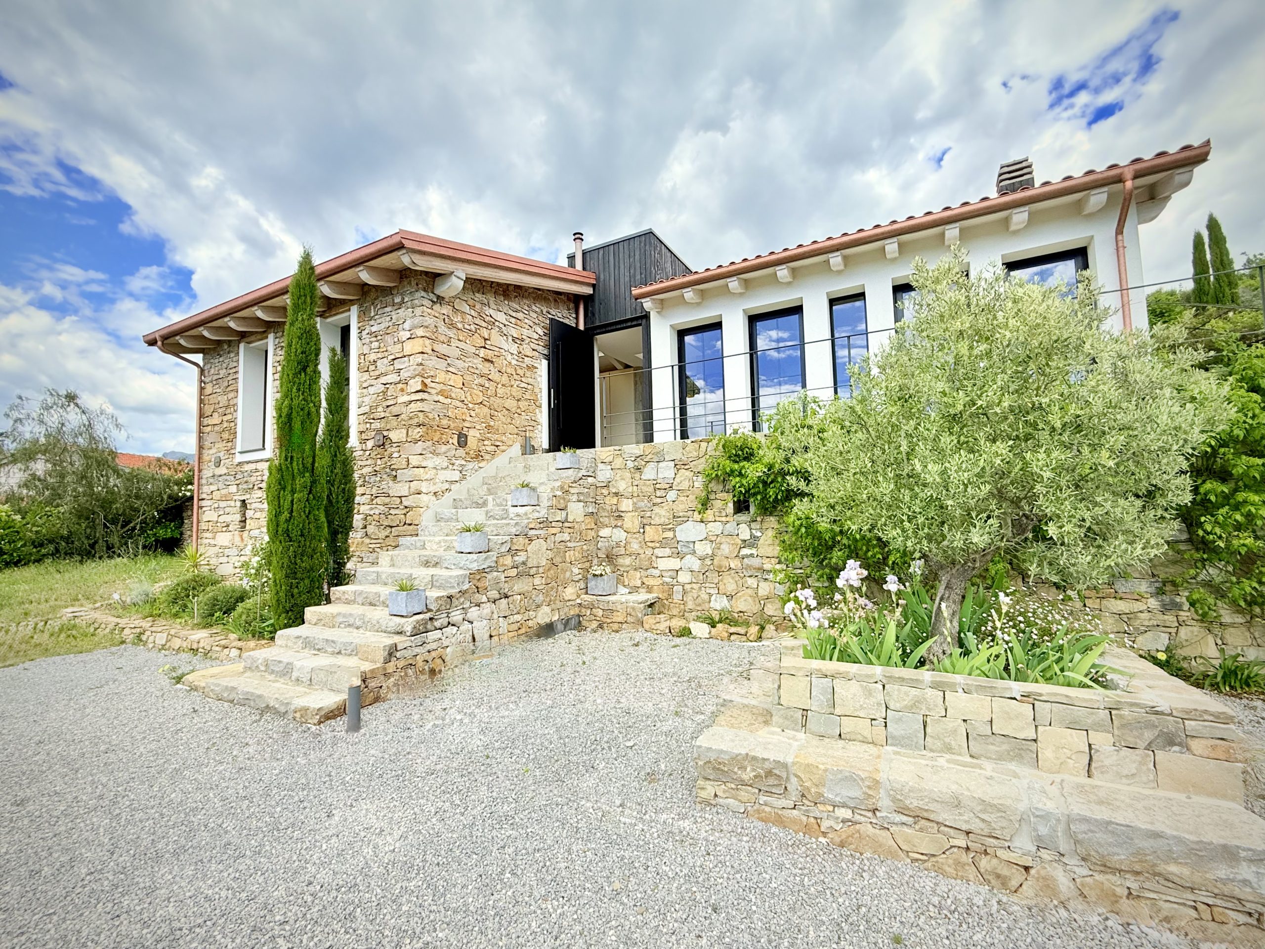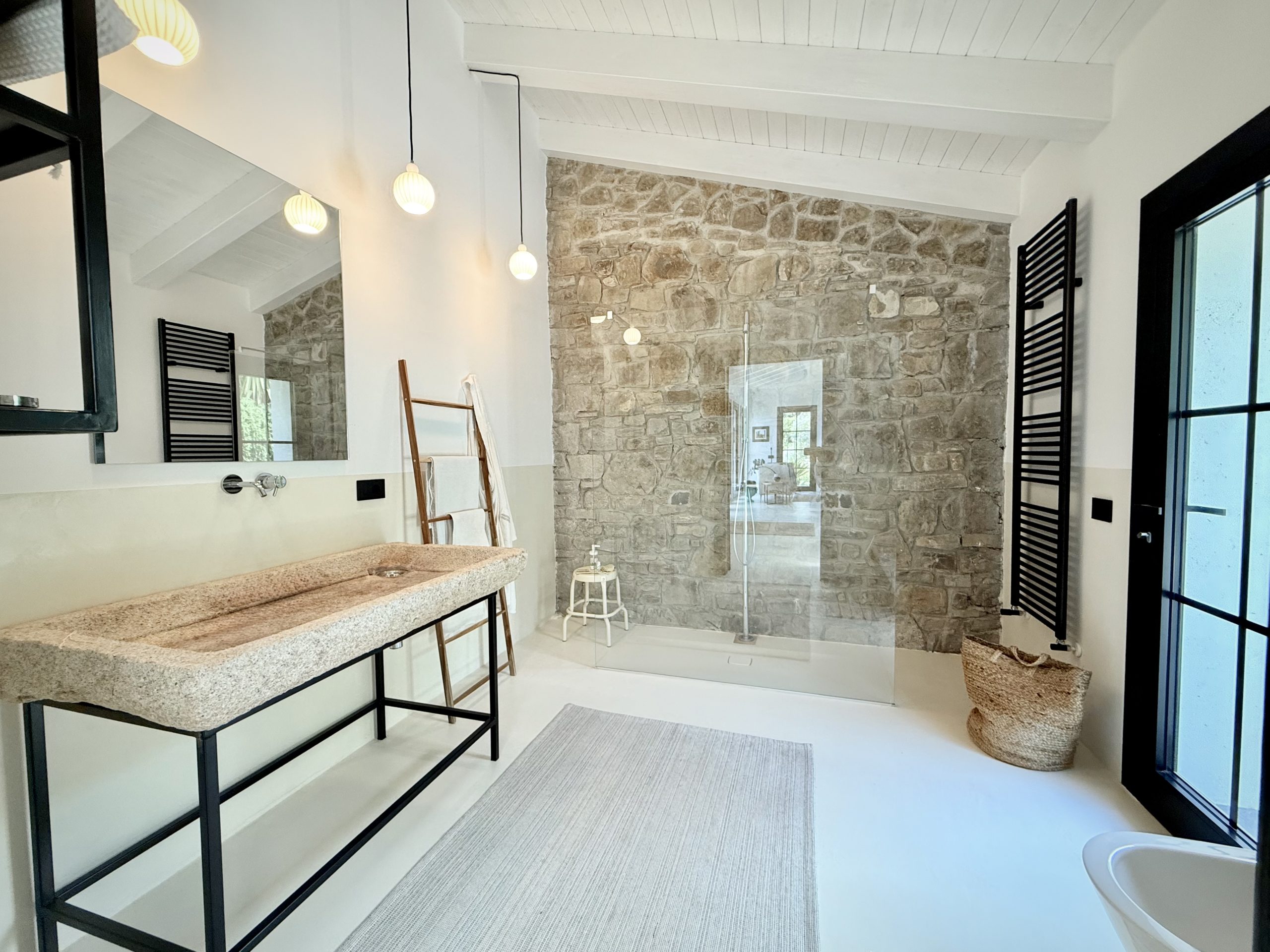 Het was ongetwijfeld de schitterende locatie en het karakter van het natuurstenen pand, dat de huidige eigenaars ertoe bracht hier een heus project te beginnen. De verbouwing van de eenvoudige boerenwoning tot een luxe verblijf met een verdubbeling van het woonoppervlak. Daartoe werd het oorspronkelijke huis uitgebreid met een aanbouw, door een strak zwart betimmerd hal met de oudbouw verbonden.