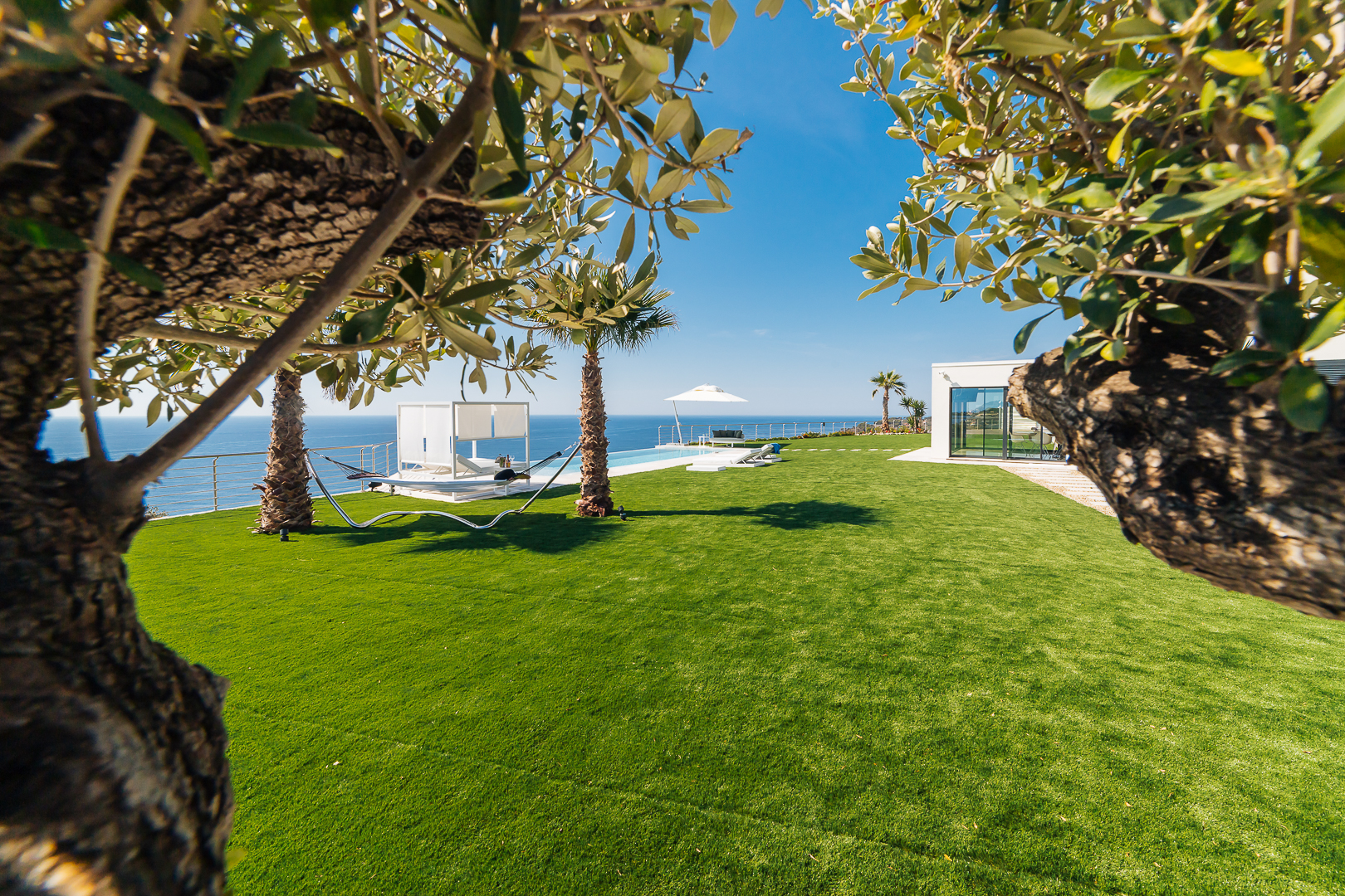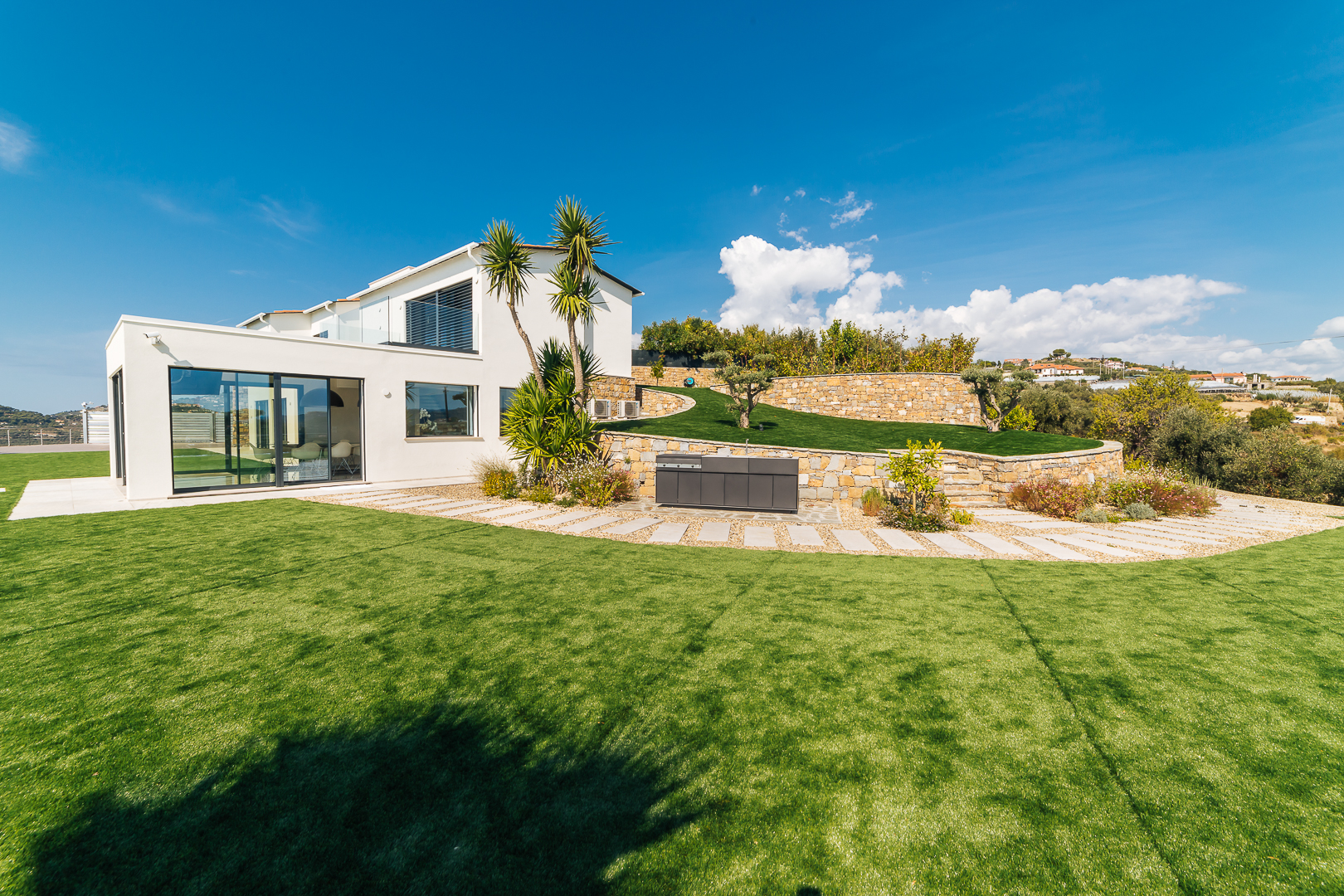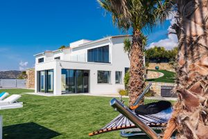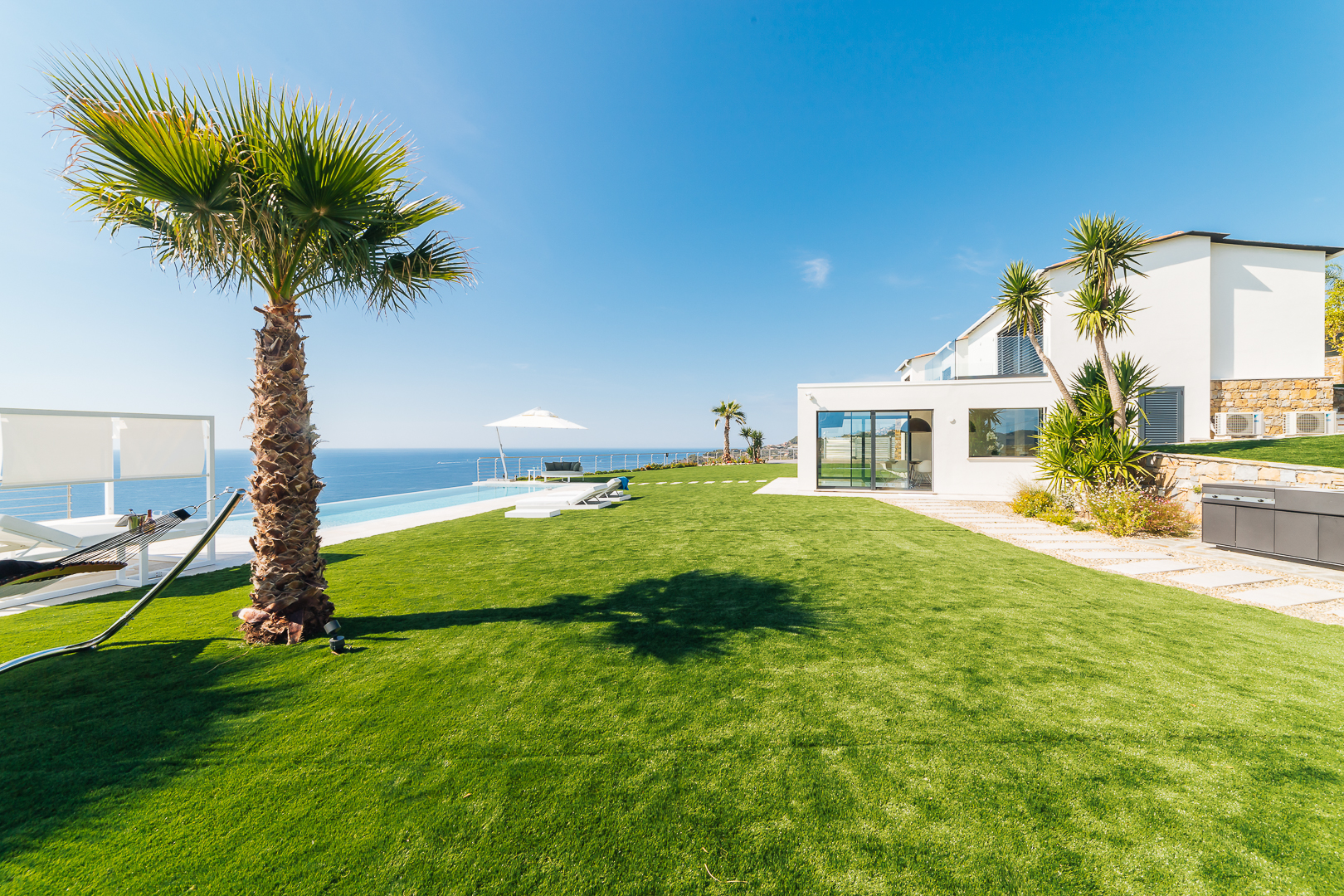 groot terrein rond de villa van ruim 6.000 m2, met aan zeezijde het zwembad met zonneterras. Terras voor de villa en zitjes/terras voor de slaapkamers, terras met vuurkorf, buitenkeuken met BBQ, parkeerplaats (3) in garage met EV oplader
