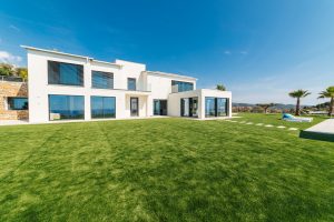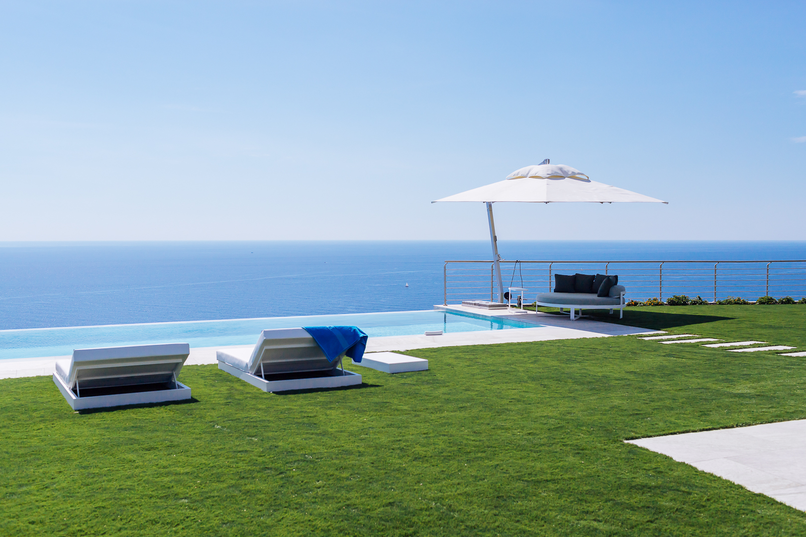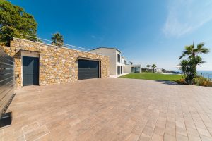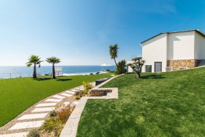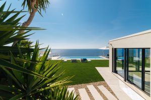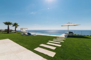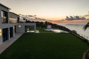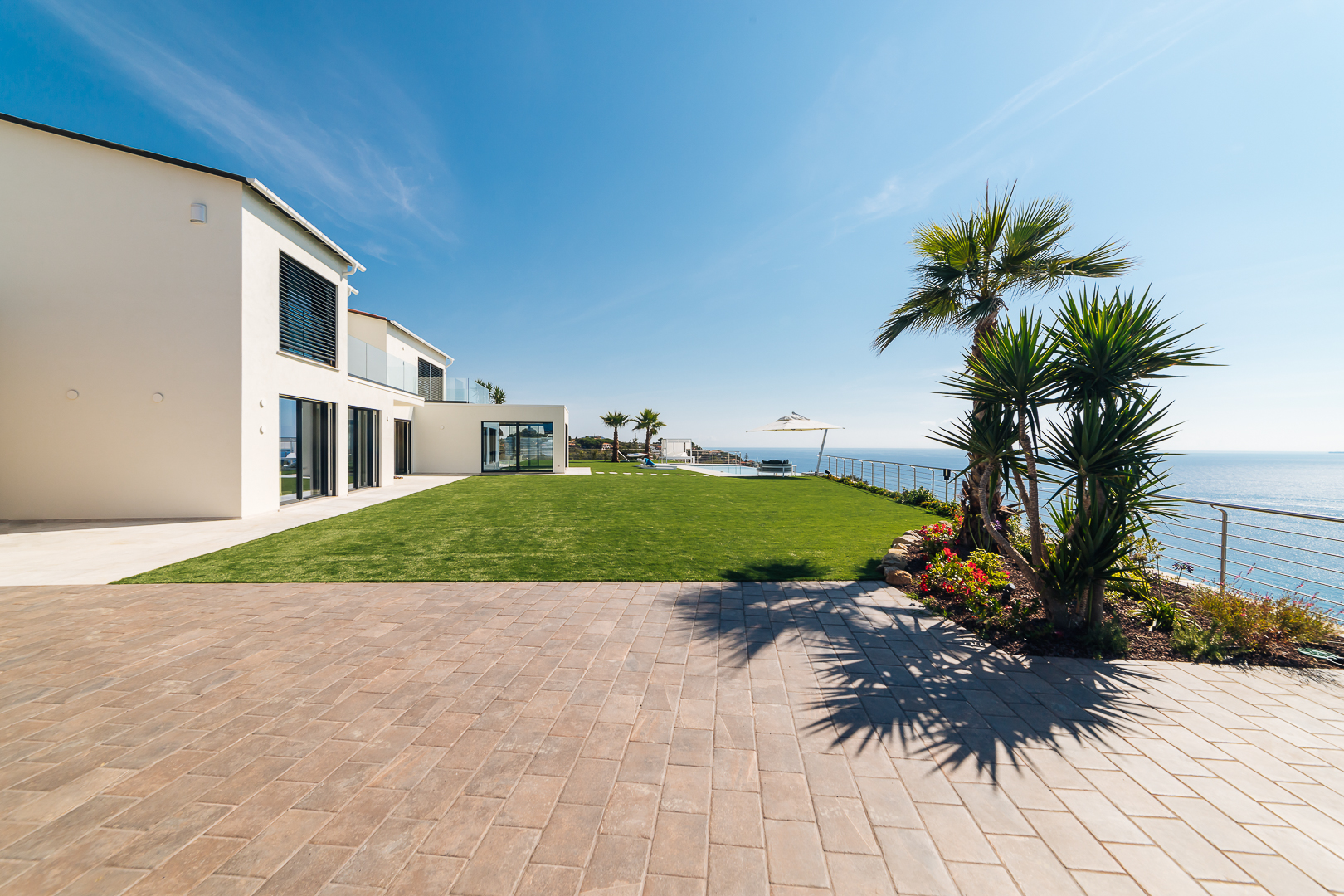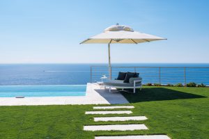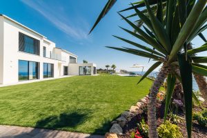 groot terrein rond de villa van ruim 6.000 m2, met aan zeezijde het zwembad met zonneterras. Terras voor de villa en zitjes/terras voor de slaapkamers, terras met vuurkorf, buitenkeuken met BBQ, parkeerplaats (3) in garage met EV oplader