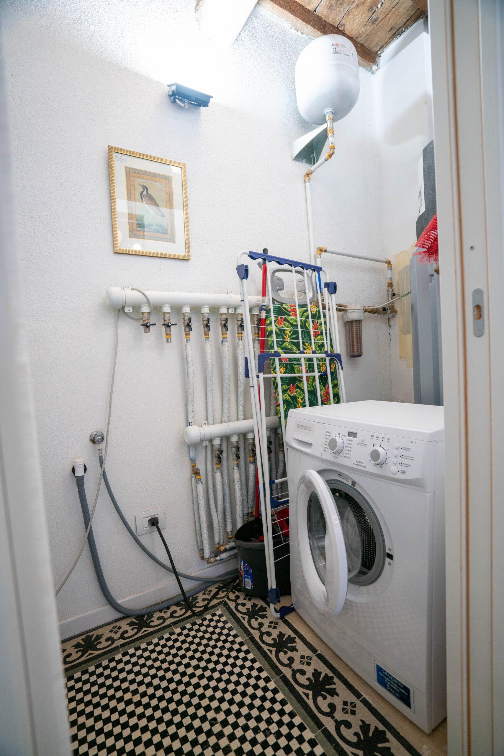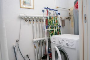 met ontbijttafel, koelkast met vriesvak, oven, vaatwasser, wasmachine. Kleine keukenapparatuur.