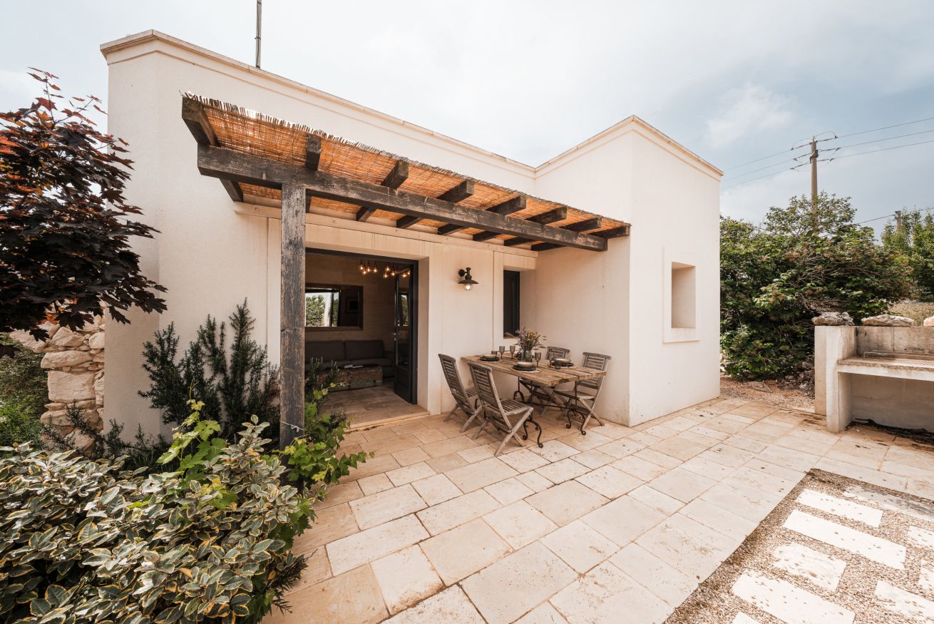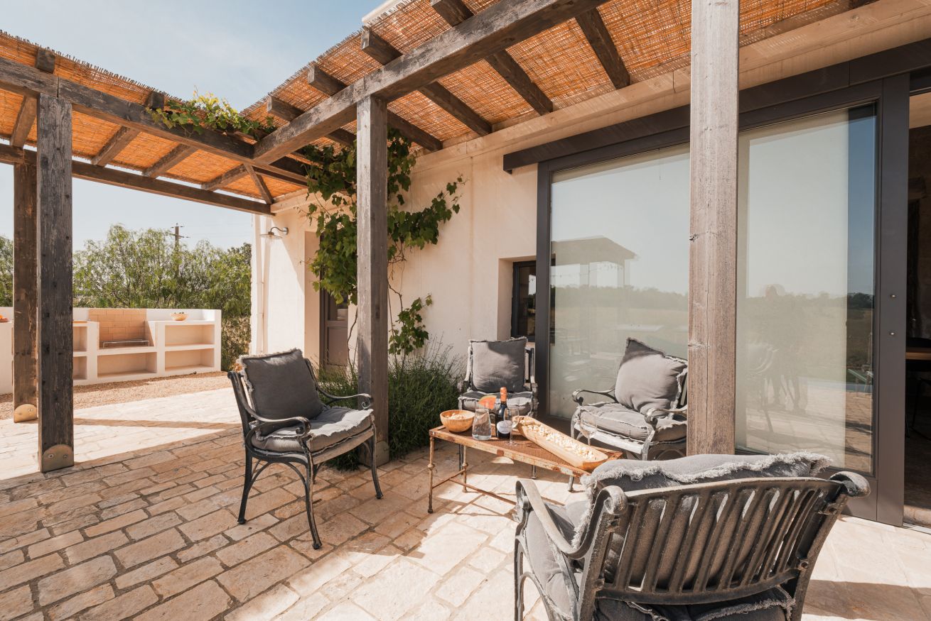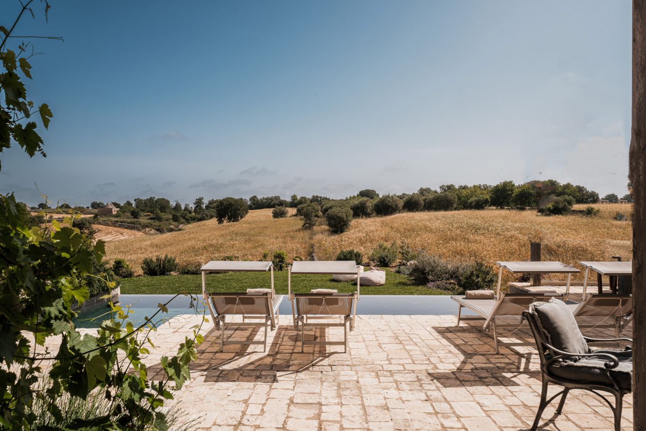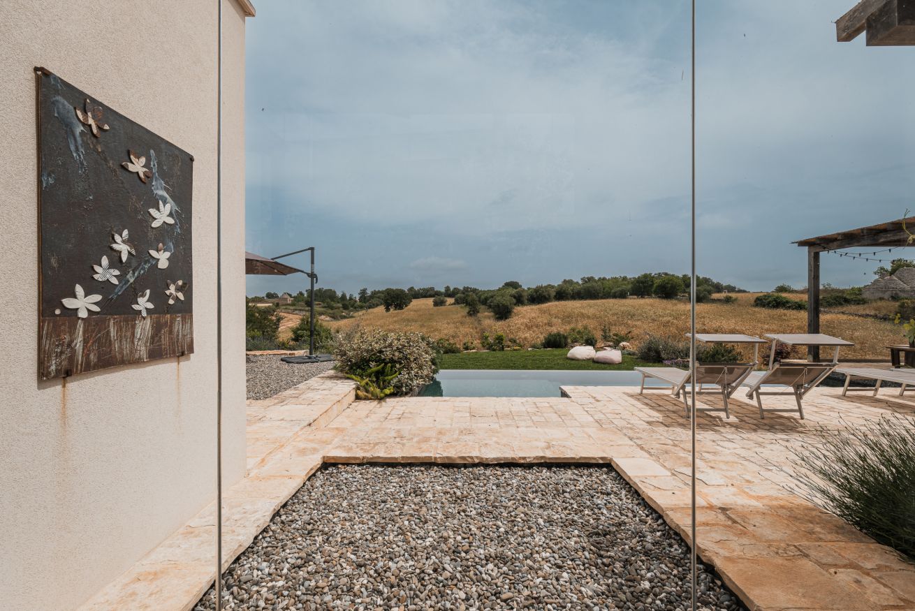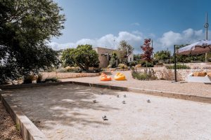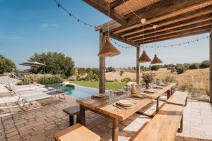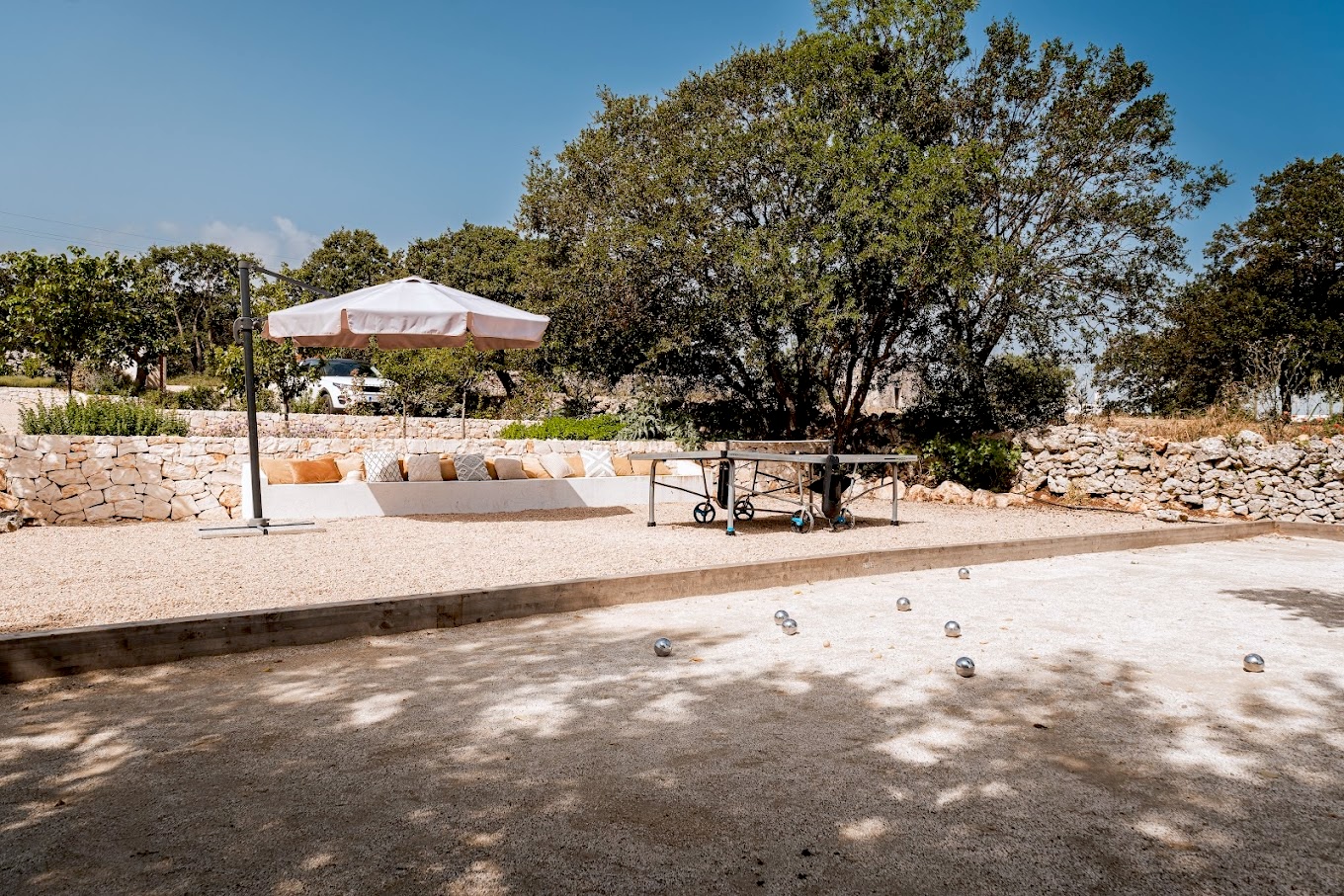 Verder biedt Bab Domè vooral ook buiten enorm veel sfeer en comfort: met een overloop zwembad dat vrij uitzicht biedt op de landelijke omgeving. Een zonneterras net de nodige ligbedden en parasols en een zithoek. Plus een sfeervol overdekt terras met eettafel en een opgemetselde muurbank. Hierachter is de Bbq en de houtgestookte pizzaoven te vinden. Aande achterzijde van de masseria is een open terrein waar een bocce baan is aangelegd. De Italiaanse variant van jeu de boule. Hier staat ook een pingpong tafel zodat er meer dan genoeg te doen is.