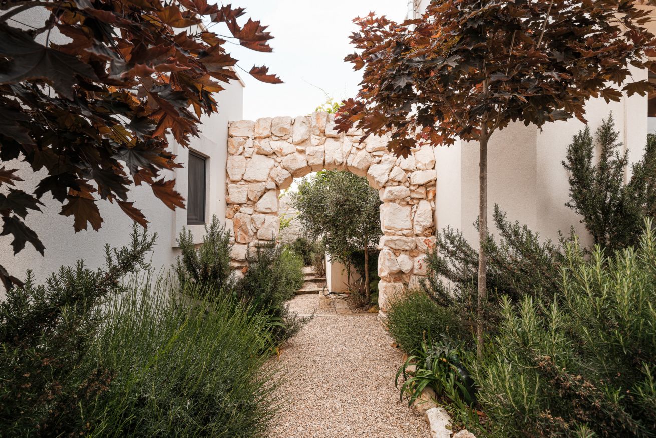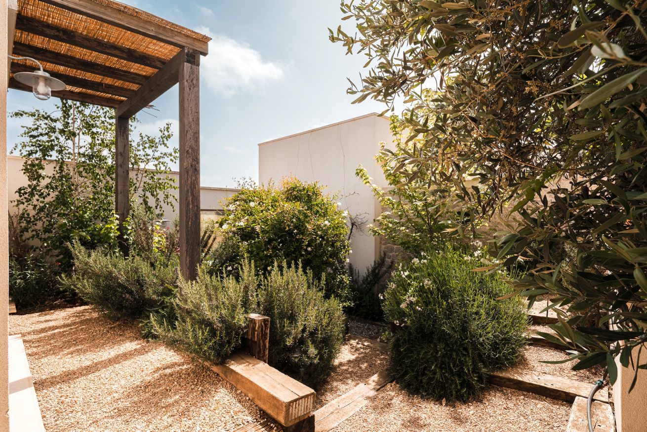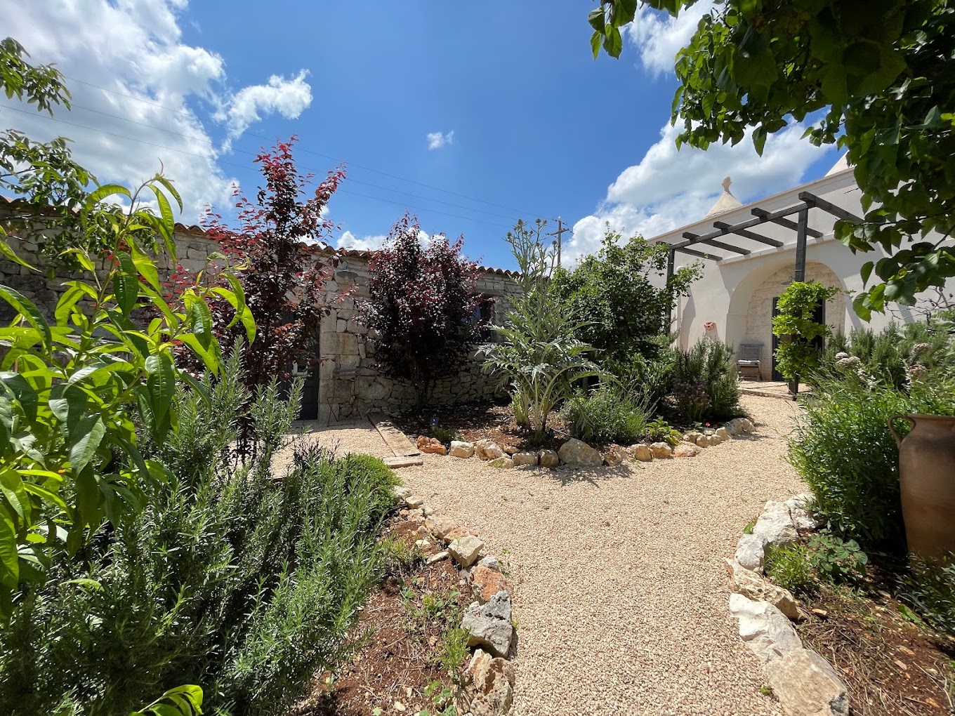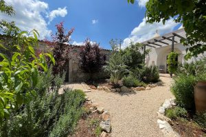 • fraai aangelegde tuin met binnenplaatsjes en paadjes tussen de wooneenheden. Groot terras, deels overdek voor de masseria met pergola met eettafel en opgemetselde zithoek. ~Diverse zitjes in de tuin en een muurbank aan achterzijde bij de bocce baan.