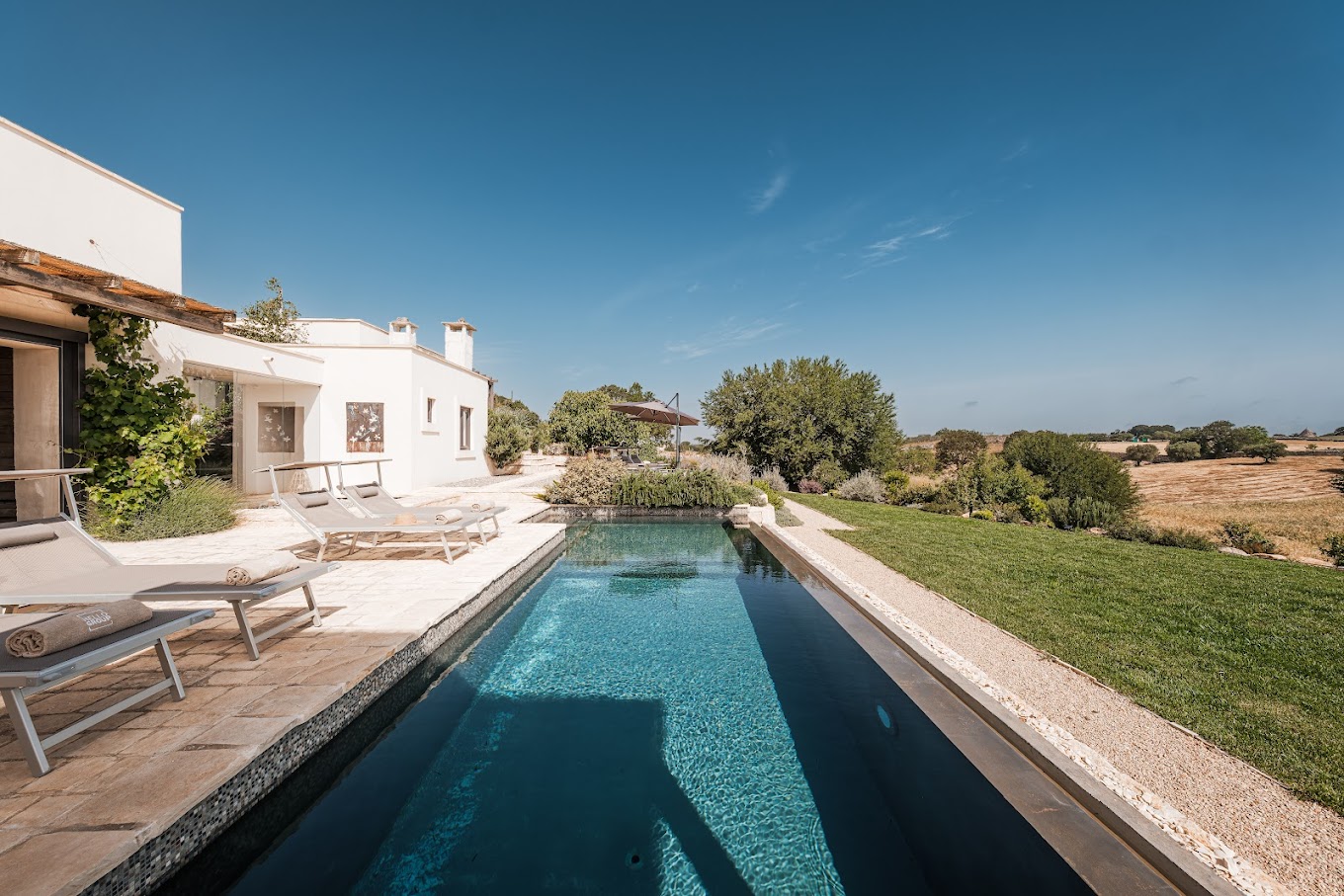 • privé zwembad, 9 x 3,5 m, Zonneterras met ligbedden en parasols.