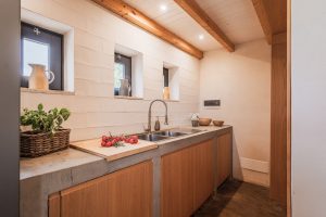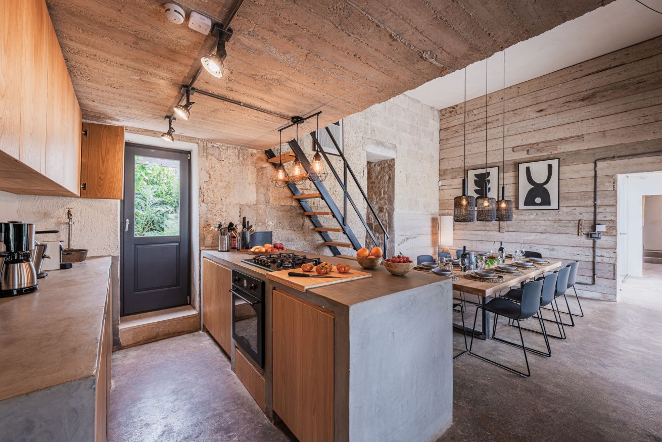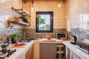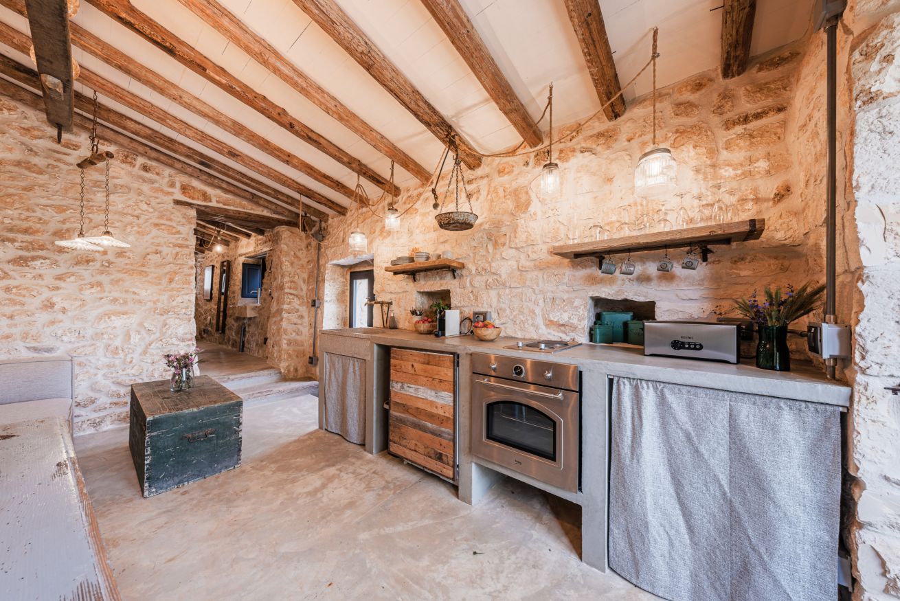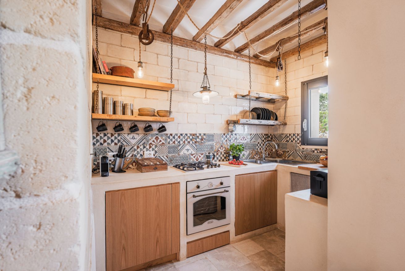 • woonkeuken in de masseria met eettafel voor 12 gasten. kookeiland, koelkast met vriezer, oven, vaatwasser. Bijkeuken met wasmachine en droger. Ook in de trullo is een keukenhoek en in de oude schuur. In de tuin staat een BBQ en een houtgestookte pizzaoven.