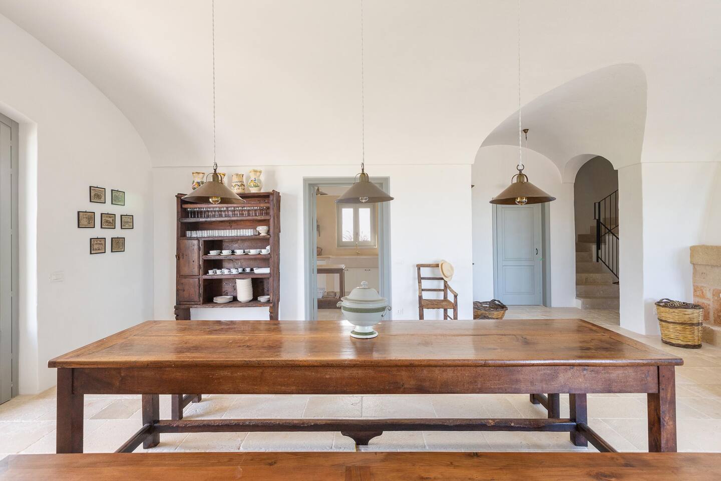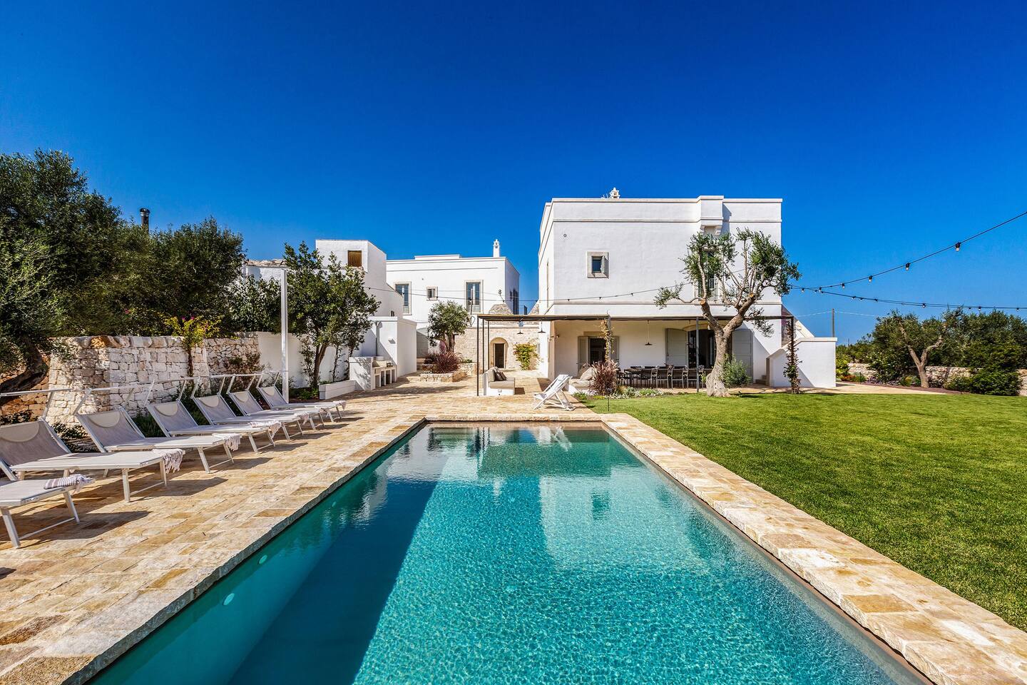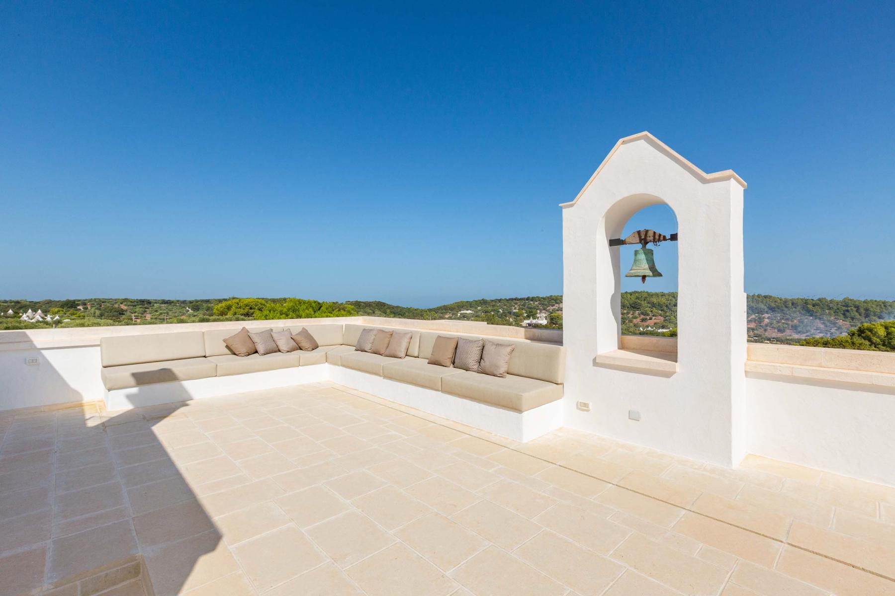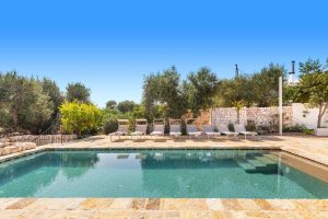 Naast de acht slaapkamers, verdeeld over de twee witgekalkte villa’s en de losse trullo, telt Monte Cisterna een tweetal grote woonkamers in en een grote woonkeuken met stoere eettafel. Buiten zijn er overal overdekte terrassen gemaakt – om buiten te eten en te relaxen. Met als letterlijk hoogtepunt het dakterras met lange muurbanken en een originele klok. Als tweede hoogtepunt geldt het zwembad, ruimbemeten met een groot zonneterras rondom. Overdags een fijne plek om het het gehele gezelschap samen te zijn, en ’s avonds een meer dan sfeervolle buitenruimte, feestelijk verlicht.