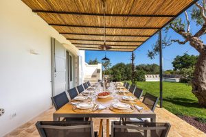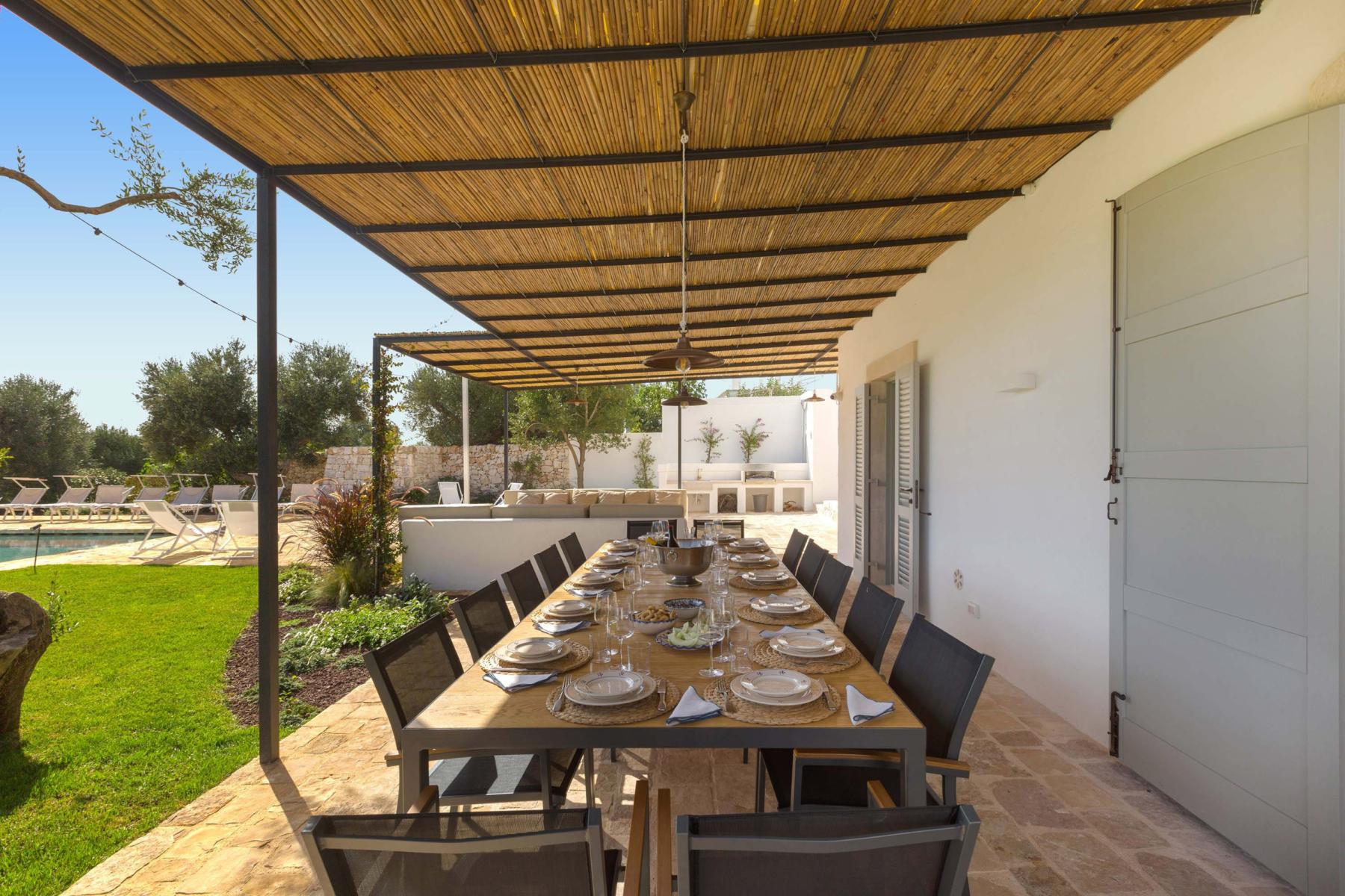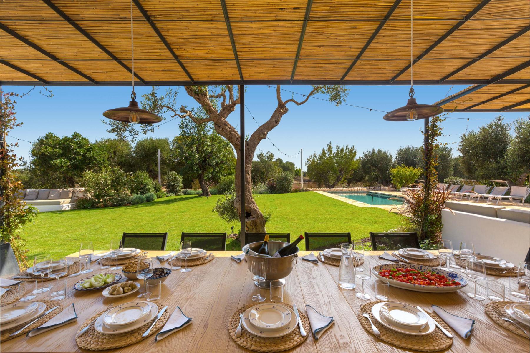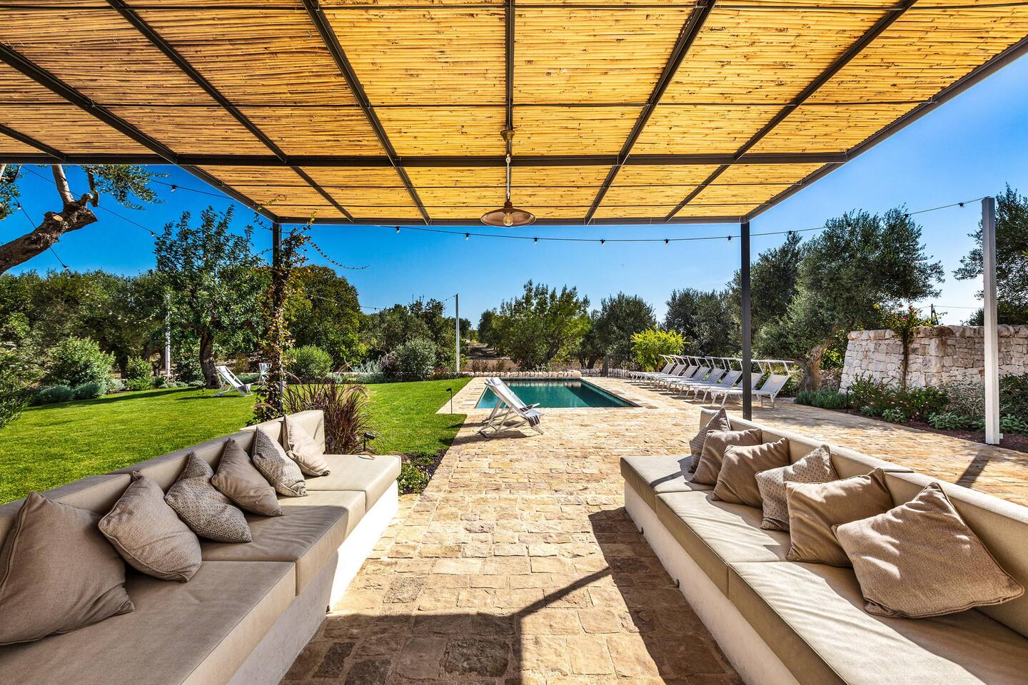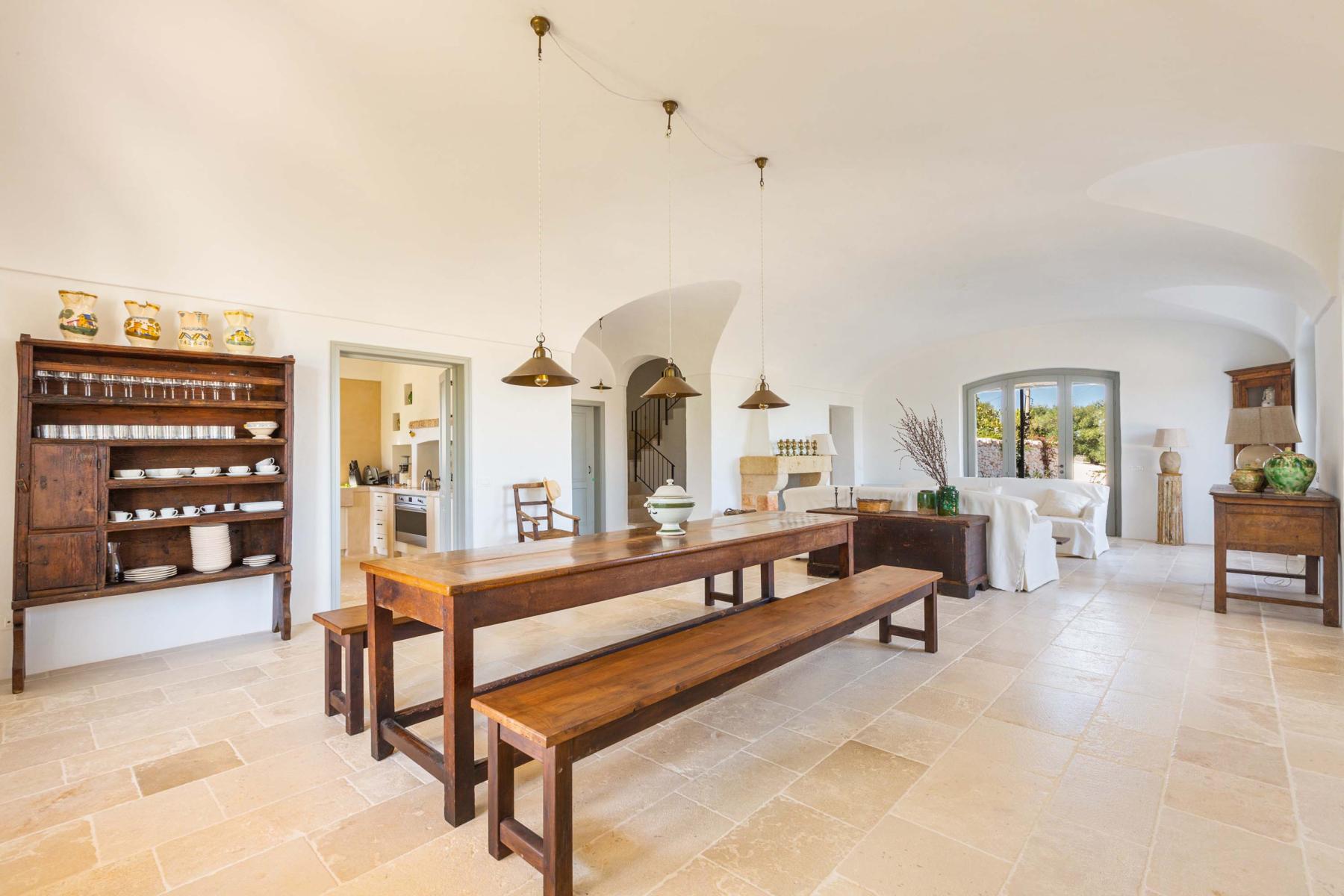 Naast de acht slaapkamers, verdeeld over de twee witgekalkte villa’s en de losse trullo, telt Monte Cisterna een tweetal grote woonkamers in en een grote woonkeuken met stoere eettafel. Buiten zijn er overal overdekte terrassen gemaakt – om buiten te eten en te relaxen. Met als letterlijk hoogtepunt het dakterras met lange muurbanken en een originele klok. Als tweede hoogtepunt geldt het zwembad, ruimbemeten met een groot zonneterras rondom. Overdags een fijne plek om het het gehele gezelschap samen te zijn, en ’s avonds een meer dan sfeervolle buitenruimte, feestelijk verlicht.