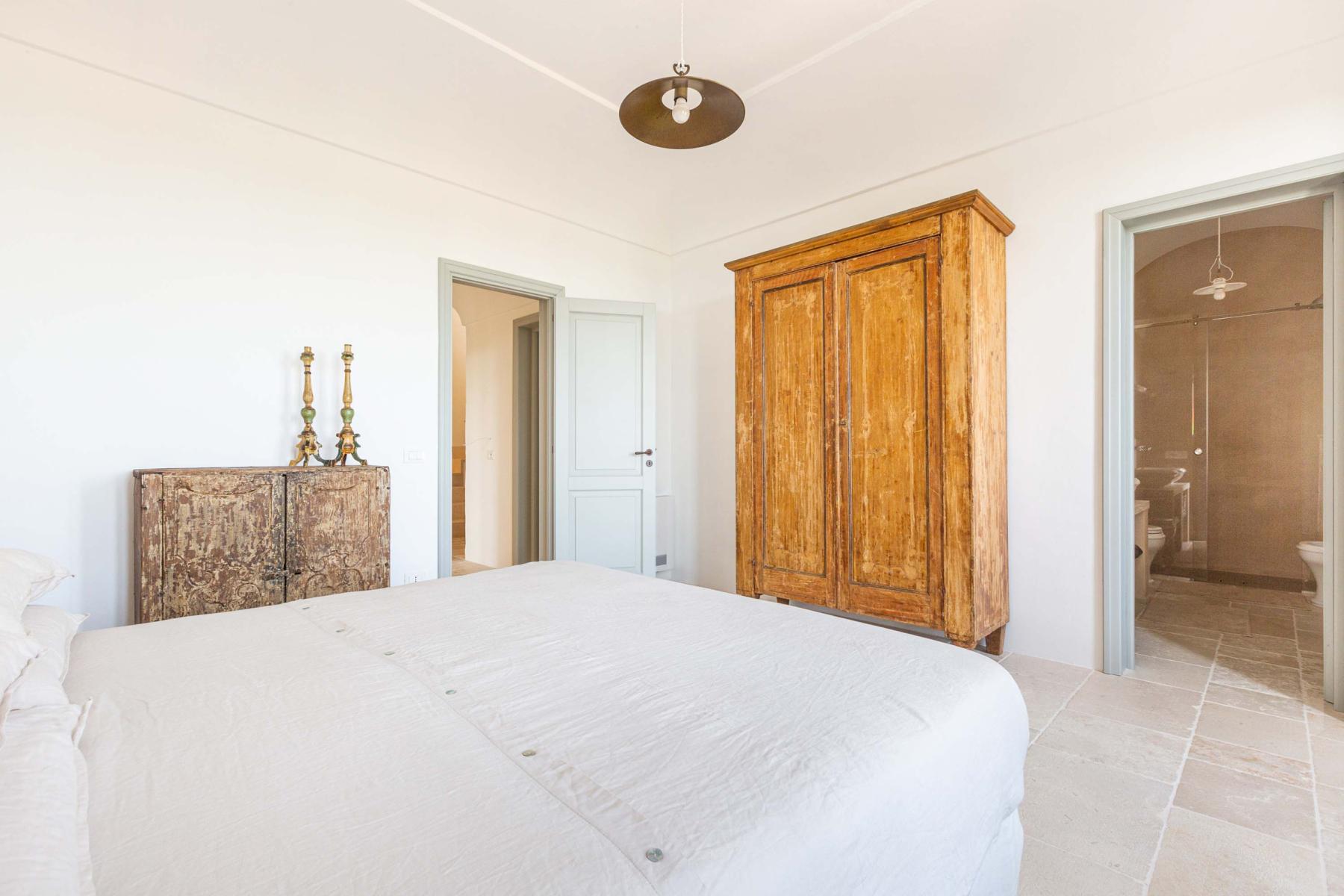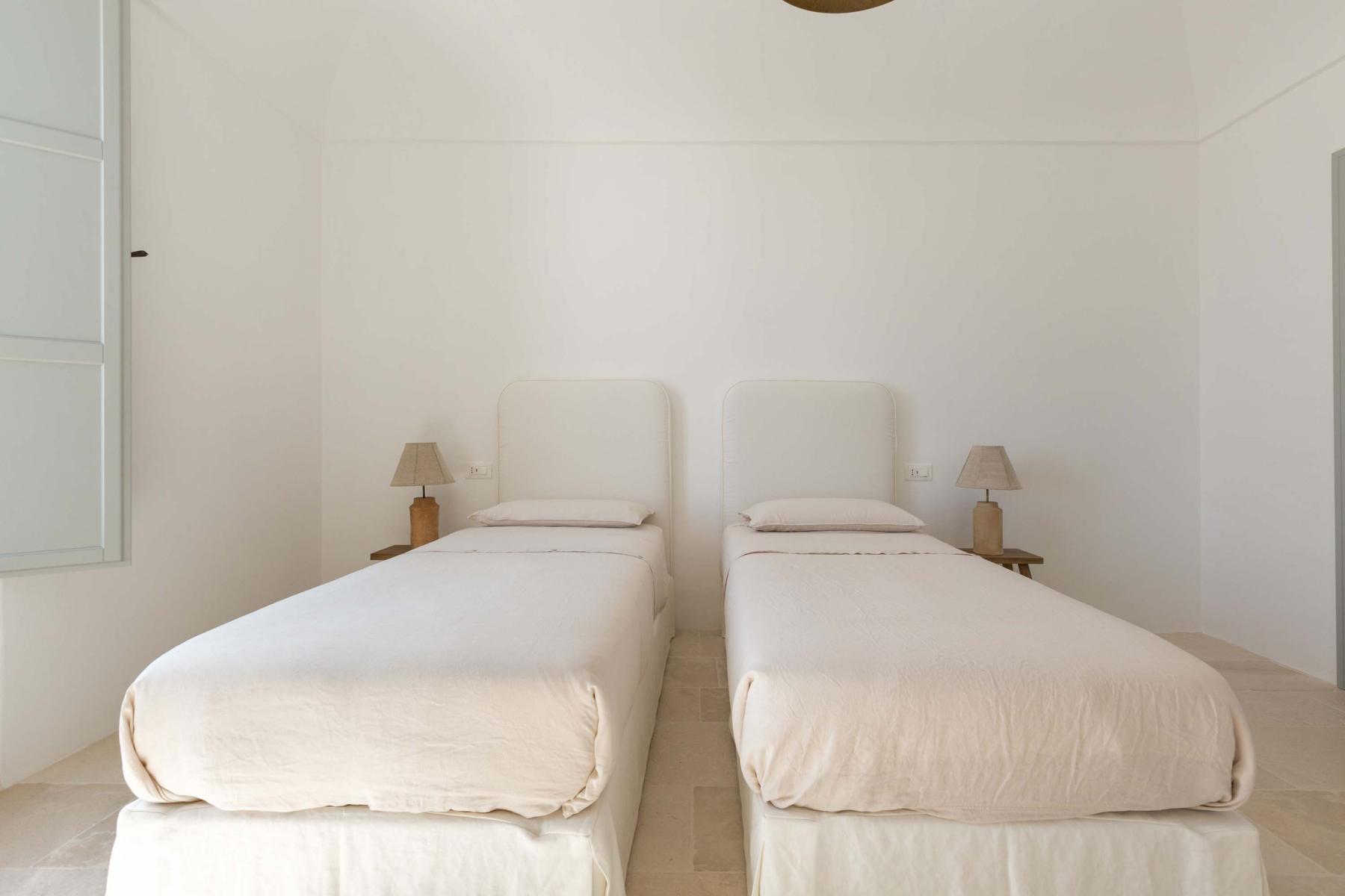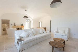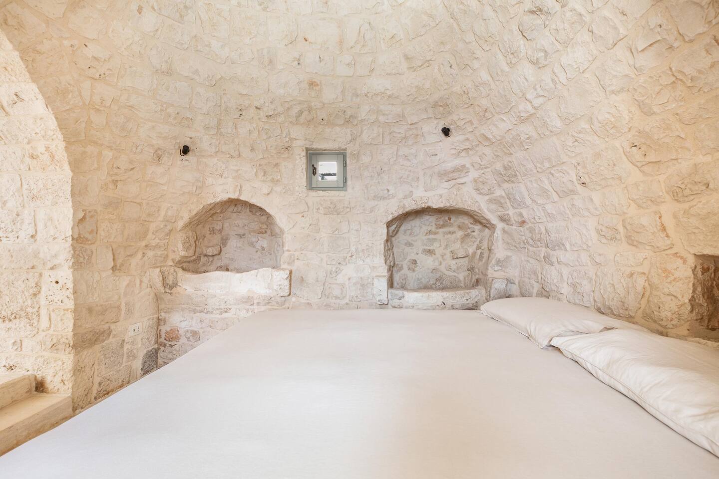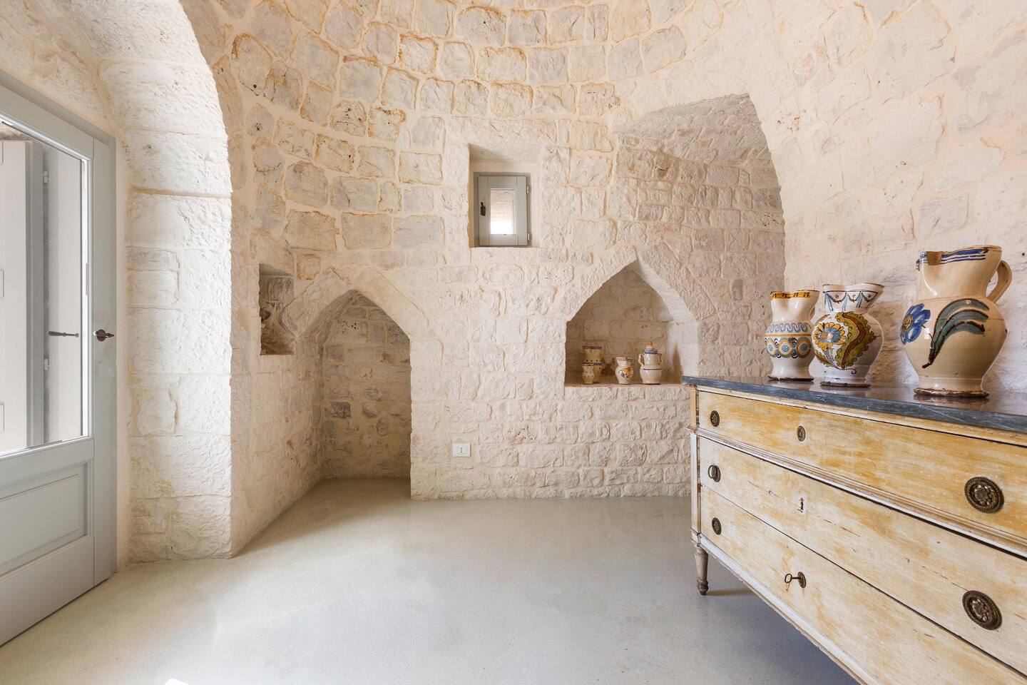 Met in totaal acht slaapkamers en een tweetal extra bedden, biedt Monte Cisterna ruim plaats aan maximaal achttien gasten. Een fraaie masseria, bestaand uit twee grote huizen met fraaie gewelven, imposante haardpartijen en schitterende marmeren chianchi vloeren. Met elkaar verbonden door een tweetal trulli met daarnaast nog een vrijstaande trullo die extra charme aan het geheel verlenen. Het geheel op ingetogen wijze ingericht, veelal in wit gecontrasteerd met oude boeren meubels en kasten die een duidelijke verwijzing naar het boeren verleden van deze masseria die nog maar recent van bouwval in deze prachtige masseria veranderde.