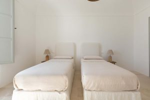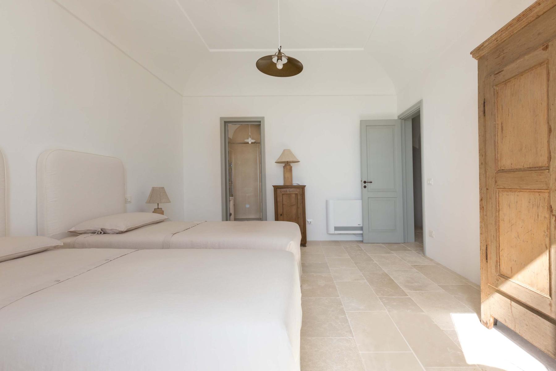 slaapkamers waarvan 1 slaapkamer in de study met comfortabel tweepersoons bed en eigen badkamer. 1 op de begane grond. 1 in de annex. In totaal 5 tweepersoons slaapkamer en 4 kamers met twee losse bedden. Alle met airco en horren. De 4 slaapkamers in de hoofdmasseria zijn per lift bereikbaar.