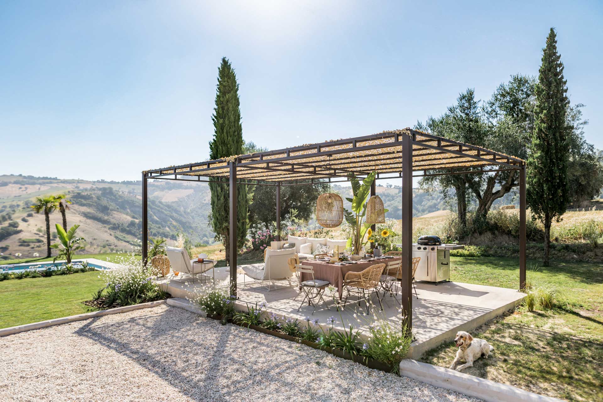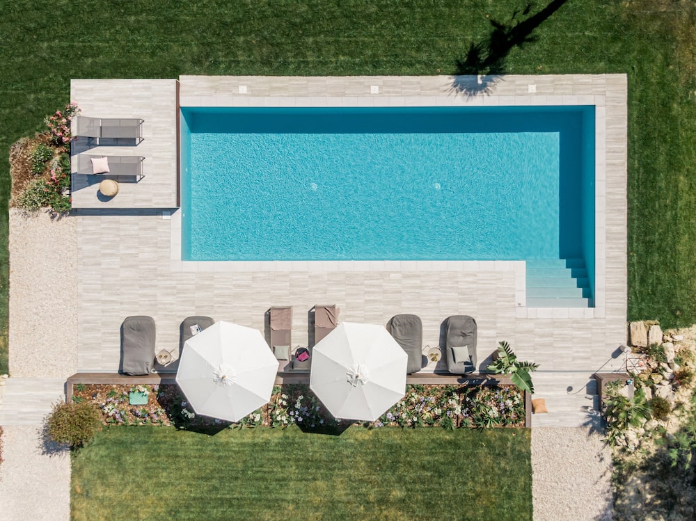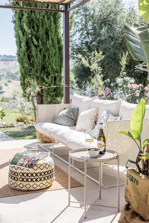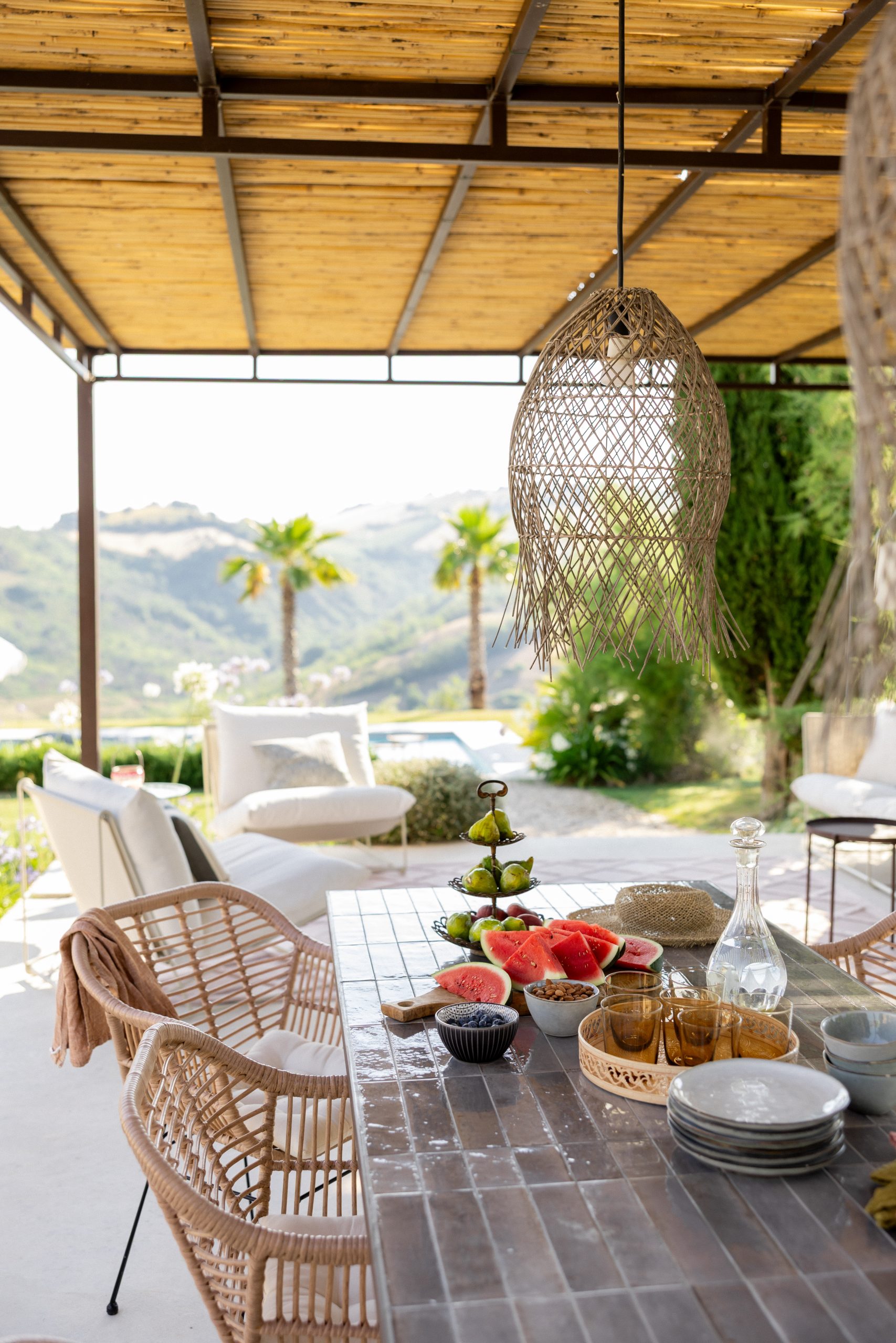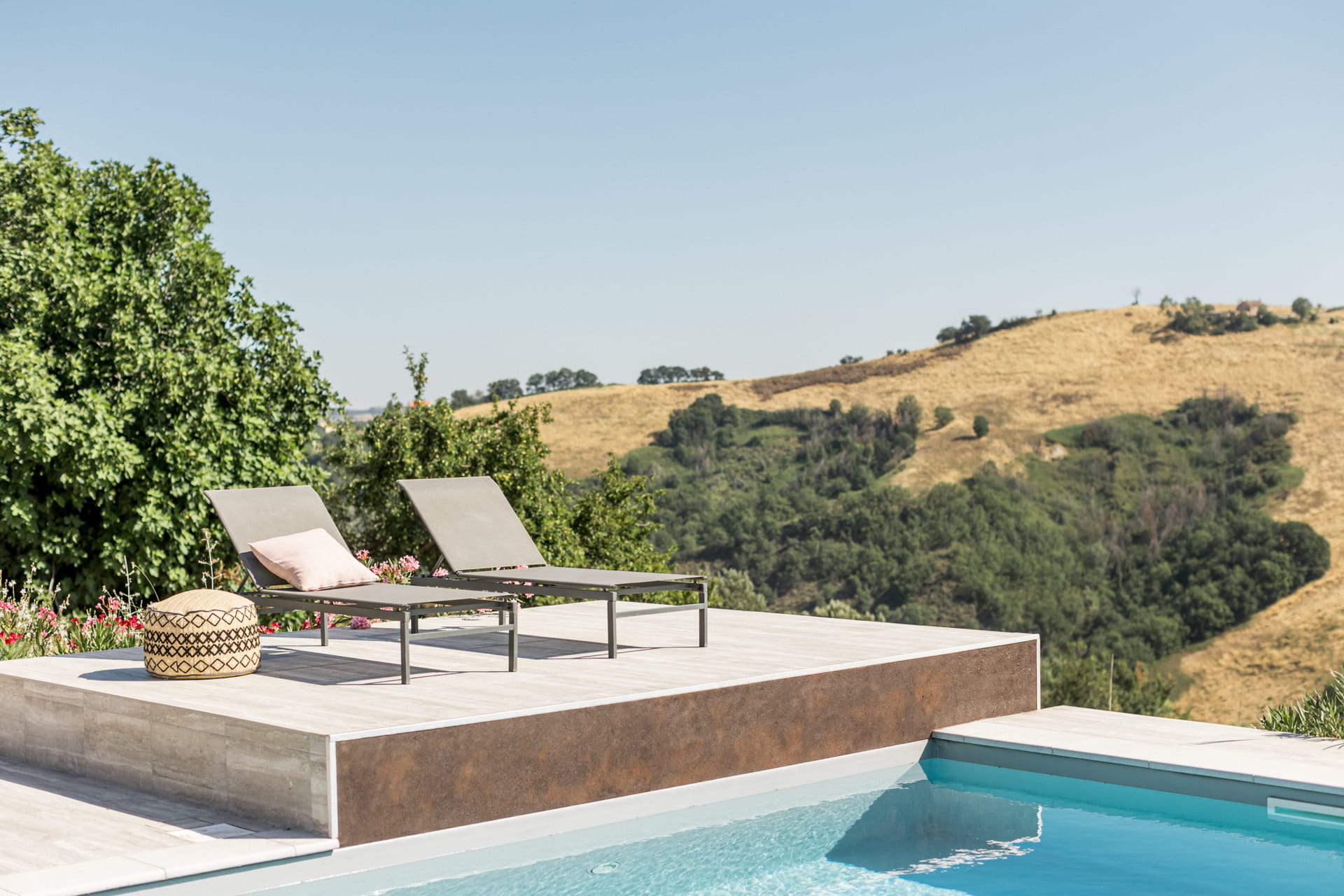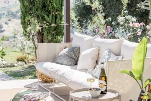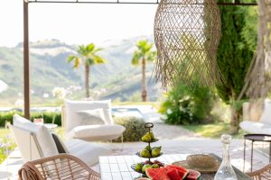 Met rondom het huis diverse zitplekken en een overdekt terras in de tuin met eettafel en een buitenkeuken, is er overal wel een plek om van het 360 graden uitzicht te genieten. Een van de mooiste plekken is evenwel het verhoogde zonneterras met twee ligbedden bij het zwembad. Uiteraard is er voor de overige gasten het zonneterras met ligbedden en ligkussen, direct naast het zwembad dat desgewenst verwarmd kan worden.