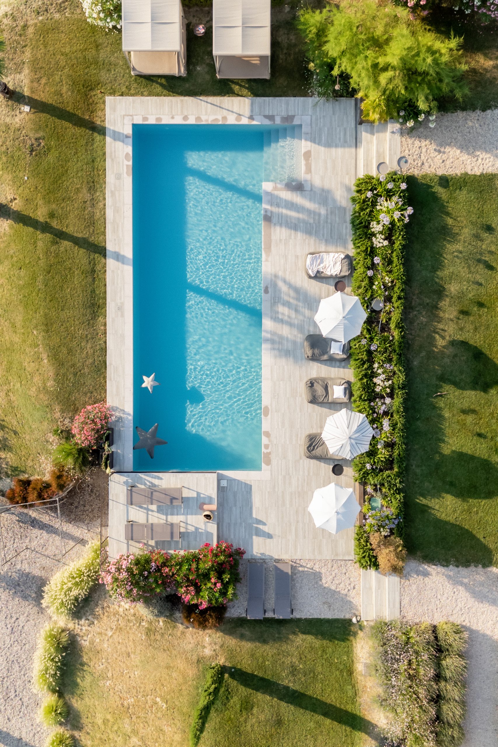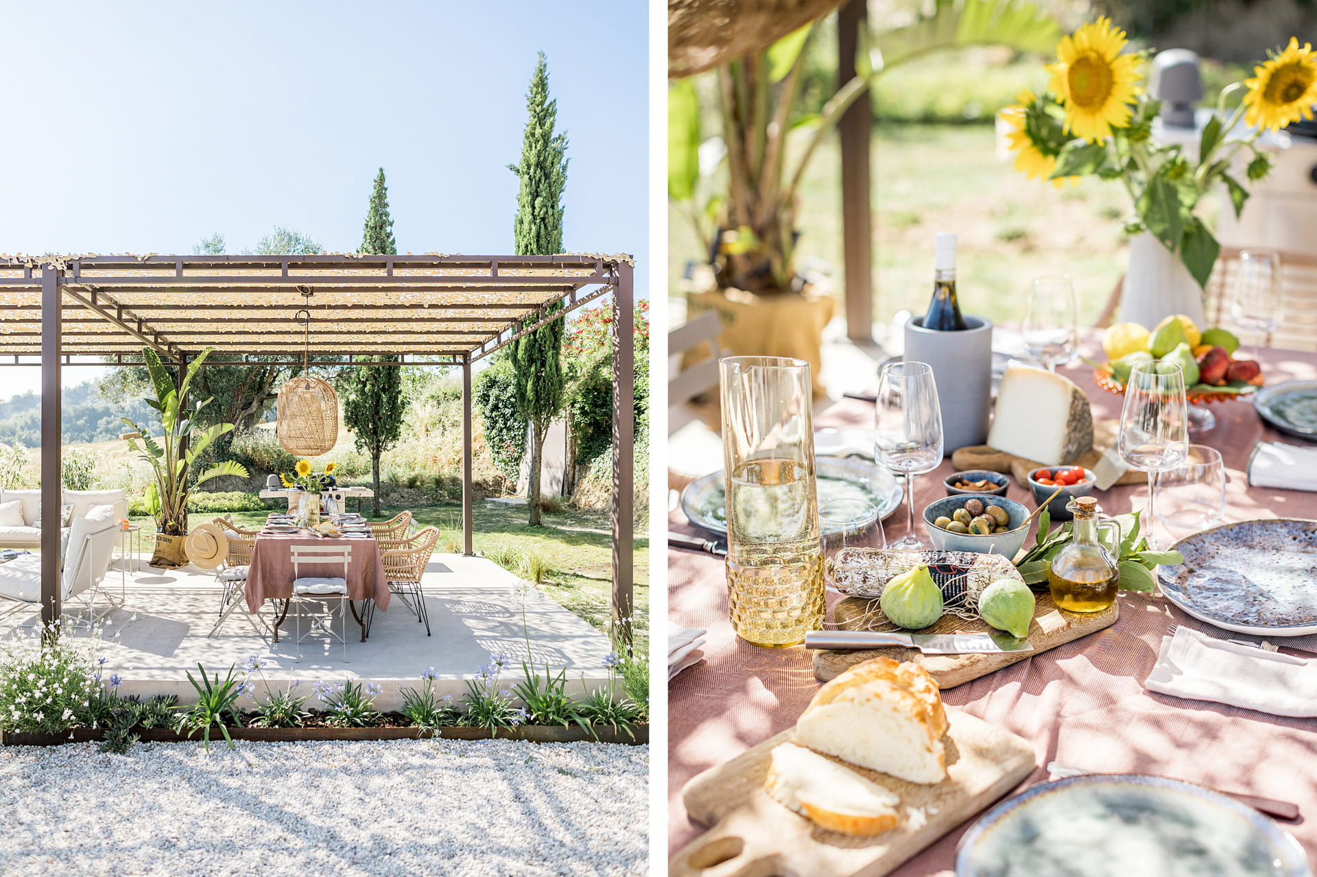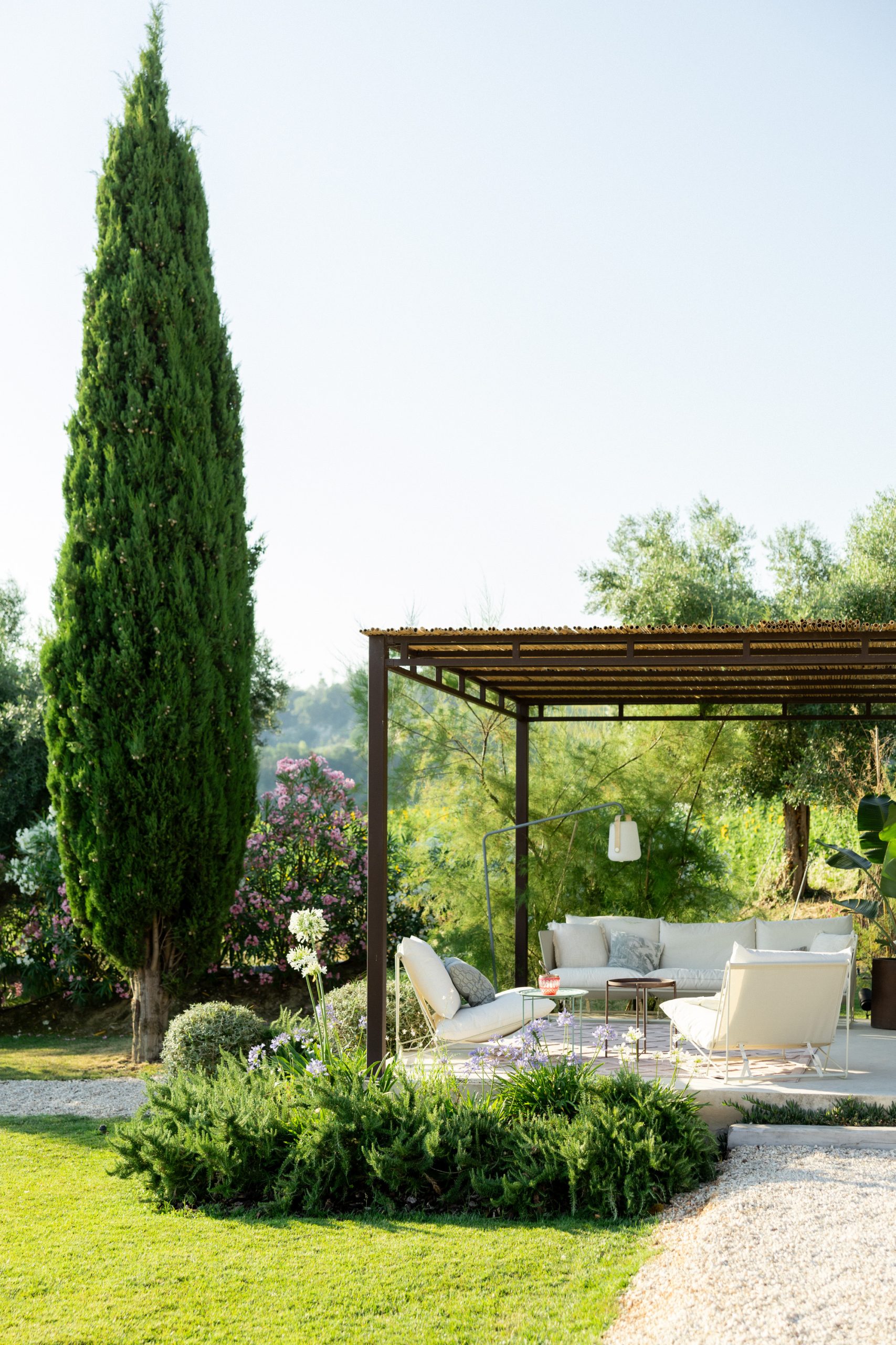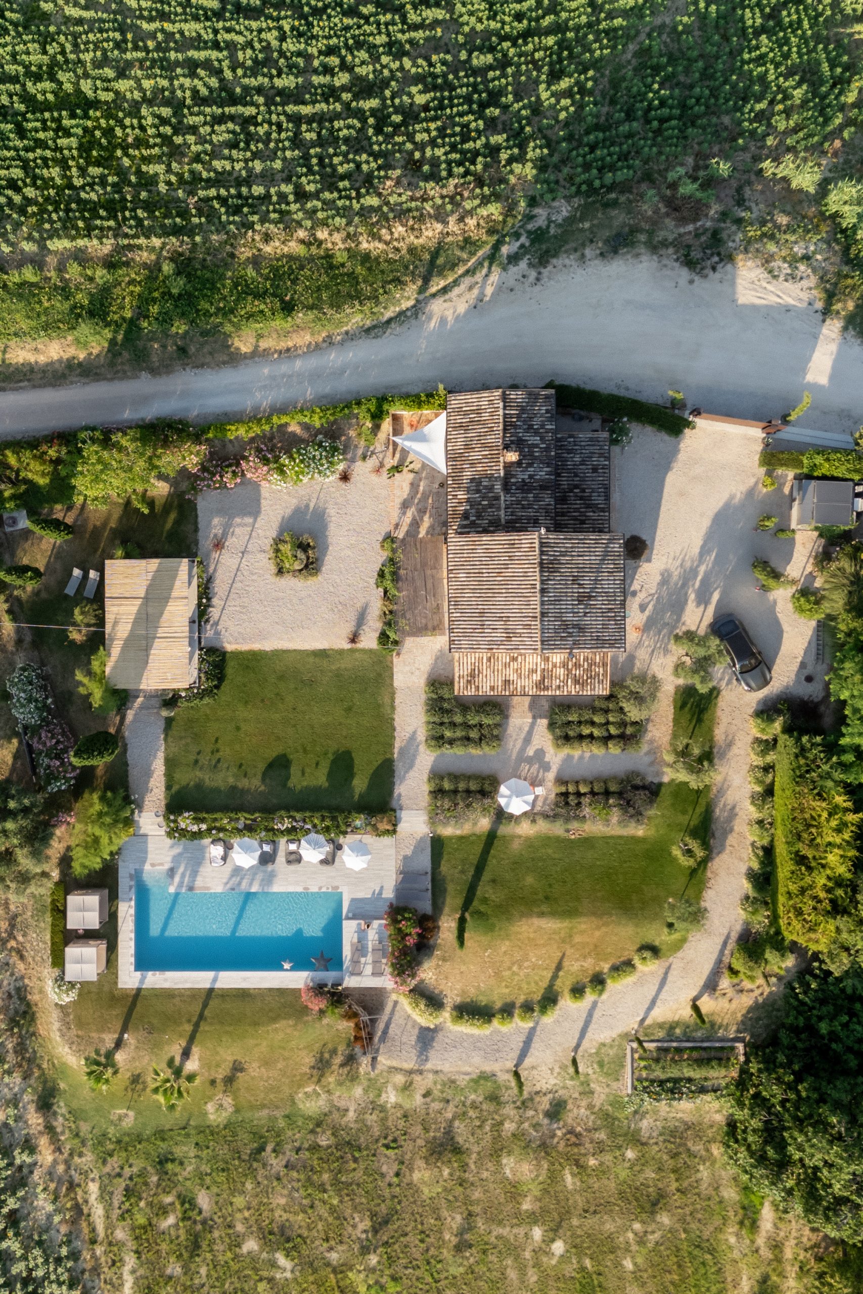 Met rondom het huis diverse zitplekken en een overdekt terras in de tuin met eettafel en een buitenkeuken, is er overal wel een plek om van het 360 graden uitzicht te genieten. Een van de mooiste plekken is evenwel het verhoogde zonneterras met twee ligbedden bij het zwembad. Uiteraard is er voor de overige gasten het zonneterras met ligbedden en ligkussen, direct naast het zwembad dat desgewenst verwarmd kan worden.