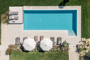 privé zwembad, 13 x 5 m, max 1.4 m diep, verwarmbaar (tegen extra kosten). Zonneterras met ligbedden en ligkussen, buitendouche.