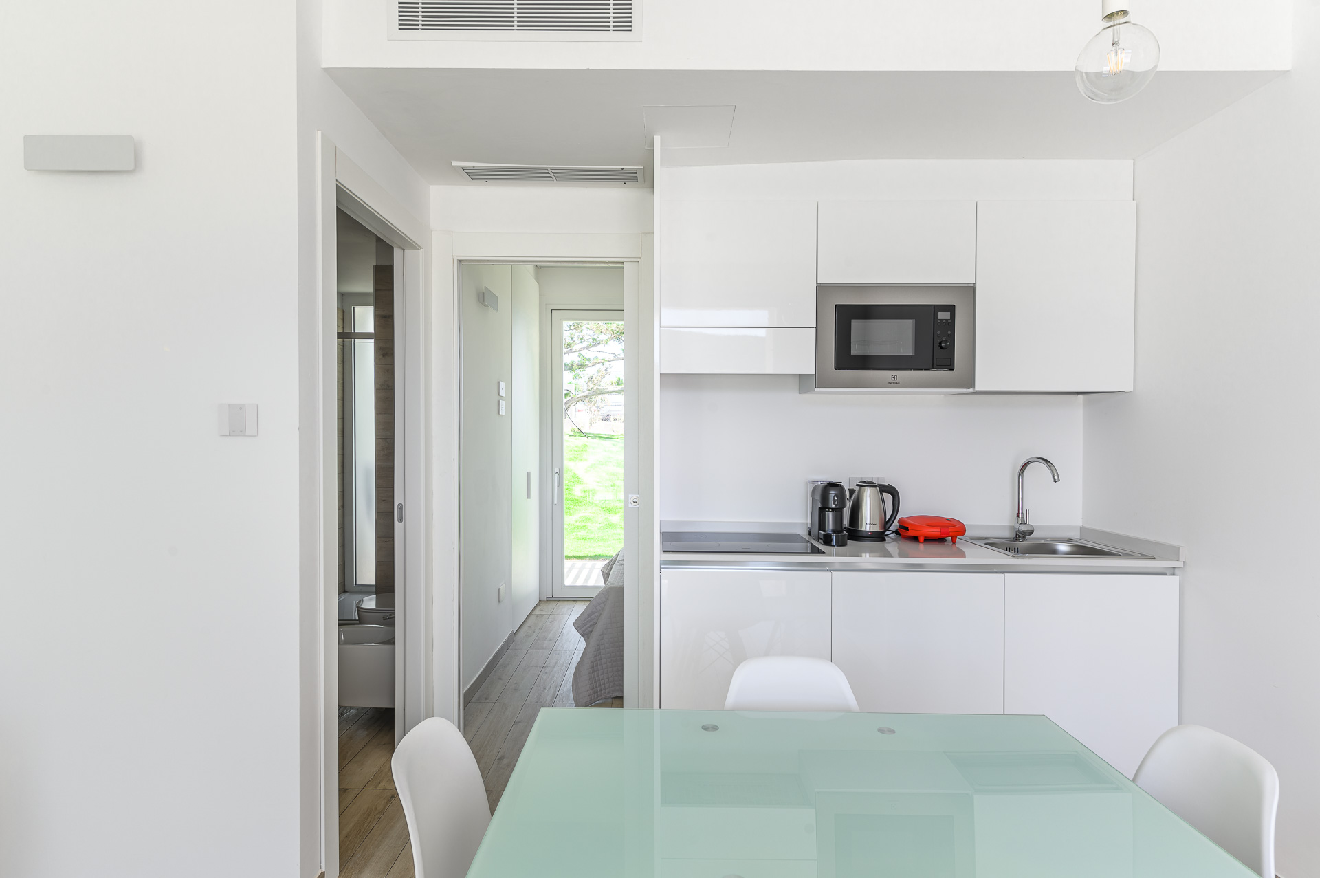 keukenhoek met inductie kookplaat, koelkast, magnetron, vaatwasser, waterkoker, koffiezet apparaat (capsules), broodrooster.