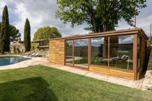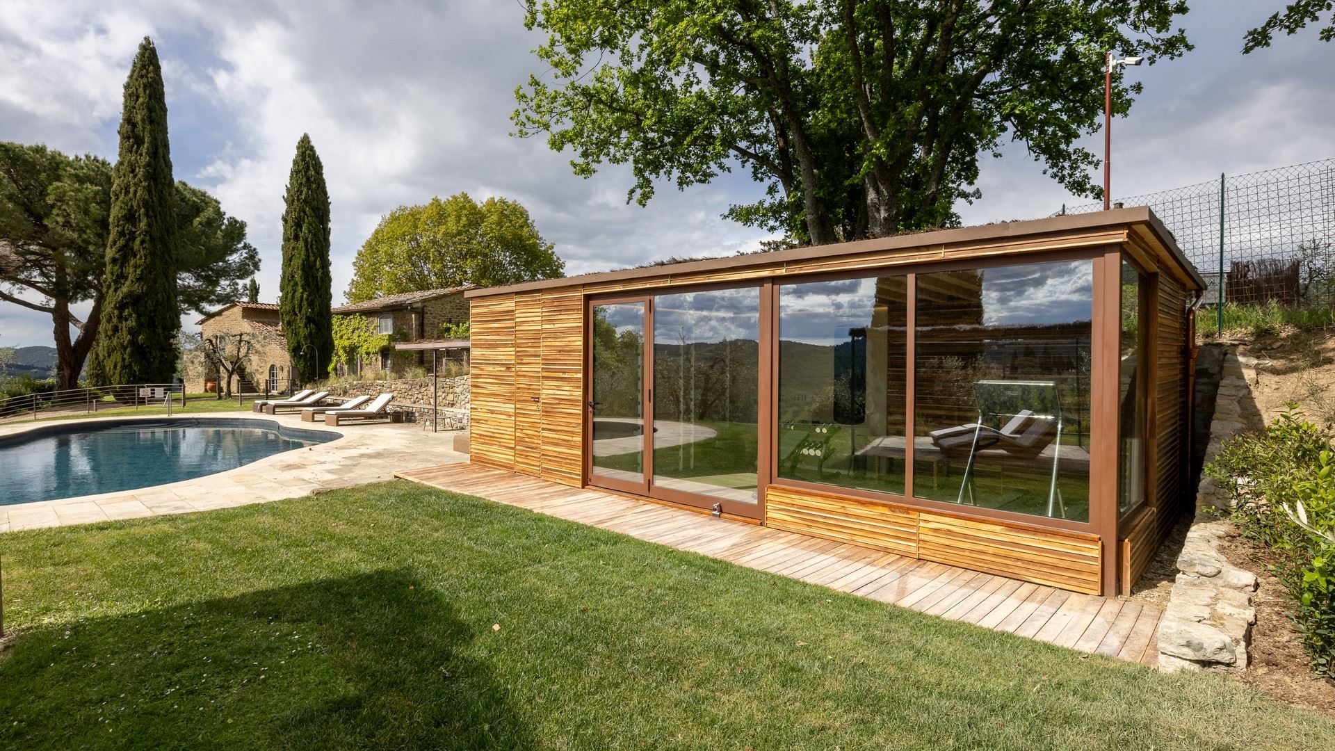 Naast de villa ligt een apart bijgebouw, de annex met een eigen zitkamer en een volledig ingerichte keuken. Plus een slaapkamer op de vide met een eigen badkamer. Daarnaast is er een tweede bijgebouw waar een fitnessruimte is gemaakt. Daarnaast is er het zwembad, onregelmatig van vorm, met rondom een zonneterras met de nodige ligbedden.