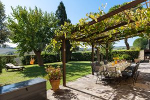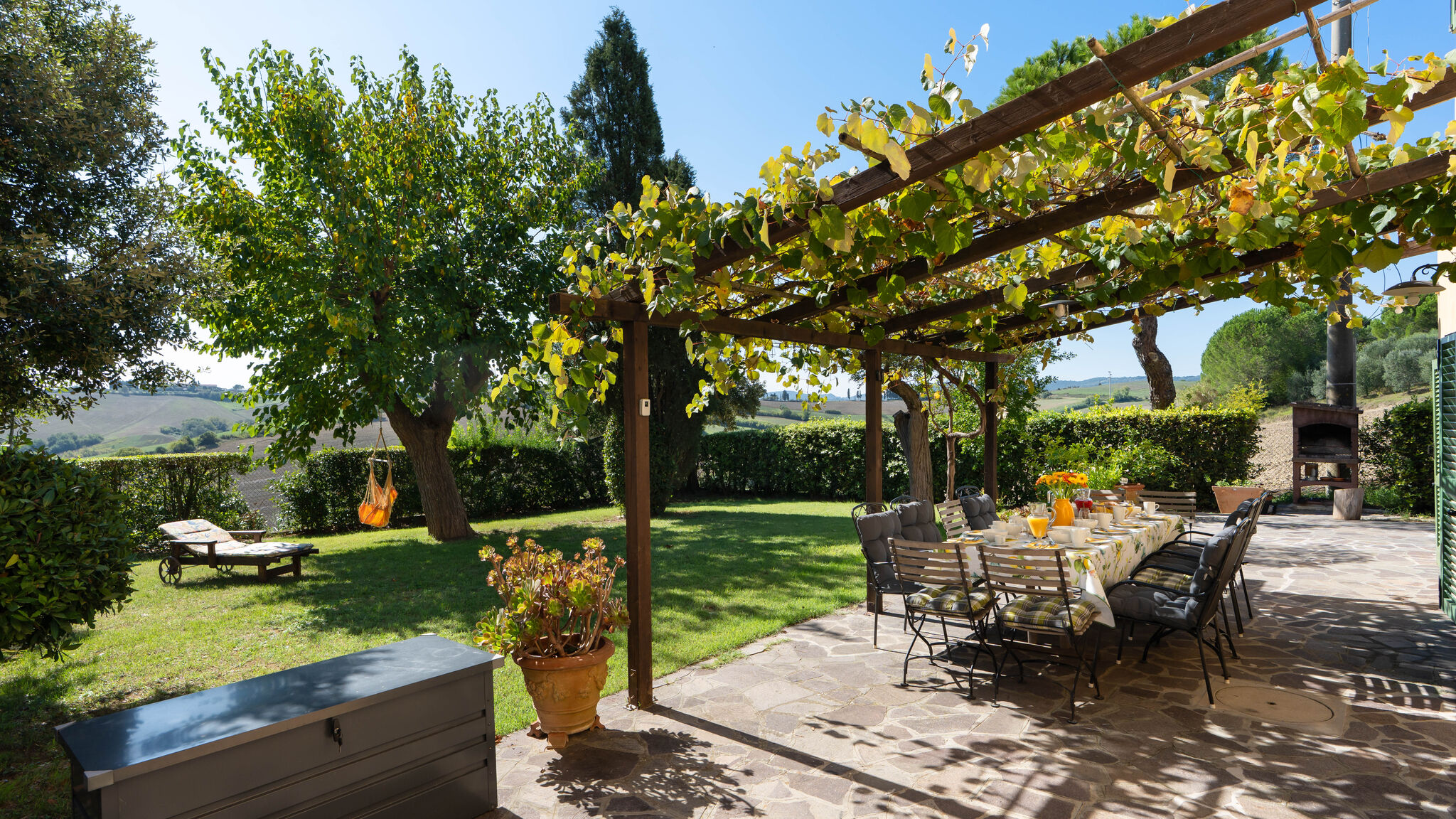 De tuin strekt zich uit over een terrein van circa 3000 m2 en is volledig omheind. Een oprit omzoomd met cipressen leidt naar de villa en de parkeerplaats. Het zwembad bevindt zich op een hoger niveau, op het gazon gedeelte dat langs de oprit, naast een rij olijfbomen ligt. Grenzend aan Unit 1 is een overdekt terras met een eethoek en een bakstenen barbecue. Een tweede gazebo met tafel, stoelen en een gasbarbecue ligt bij het woongedeelte van Unit 2.