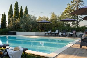 Het zwembad ligt op een hoger niveau dan de villa, en is toegankelijk via het gazon of een fraaie, stenen trappartij. Het omliggende solarium is deels geplaveid en deels gazon, en is uitgerust met ligbedden, parasols, kleine tafeltjes en een zithoek.