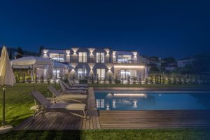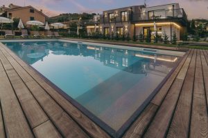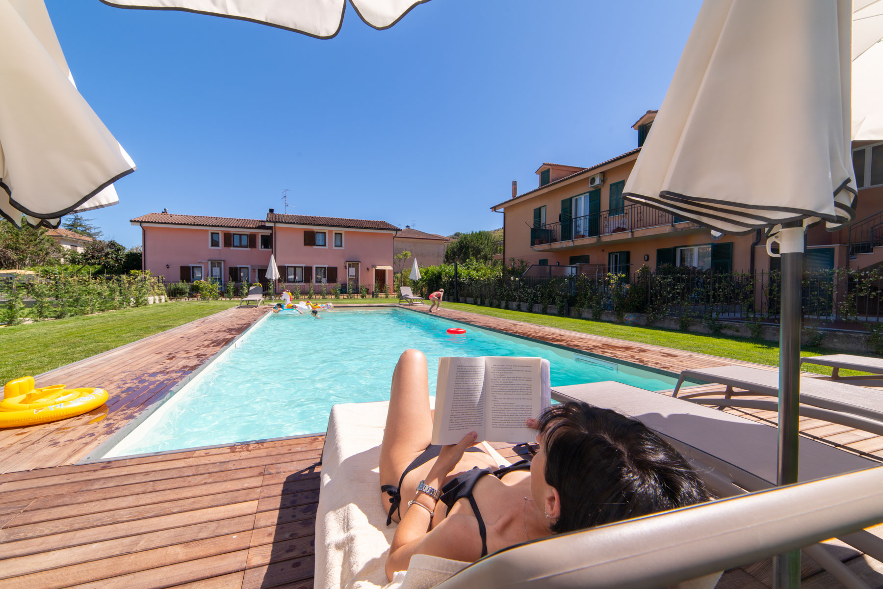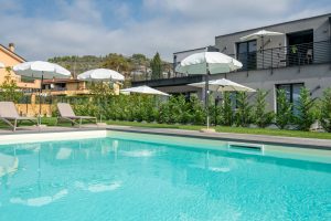 gedeeld zwembad met zonneterras met ligbedden en parasols